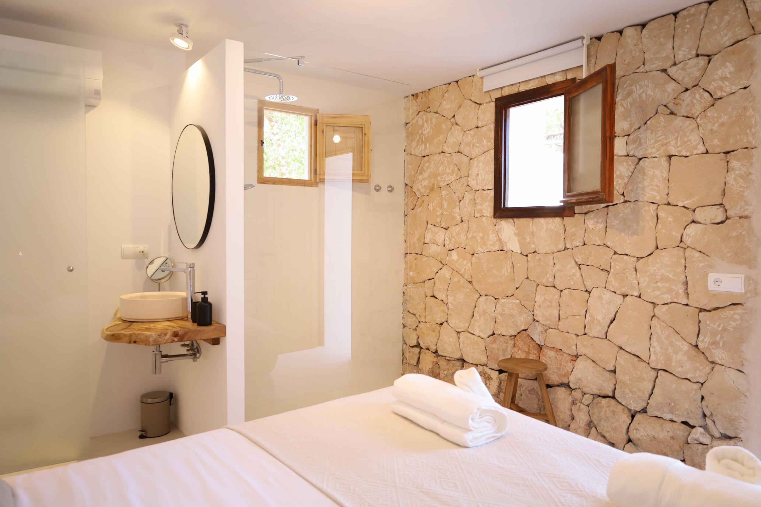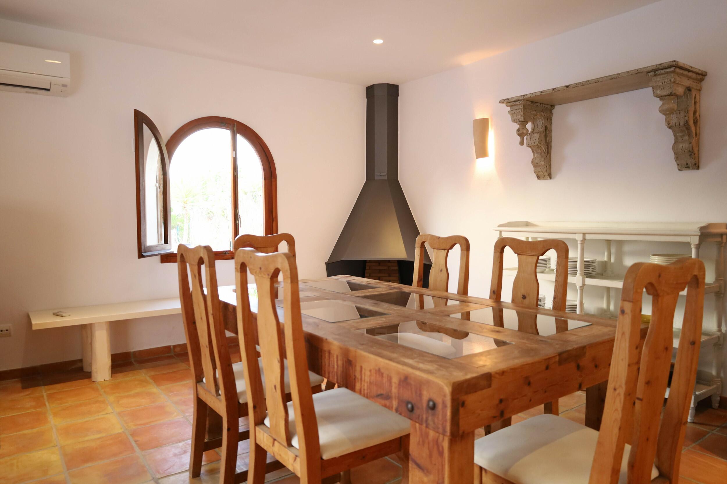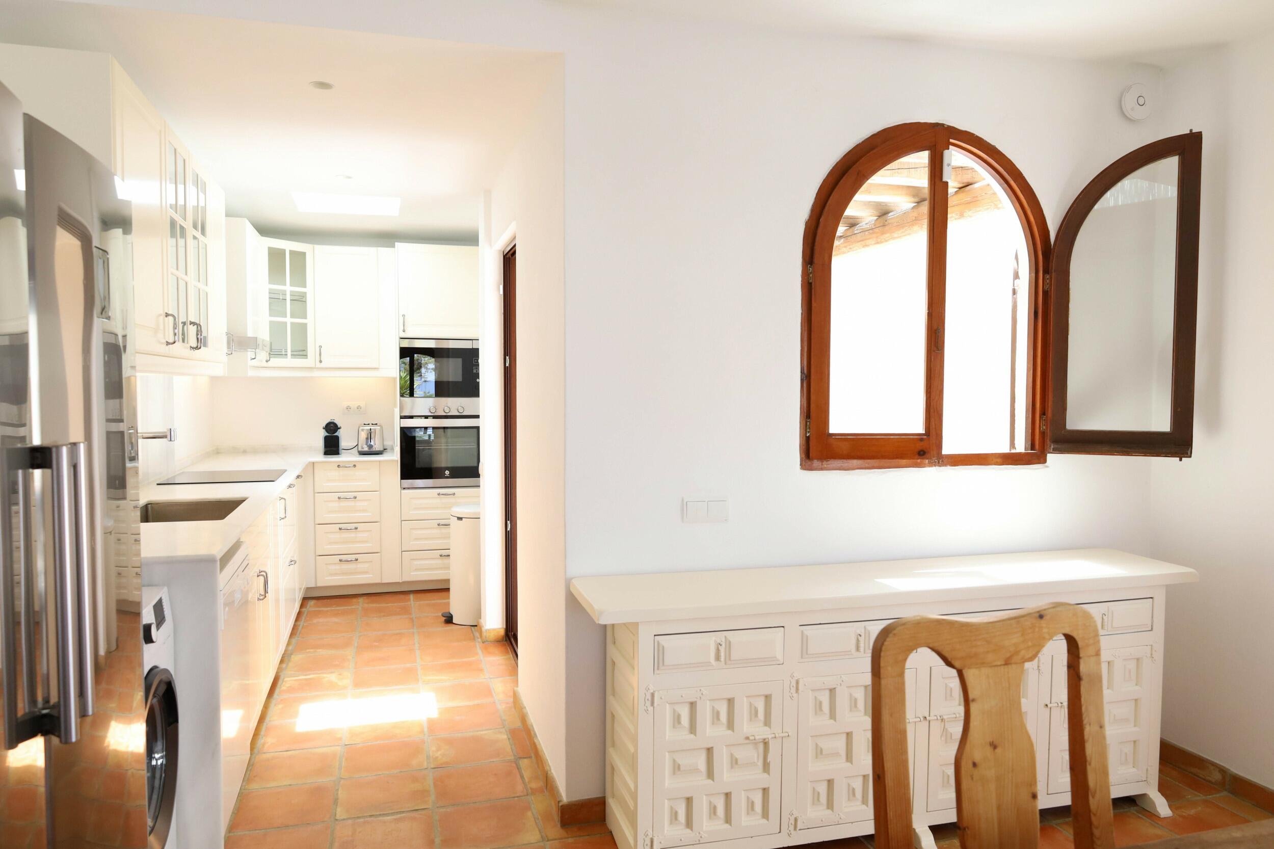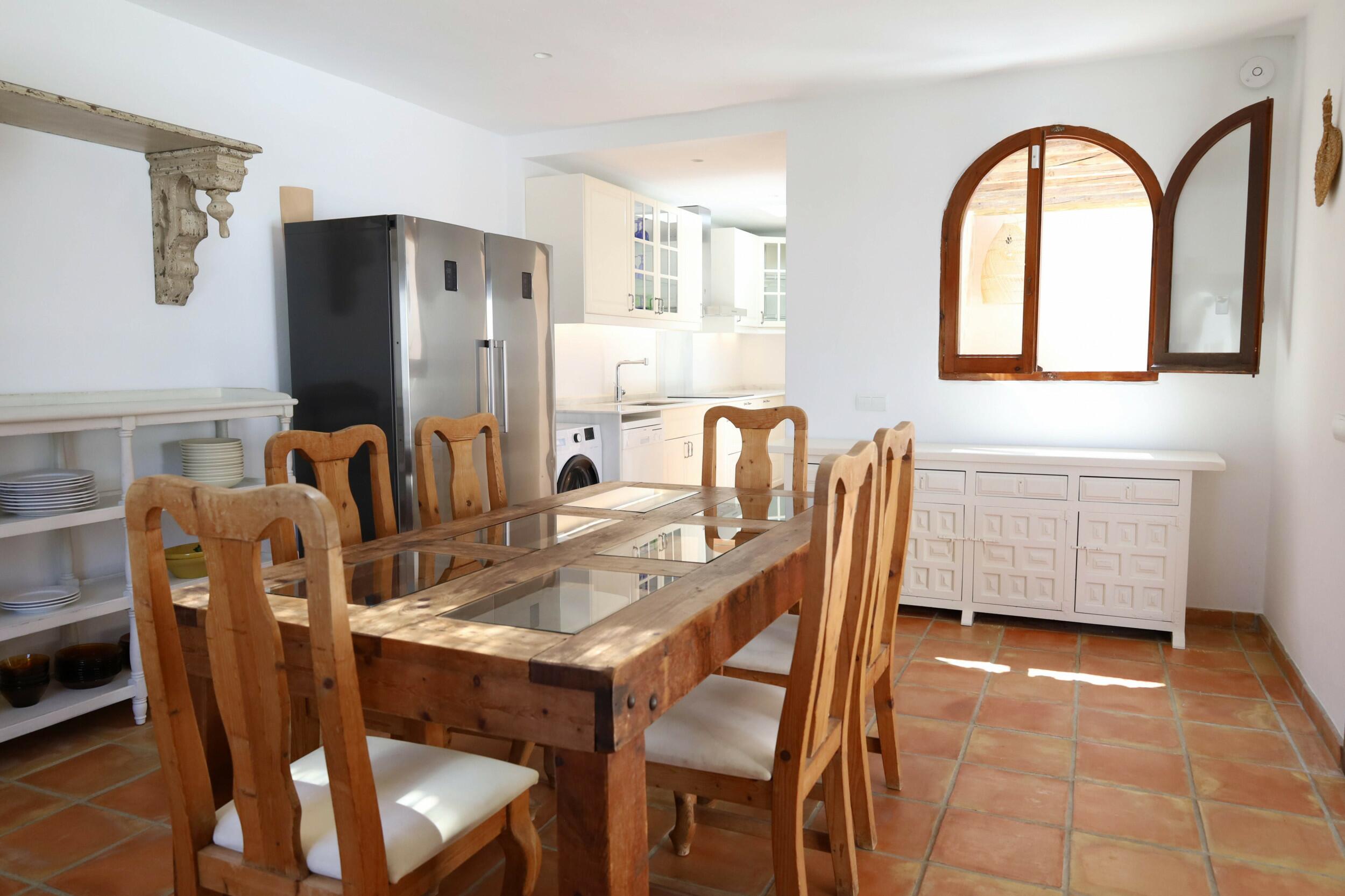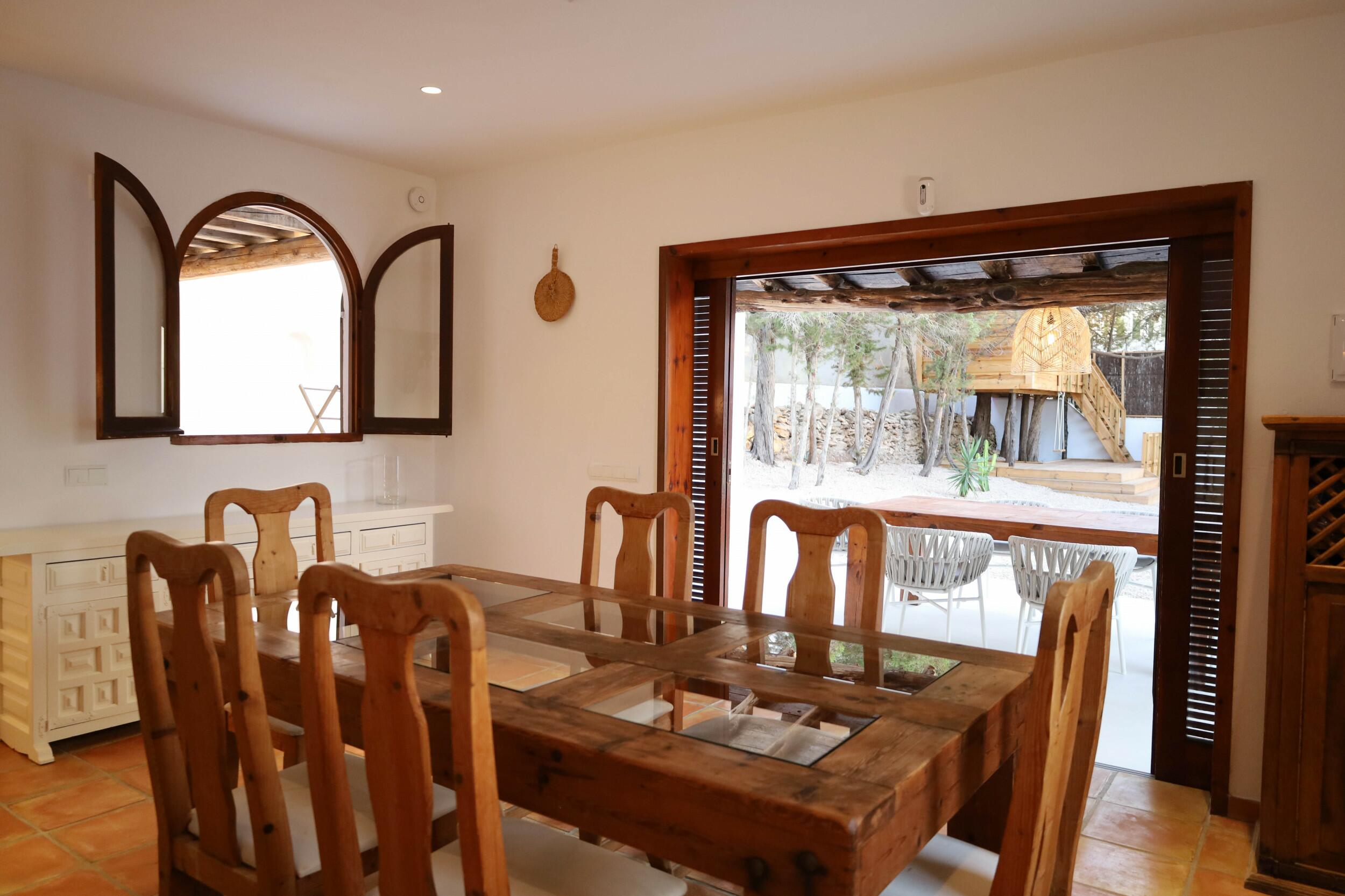 Can Tenare combina el encanto ibicenco con suelos de terracota, madera natural e interiores luminosos. La planta abierta conecta el acogedor salón, el comedor y la cocina completamente equipada con vistas al jardín. Grandes ventanales llenan los espacios de luz y enmarcan la vegetación exterior, creando un ambiente cómodo, relajado y perfecto para familias.