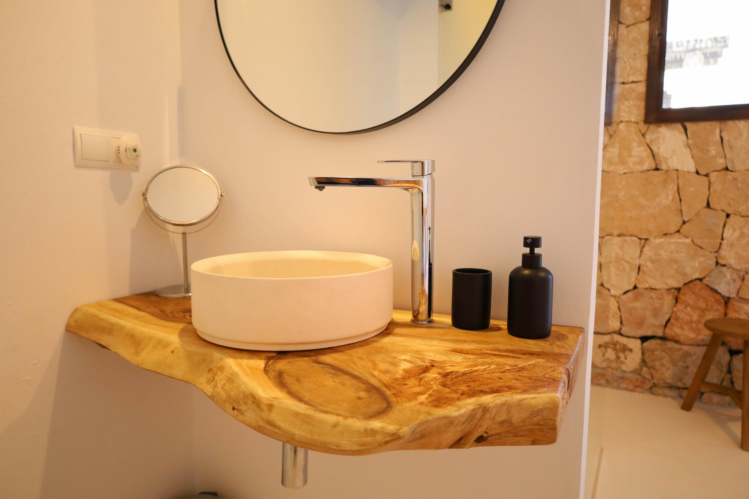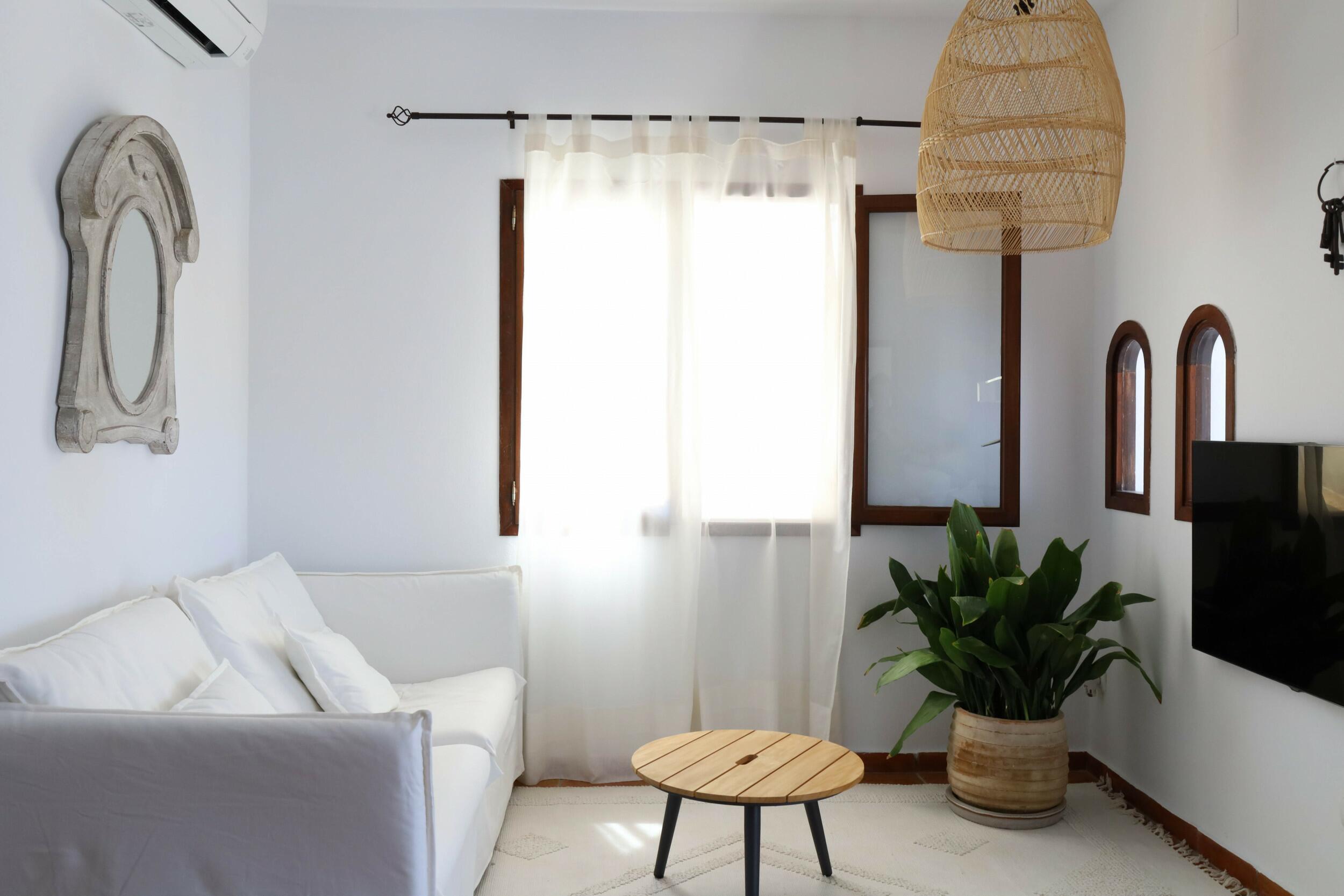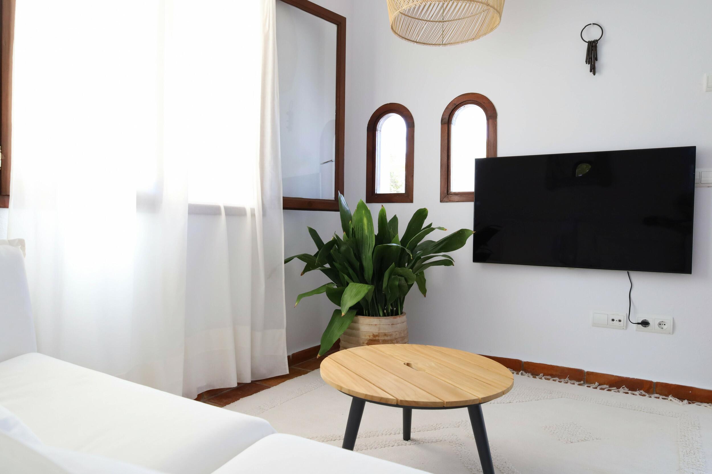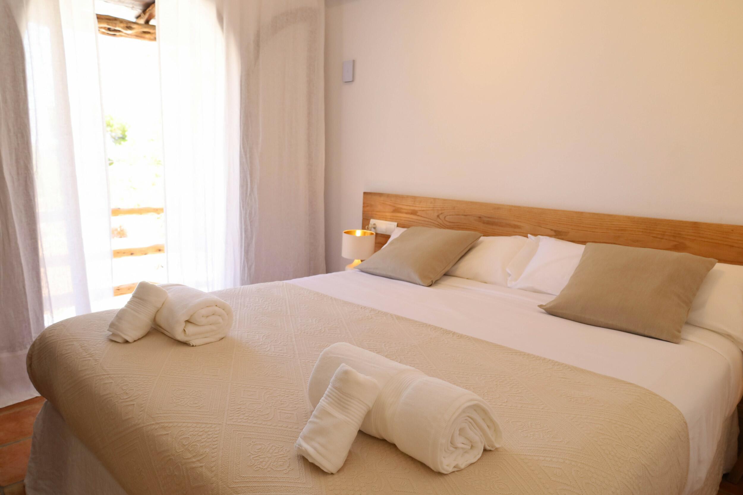 Can Tenare combina el encanto ibicenco con suelos de terracota, madera natural e interiores luminosos. La planta abierta conecta el acogedor salón, el comedor y la cocina completamente equipada con vistas al jardín. Grandes ventanales llenan los espacios de luz y enmarcan la vegetación exterior, creando un ambiente cómodo, relajado y perfecto para familias.