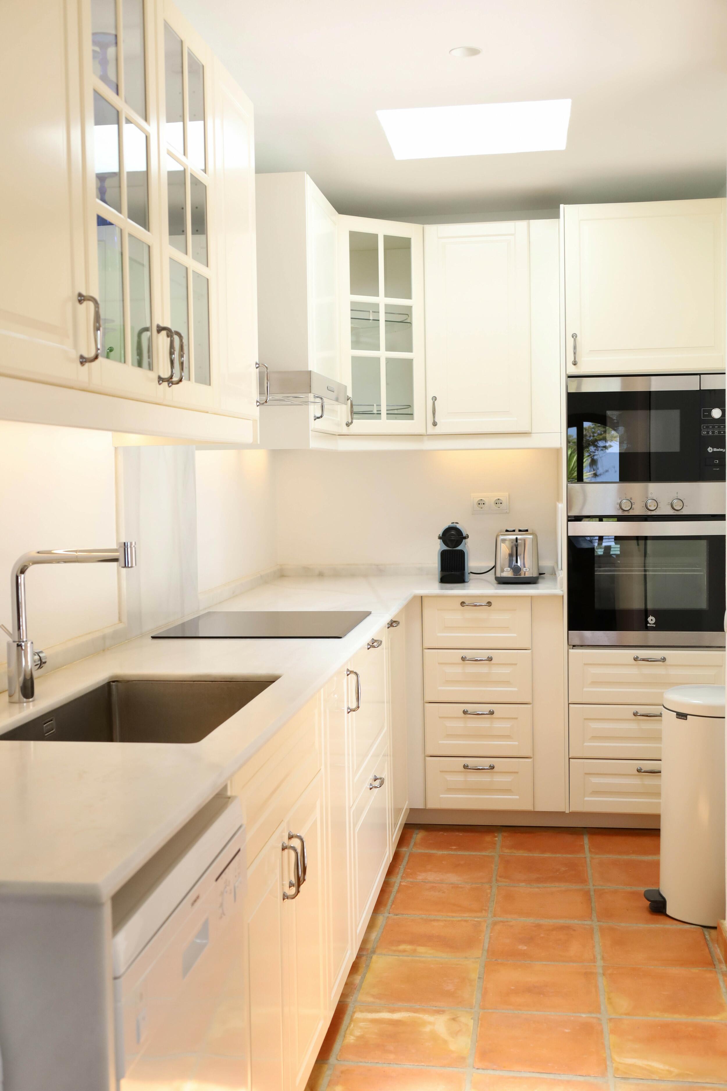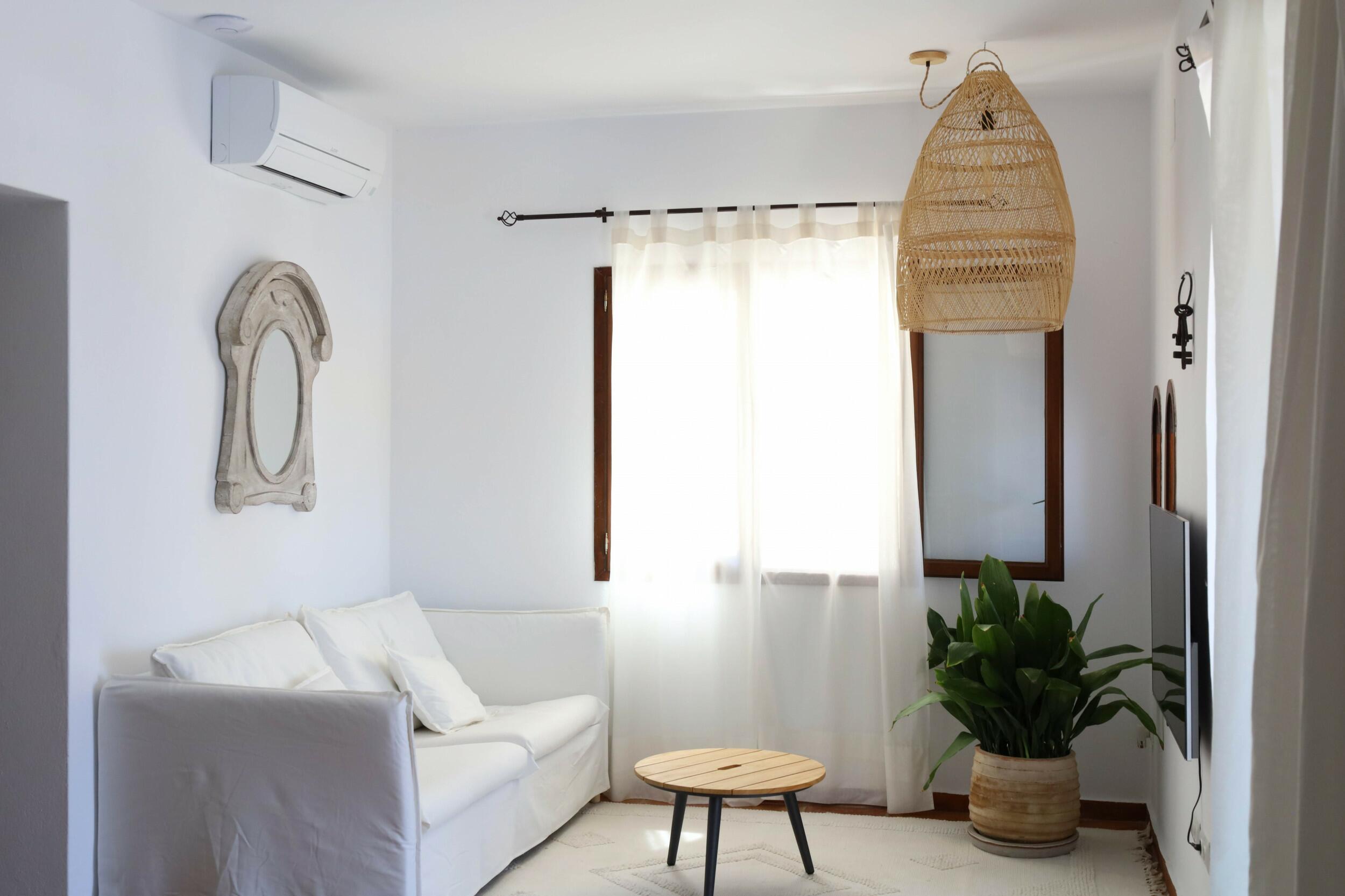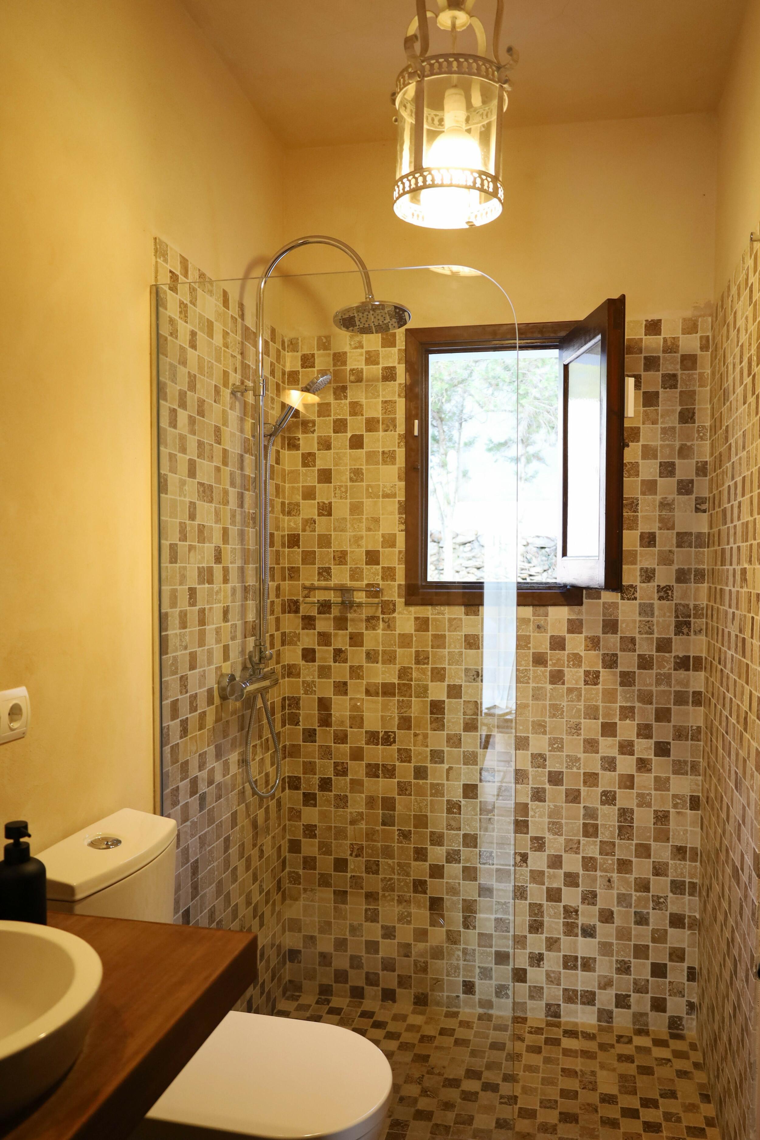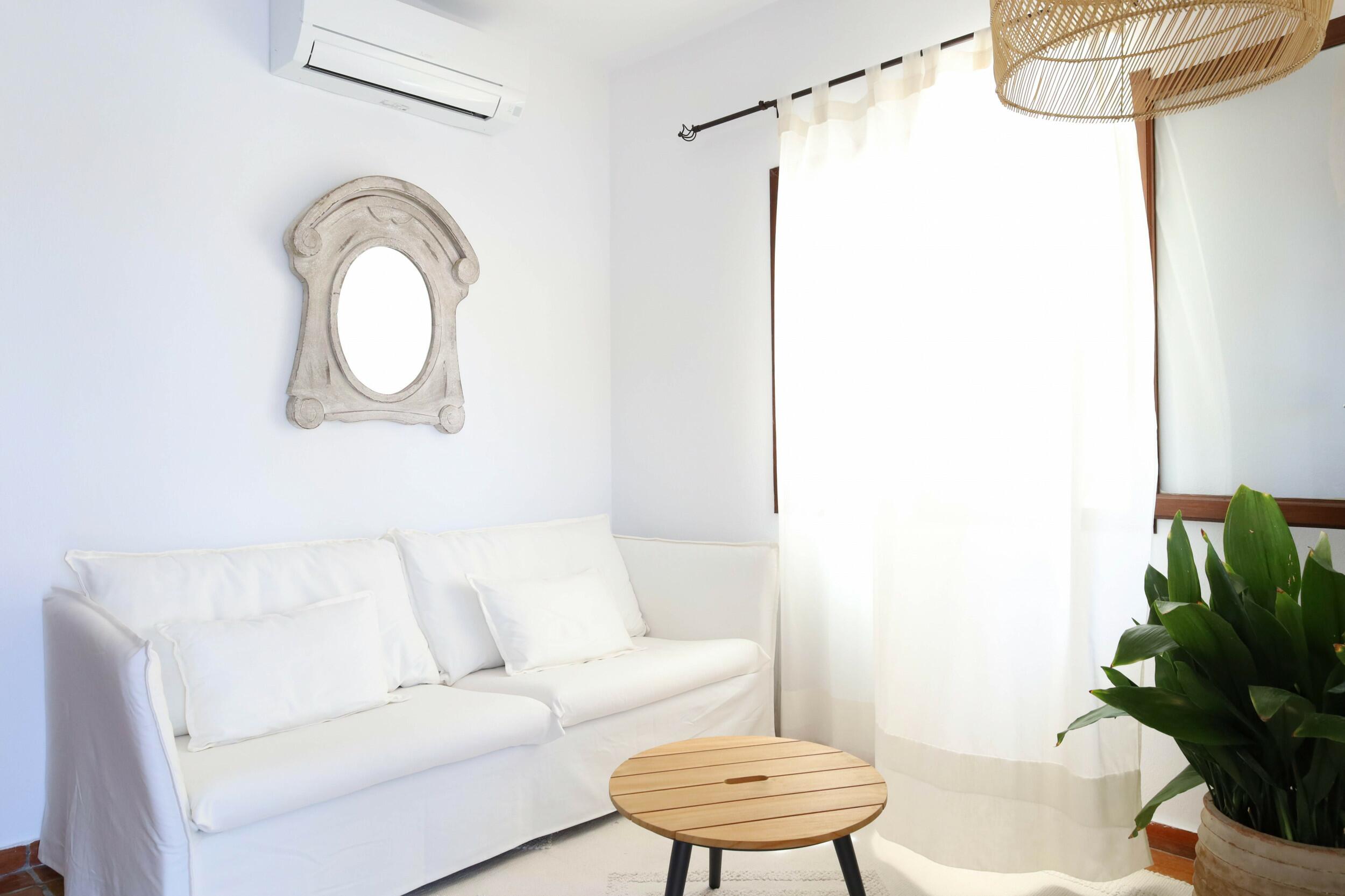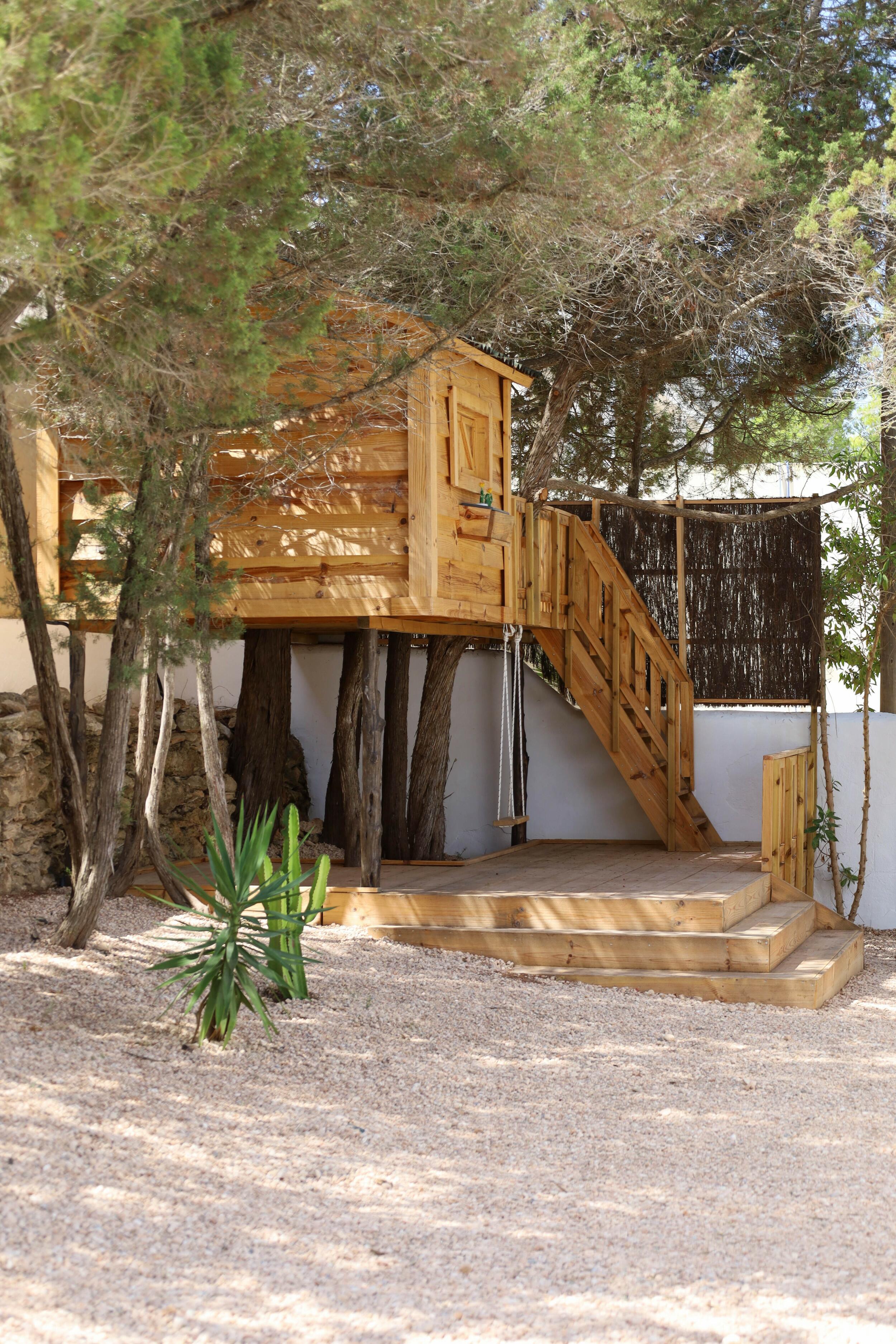 Can Tenare combina el encanto ibicenco con suelos de terracota, madera natural e interiores luminosos. La planta abierta conecta el acogedor salón, el comedor y la cocina completamente equipada con vistas al jardín. Grandes ventanales llenan los espacios de luz y enmarcan la vegetación exterior, creando un ambiente cómodo, relajado y perfecto para familias.