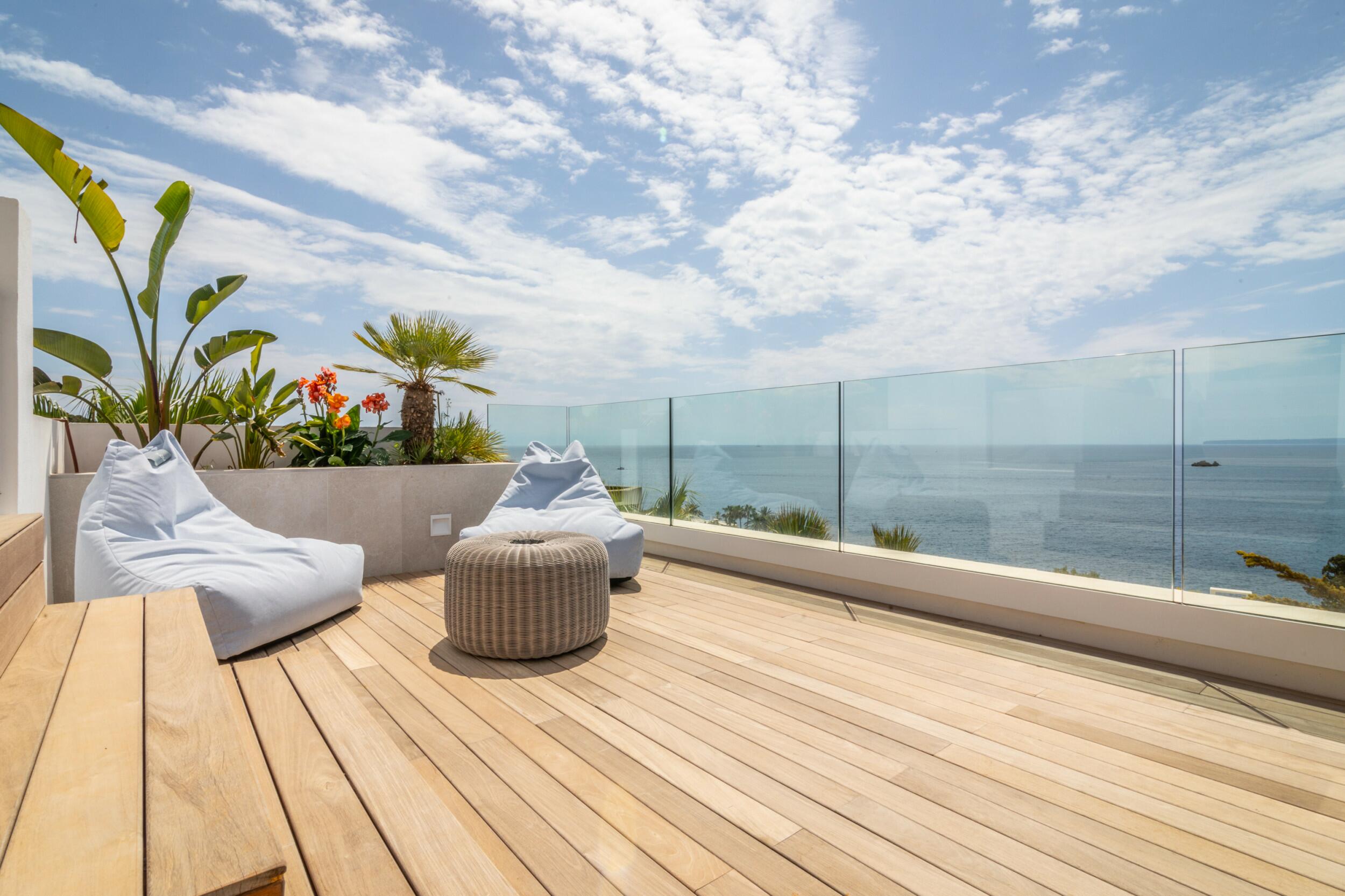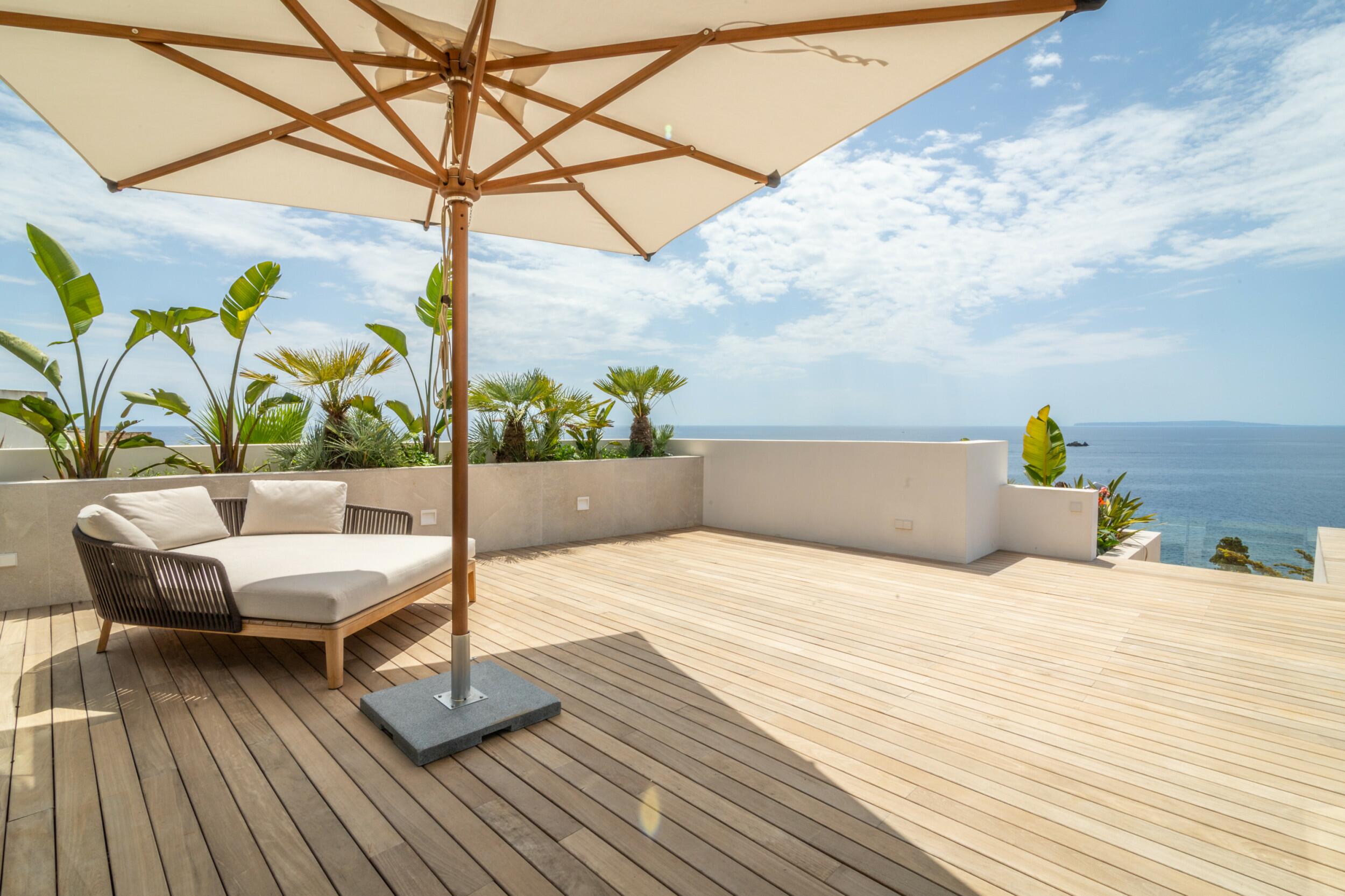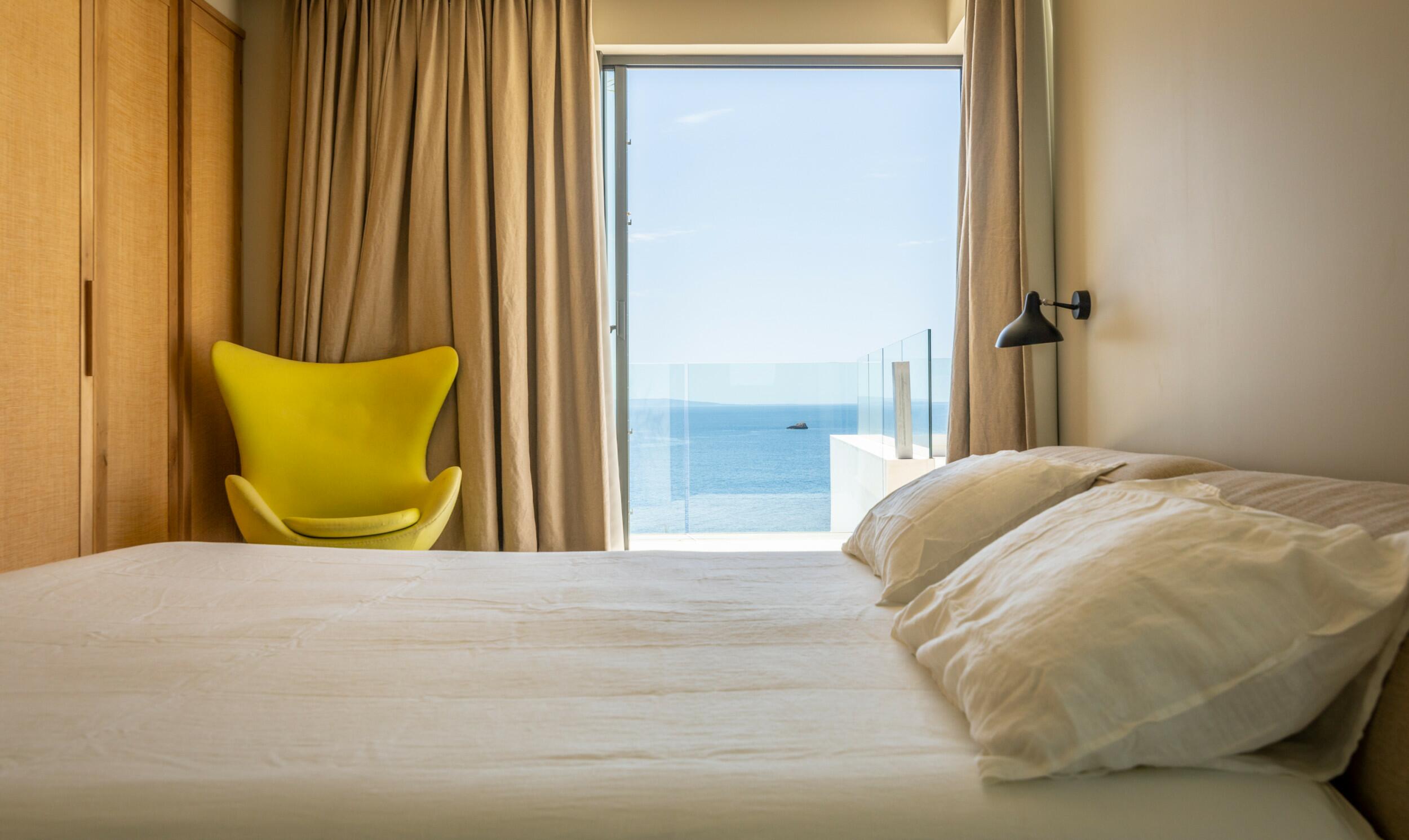 Ubicación exclusiva en la azotea, con total privacidad y vistas al mar que alcanzan Formentera. Dispone de gran terraza privada con tumbonas, acceso directo a la piscina, cama doble, baño con ducha, aire acondicionado, TV, WiFi y minibar.