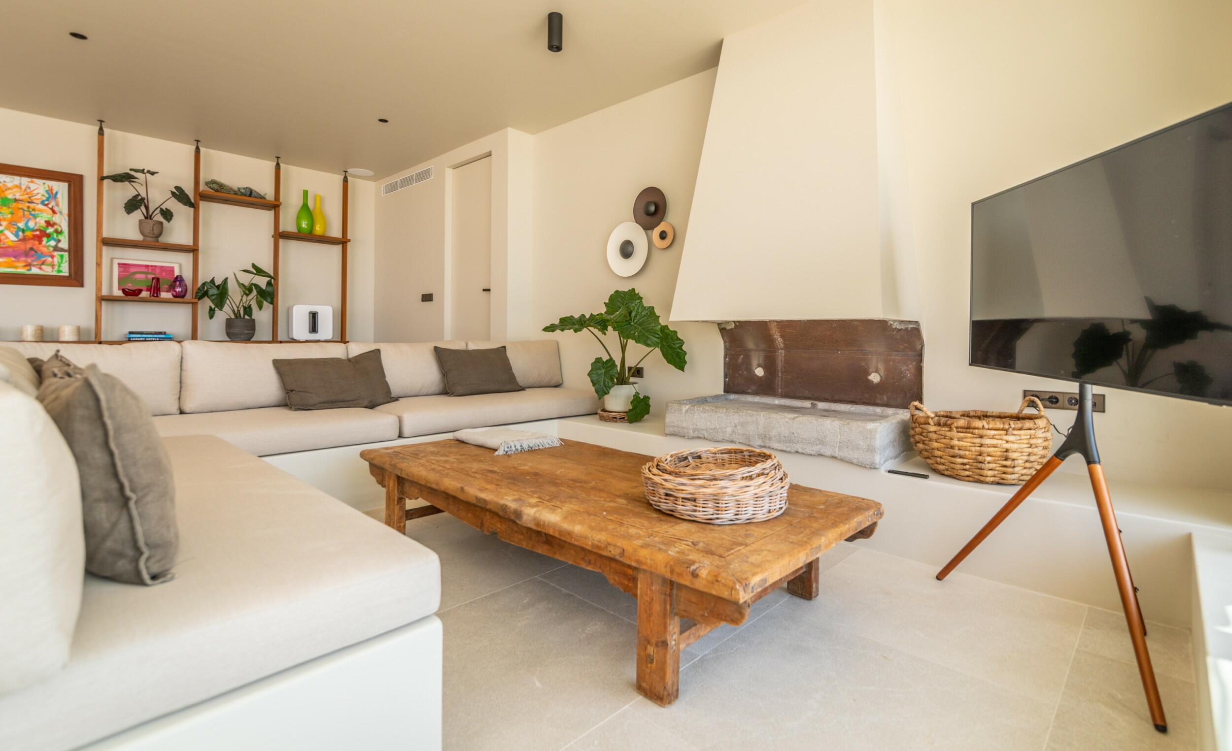 Los interiores son luminosos y acogedores, caracterizados por paredes encaladas, techos con vigas de sabina y materiales naturales. Las zonas de estar ofrecen un ambiente relajado, con televisores, iluminación ambiental y amplios sofás. La casa principal también cuenta con una cocina totalmente equipada y un comedor, ideal para alojar grupos numerosos.