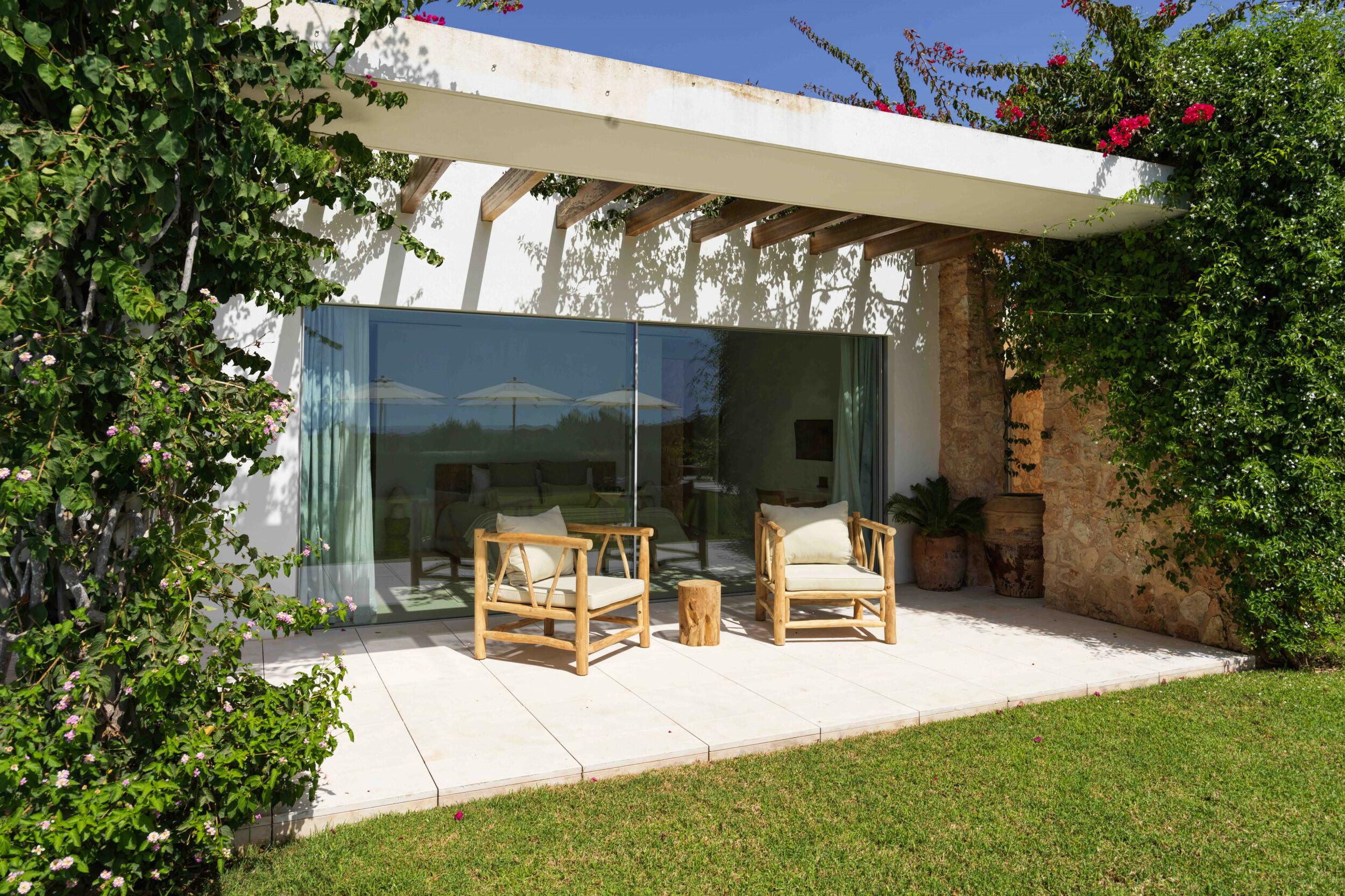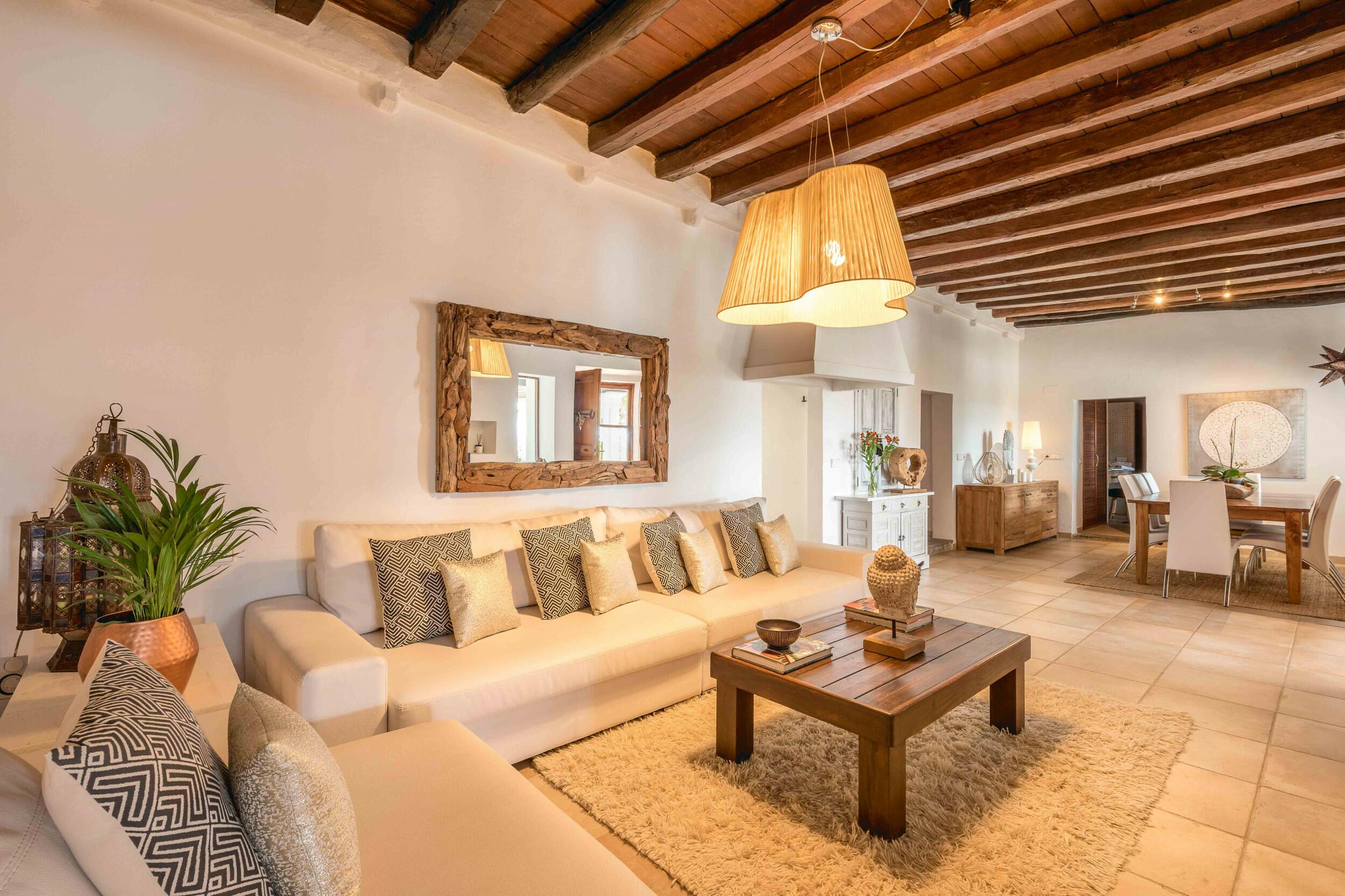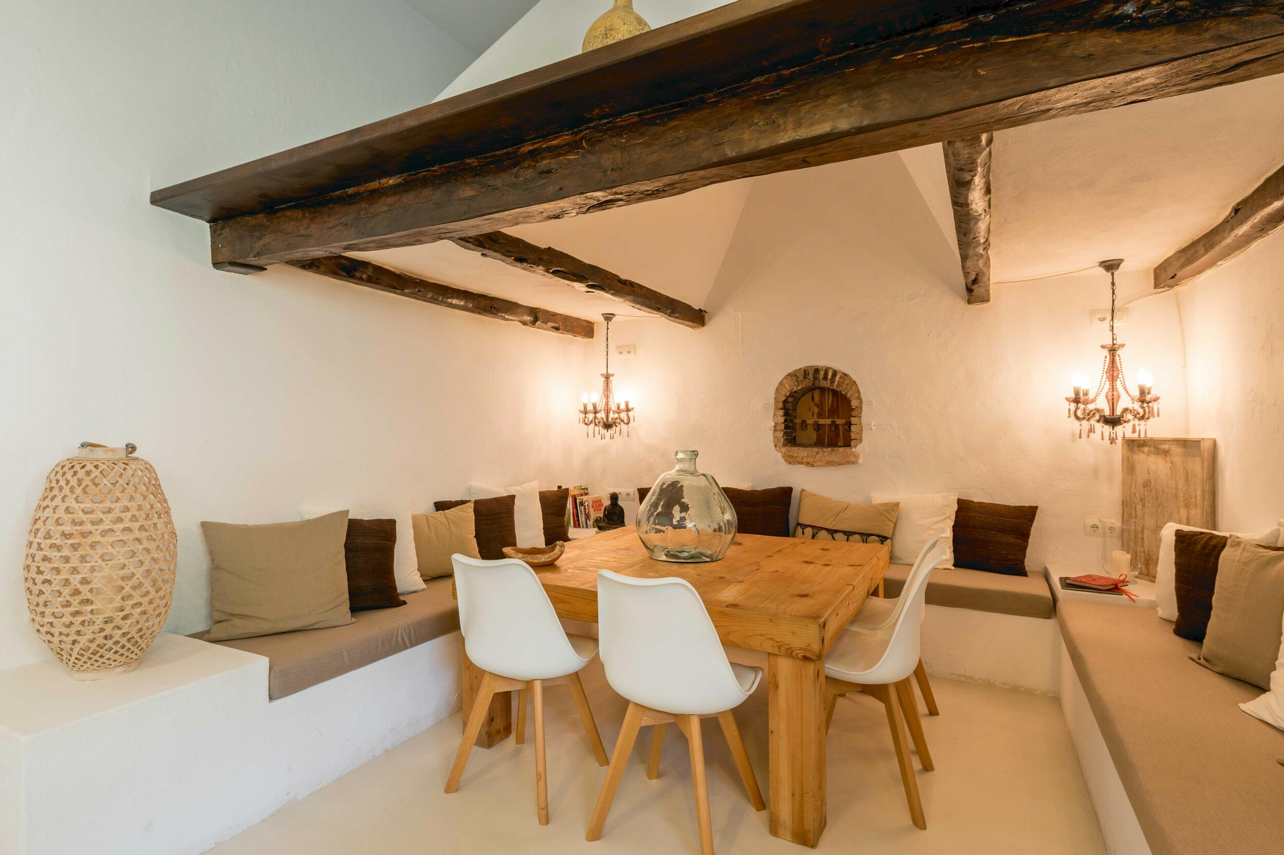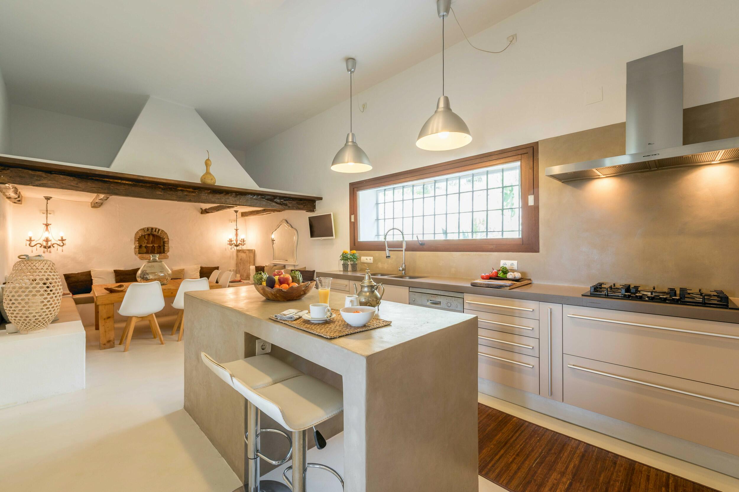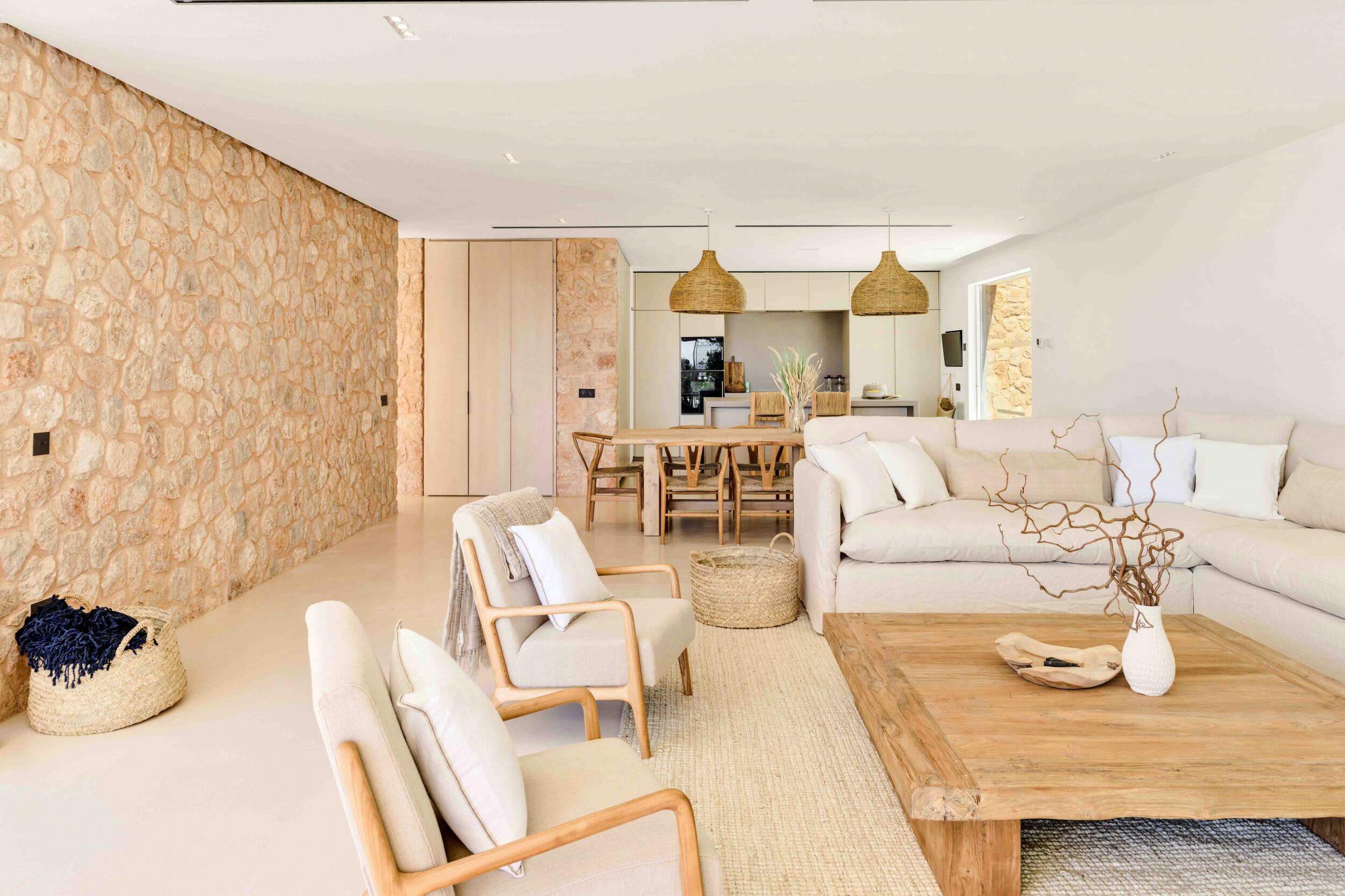 Casa Fontana combina el carácter ibicenco atemporal con el confort contemporáneo: muros de piedra natural y suelos de terracota se combinan con amplios ventanales para inundar los espacios de vida con luz mediterránea. Una cocina de planta abierta, totalmente equipada, fluye hacia el comedor y hacia las terrazas orientadas al sur y al oeste, creando un ritmo fácil y acogedor de la mañana a la noche. Las habitaciones y la sala de estar principal cuentan con aire acondicionado, con detalles pensados como cortinas opacas, Smart TV, Wi-Fi y un cuarto de lavandería con frigorífico adicional.