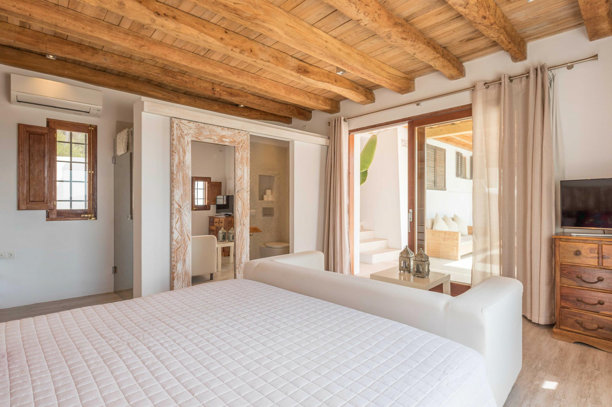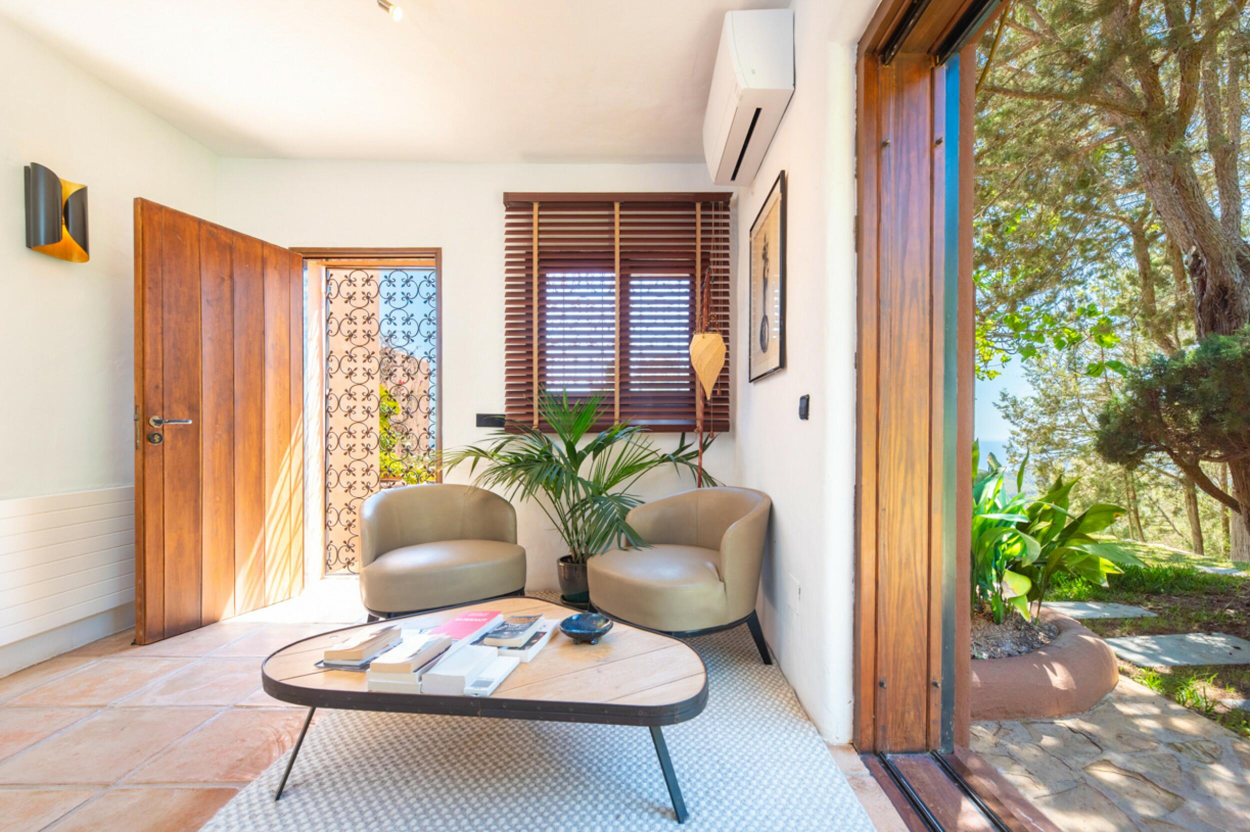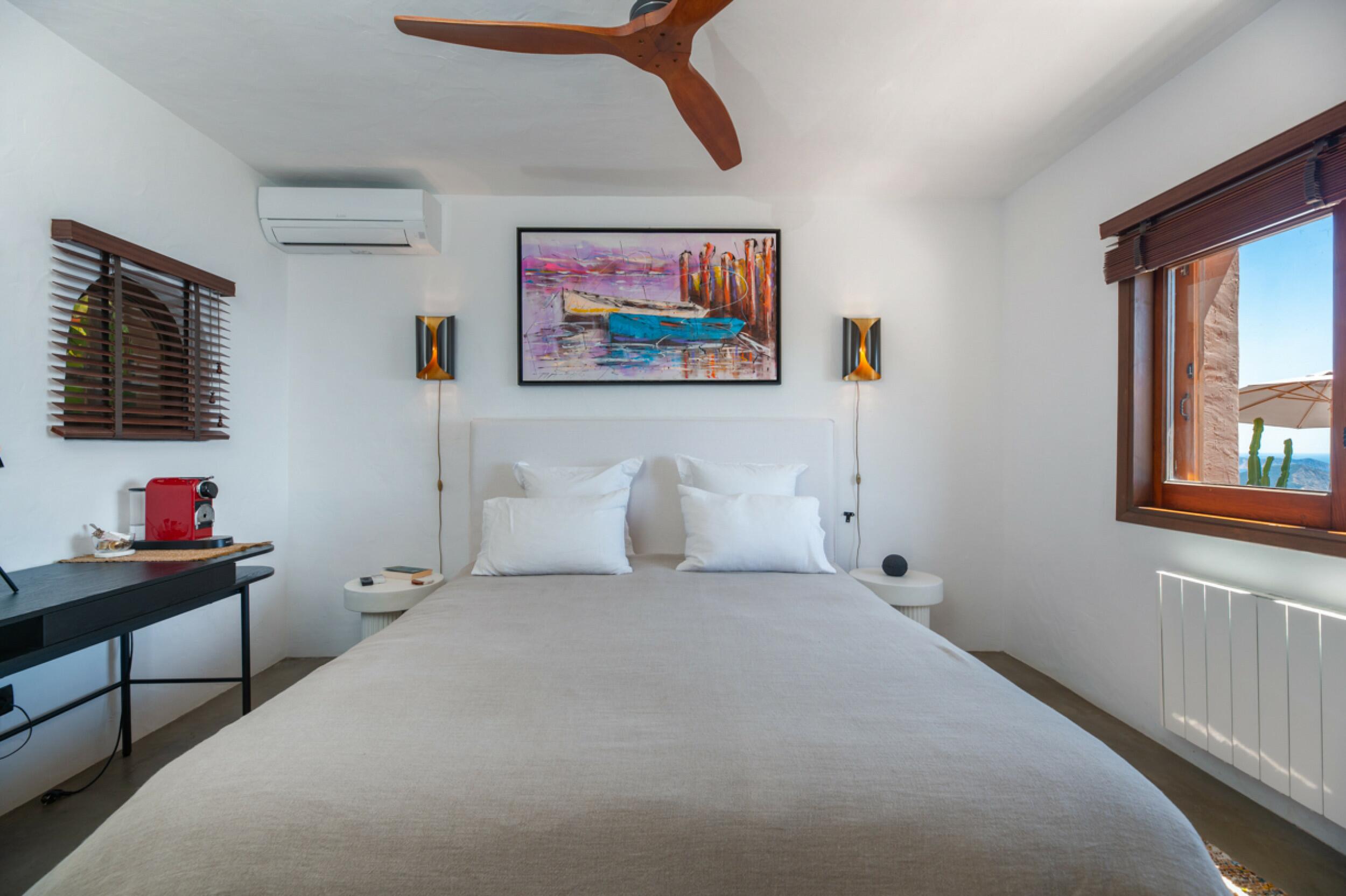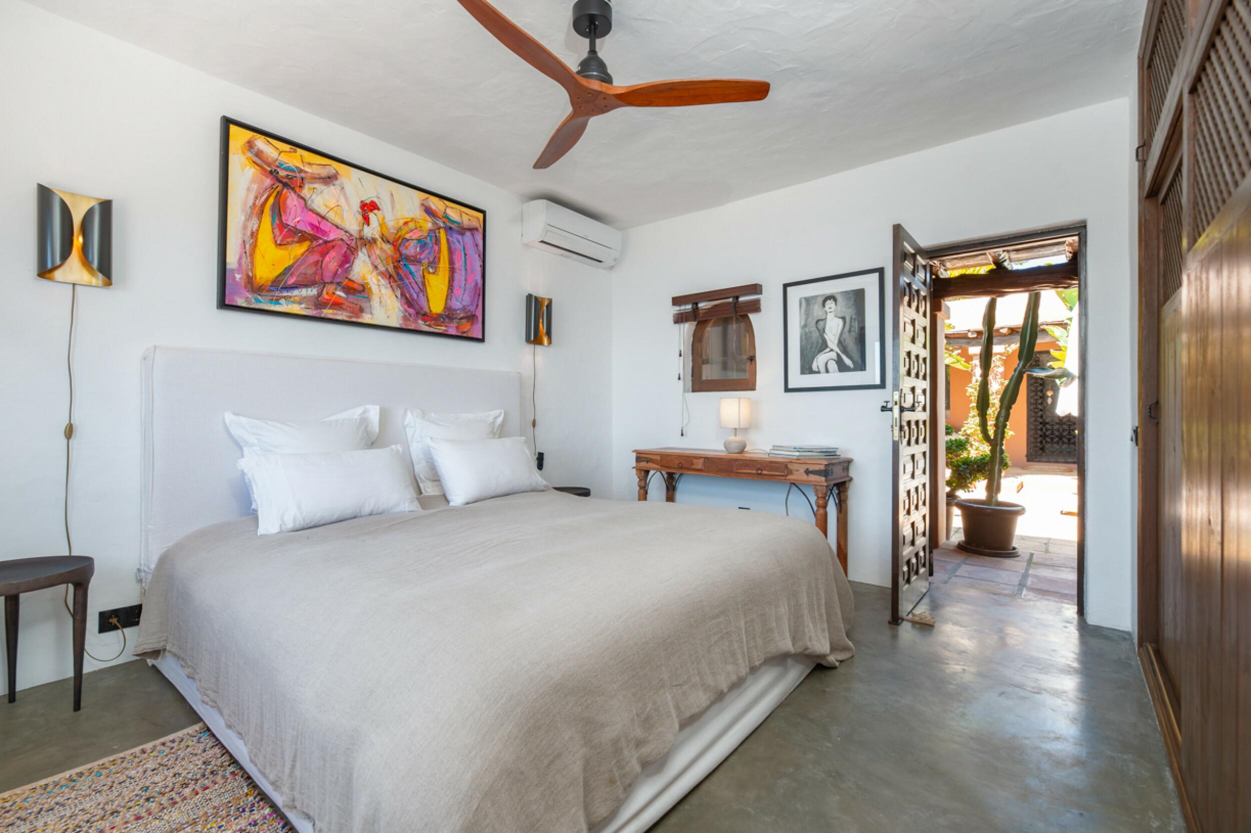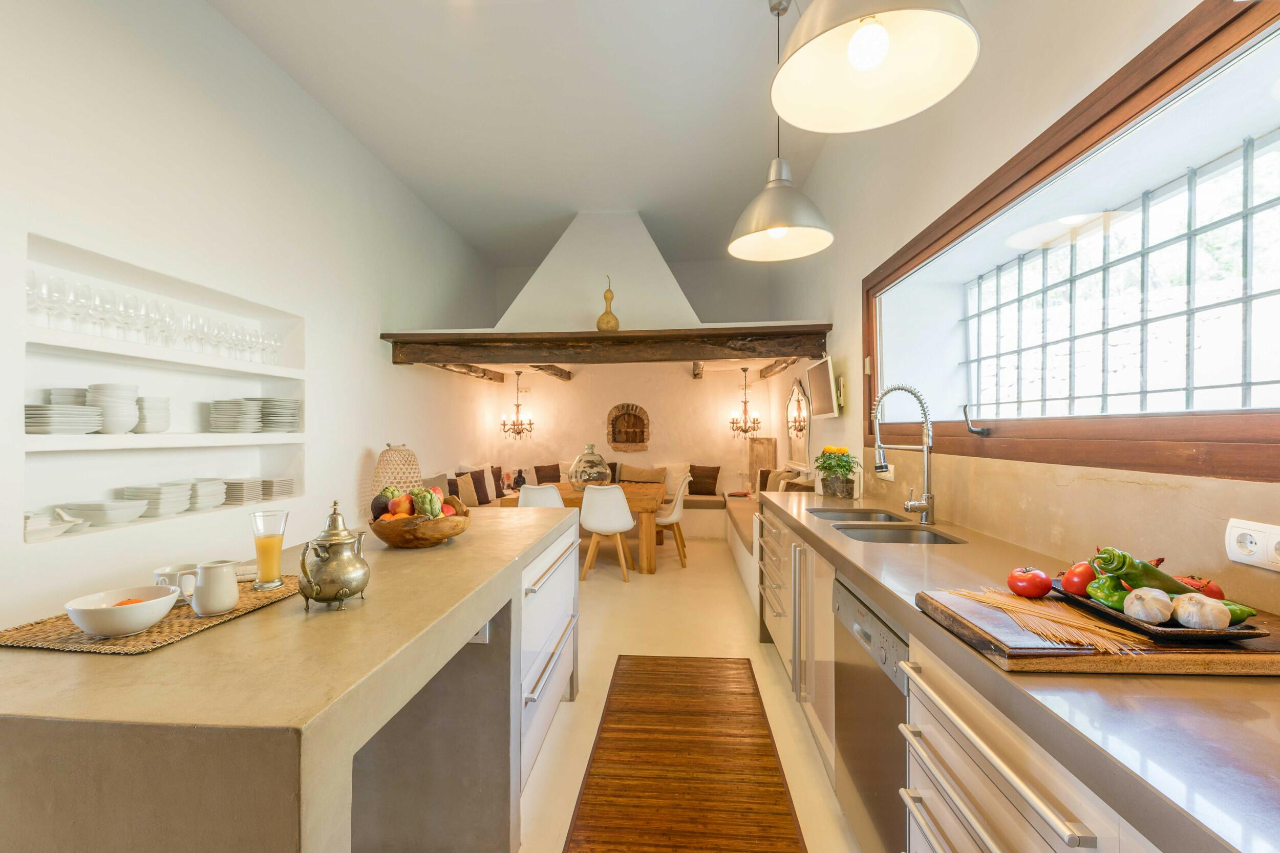 Casa Fontana combina el carácter ibicenco atemporal con el confort contemporáneo: muros de piedra natural y suelos de terracota se combinan con amplios ventanales para inundar los espacios de vida con luz mediterránea. Una cocina de planta abierta, totalmente equipada, fluye hacia el comedor y hacia las terrazas orientadas al sur y al oeste, creando un ritmo fácil y acogedor de la mañana a la noche. Las habitaciones y la sala de estar principal cuentan con aire acondicionado, con detalles pensados como cortinas opacas, Smart TV, Wi-Fi y un cuarto de lavandería con frigorífico adicional.
