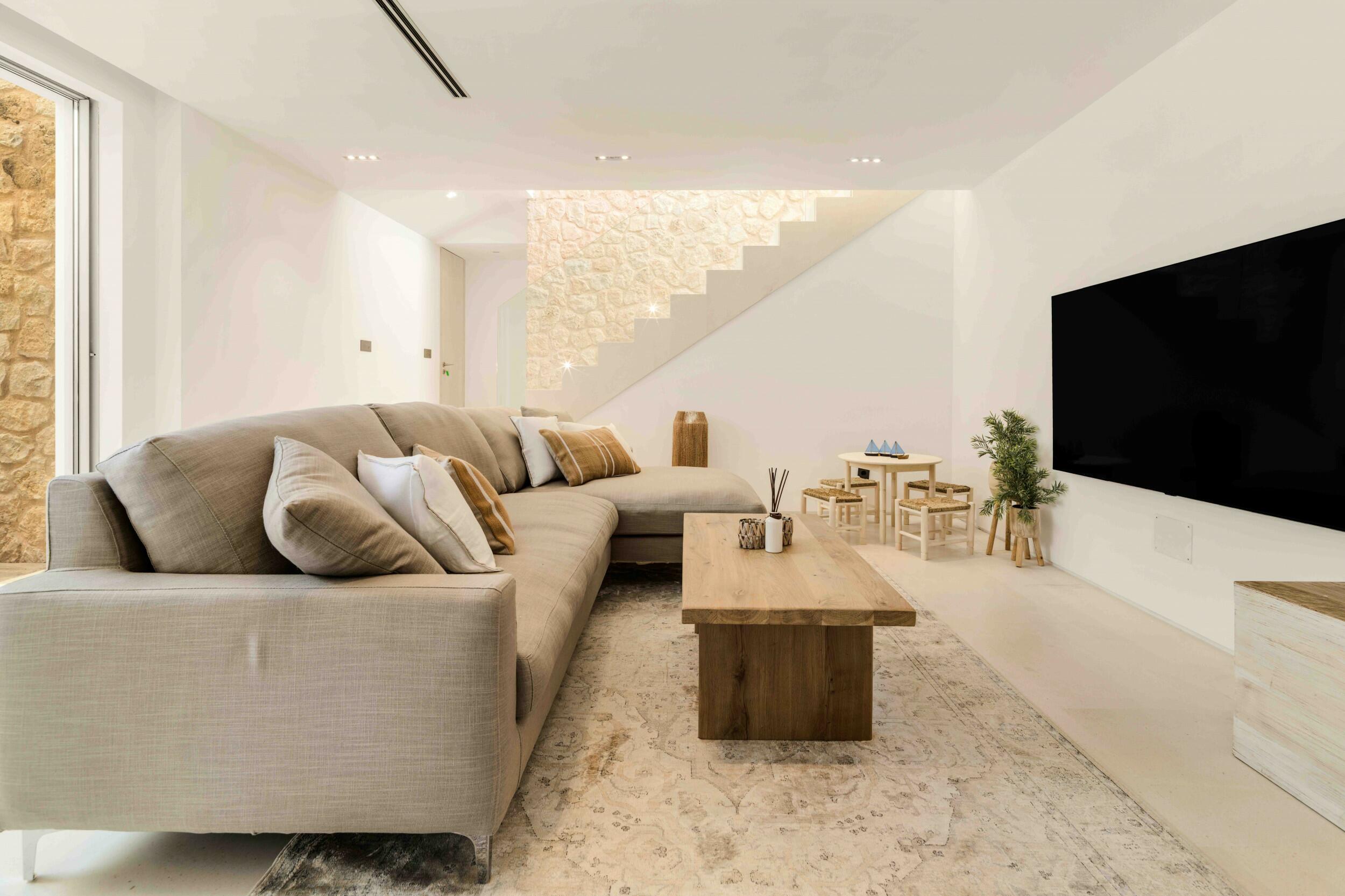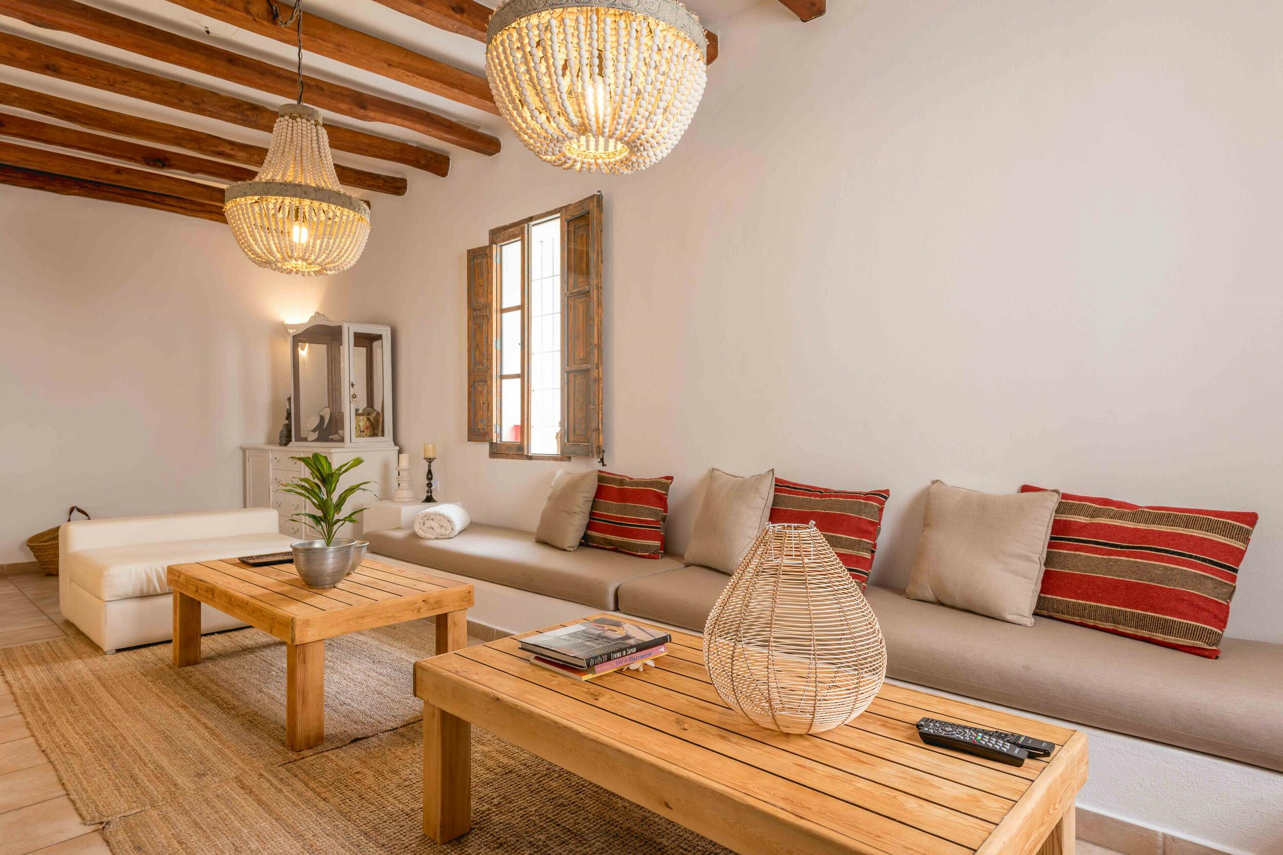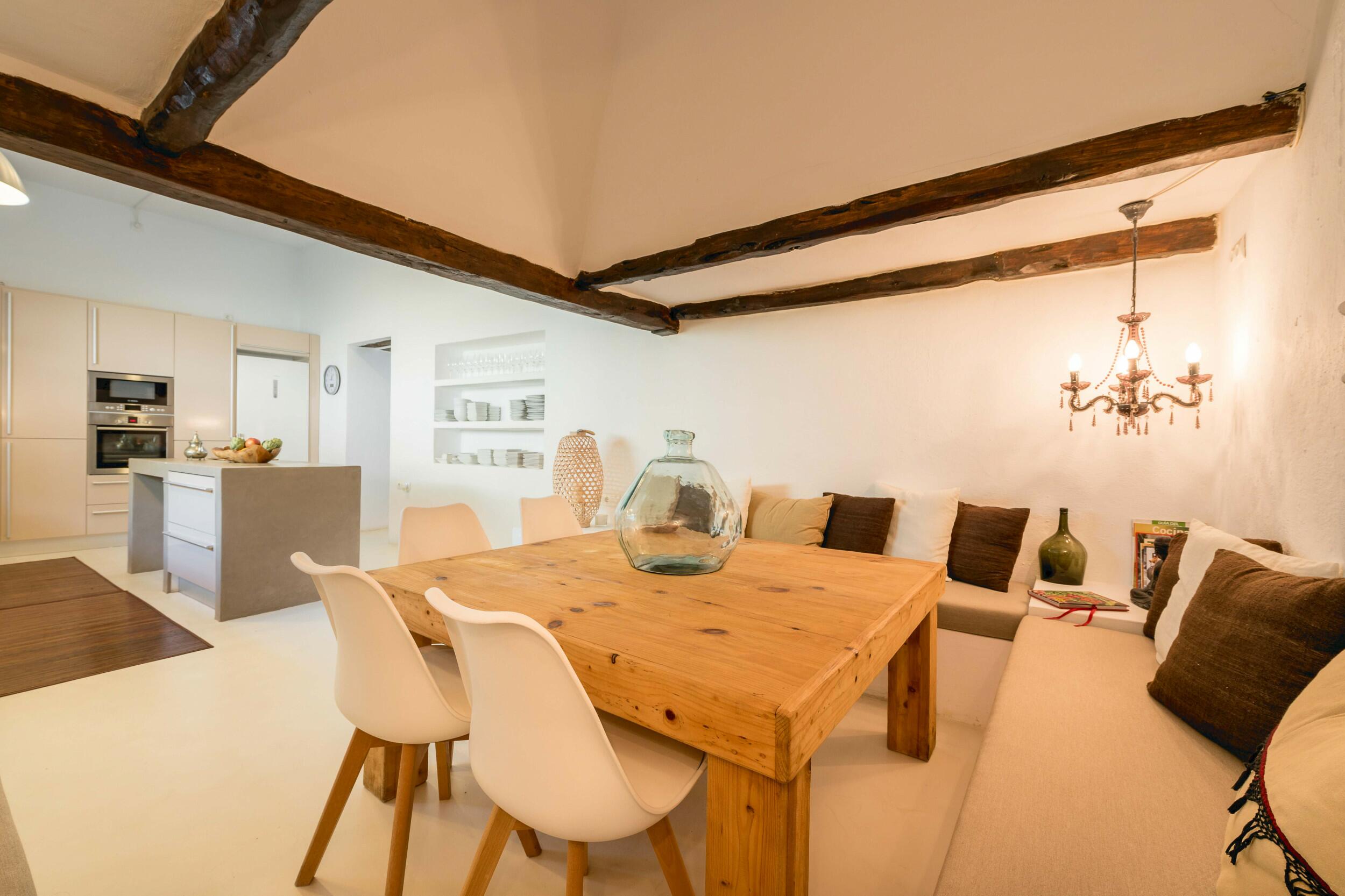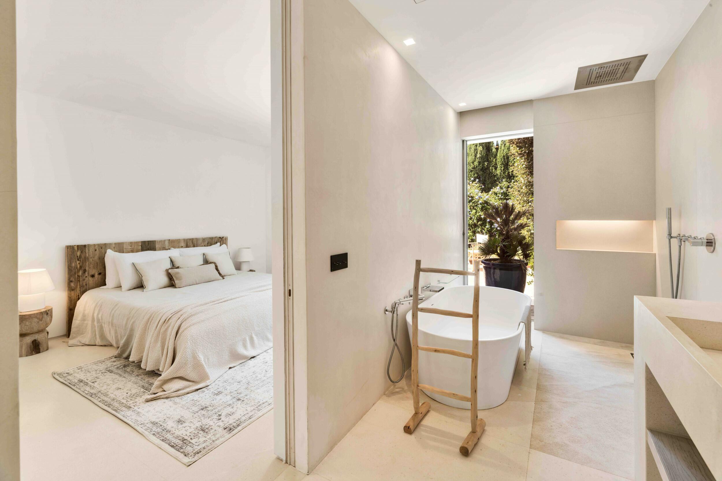 Casa Fontana combina el carácter ibicenco atemporal con el confort contemporáneo: muros de piedra natural y suelos de terracota se combinan con amplios ventanales para inundar los espacios de vida con luz mediterránea. Una cocina de planta abierta, totalmente equipada, fluye hacia el comedor y hacia las terrazas orientadas al sur y al oeste, creando un ritmo fácil y acogedor de la mañana a la noche. Las habitaciones y la sala de estar principal cuentan con aire acondicionado, con detalles pensados como cortinas opacas, Smart TV, Wi-Fi y un cuarto de lavandería con frigorífico adicional.