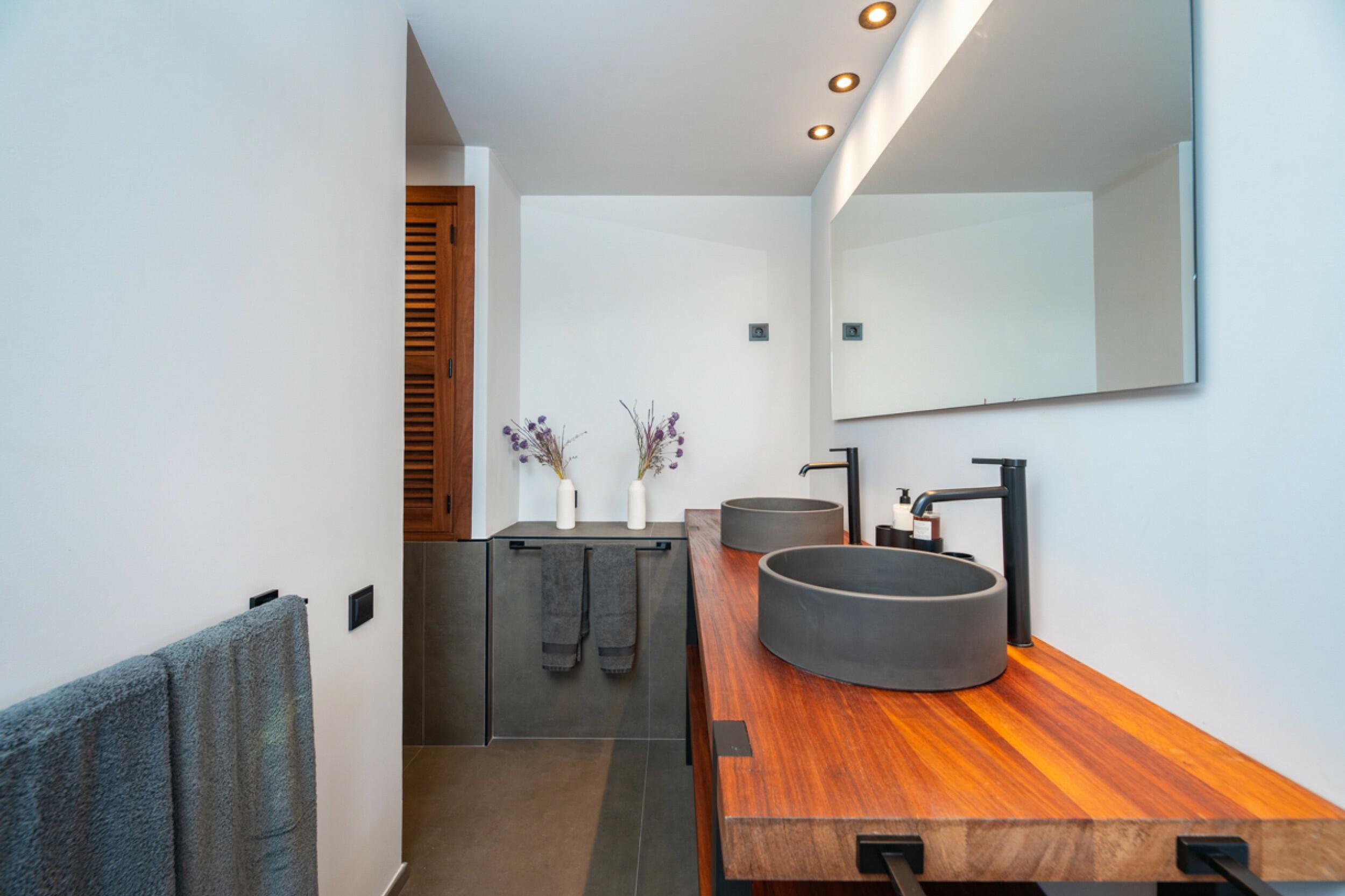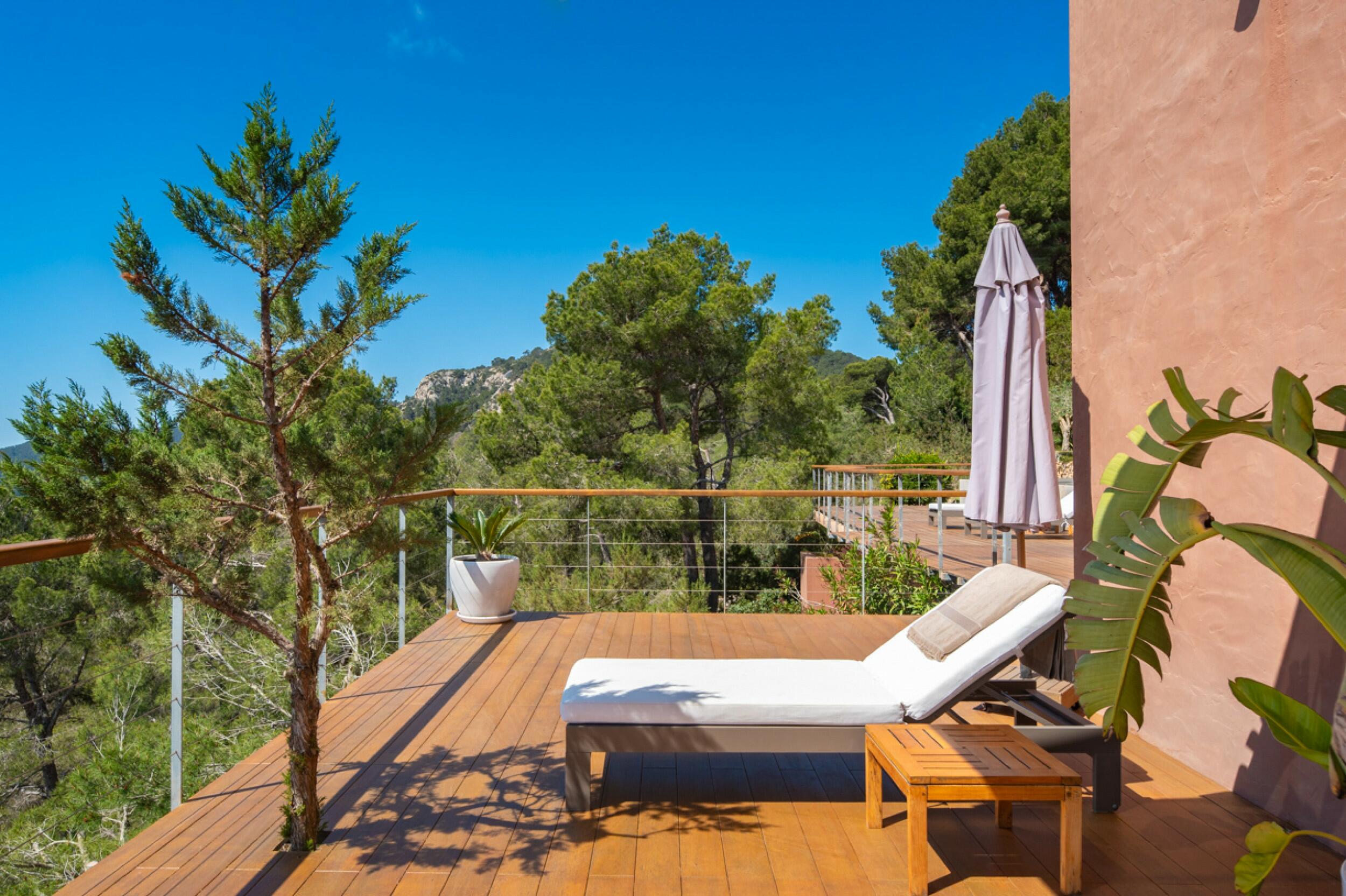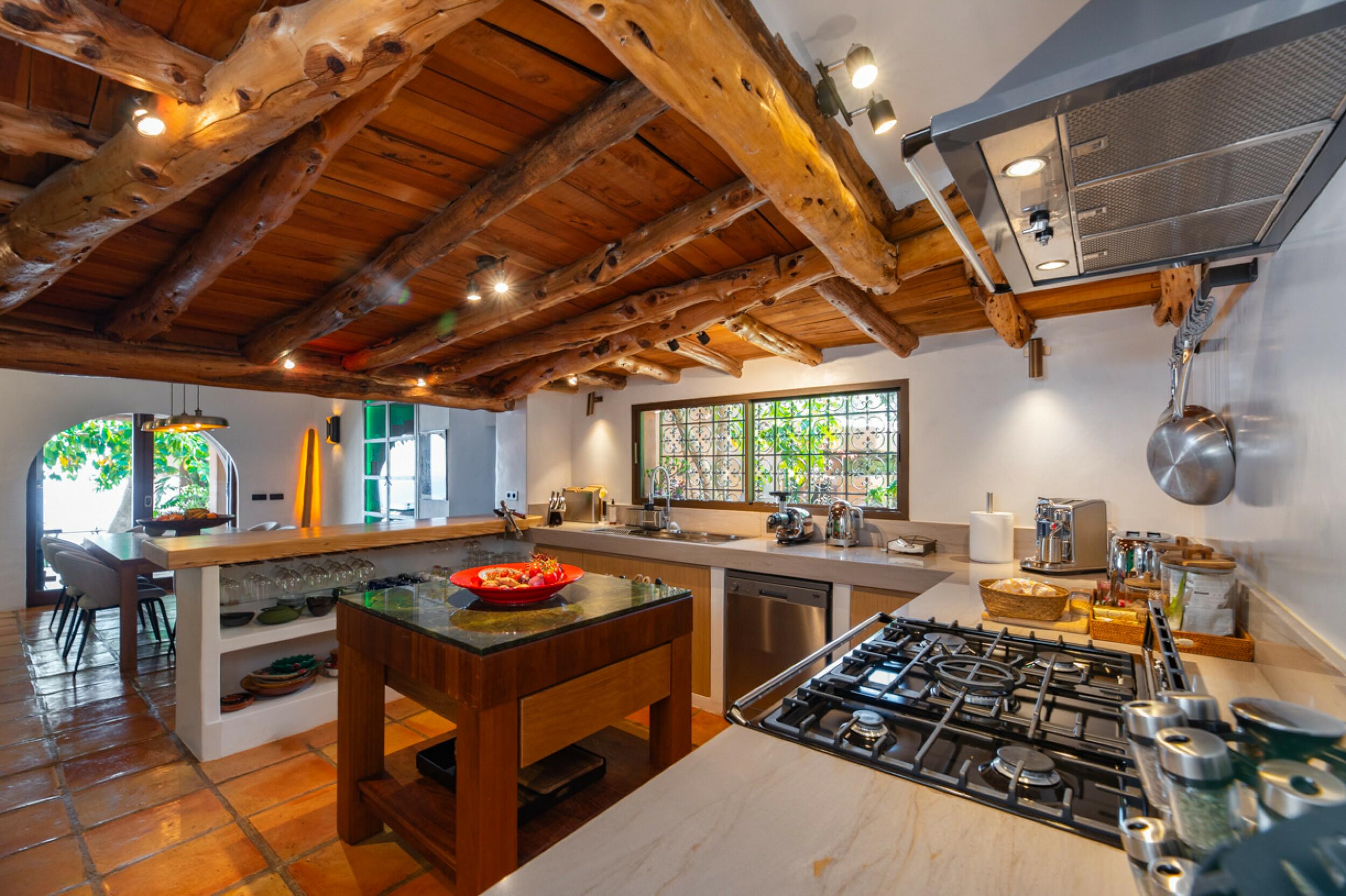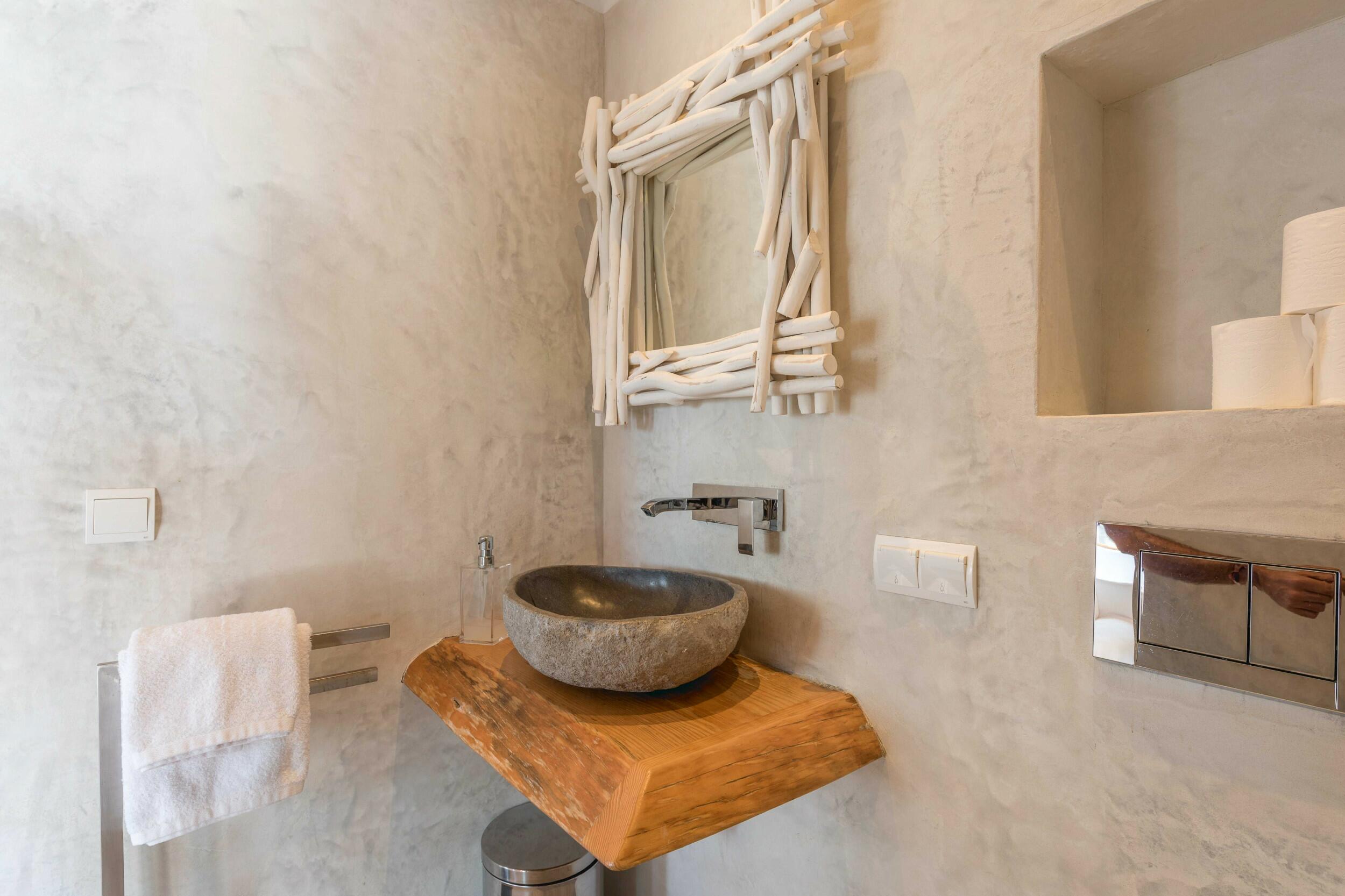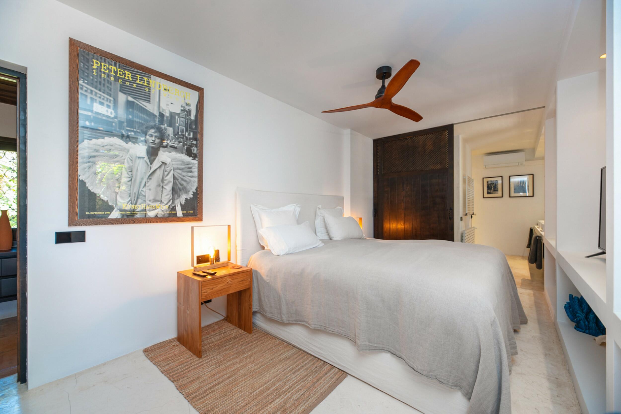 Casa Fontana combina el carácter ibicenco atemporal con el confort contemporáneo: muros de piedra natural y suelos de terracota se combinan con amplios ventanales para inundar los espacios de vida con luz mediterránea. Una cocina de planta abierta, totalmente equipada, fluye hacia el comedor y hacia las terrazas orientadas al sur y al oeste, creando un ritmo fácil y acogedor de la mañana a la noche. Las habitaciones y la sala de estar principal cuentan con aire acondicionado, con detalles pensados como cortinas opacas, Smart TV, Wi-Fi y un cuarto de lavandería con frigorífico adicional.