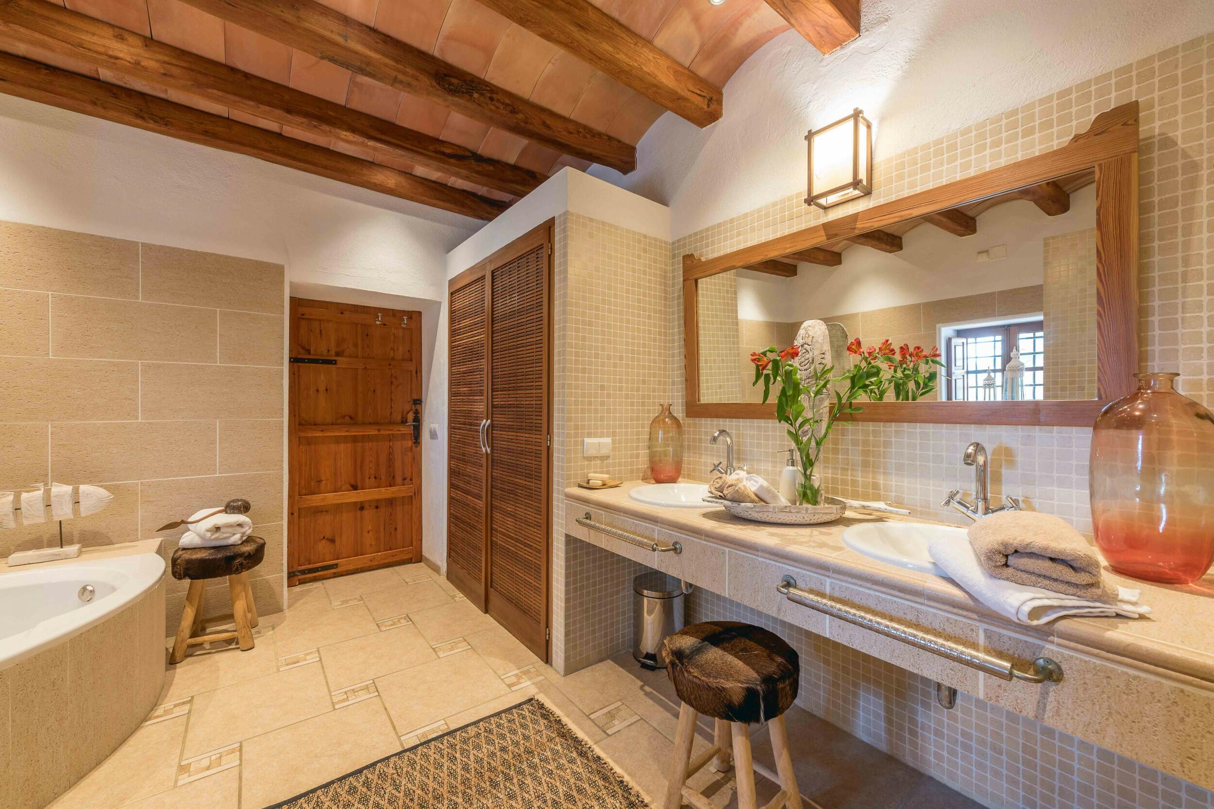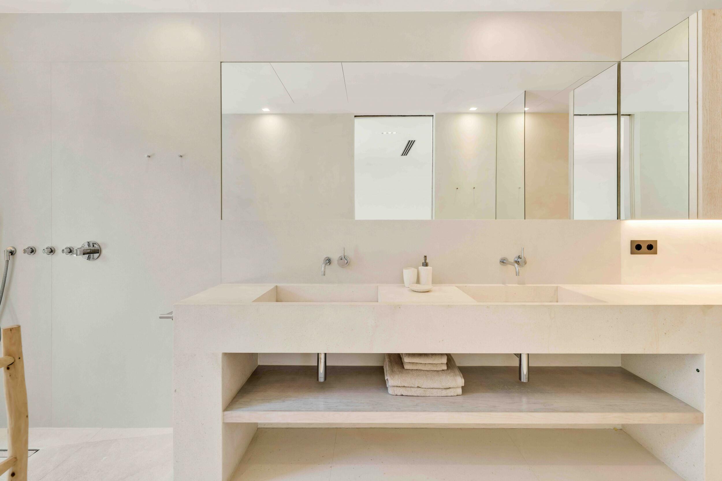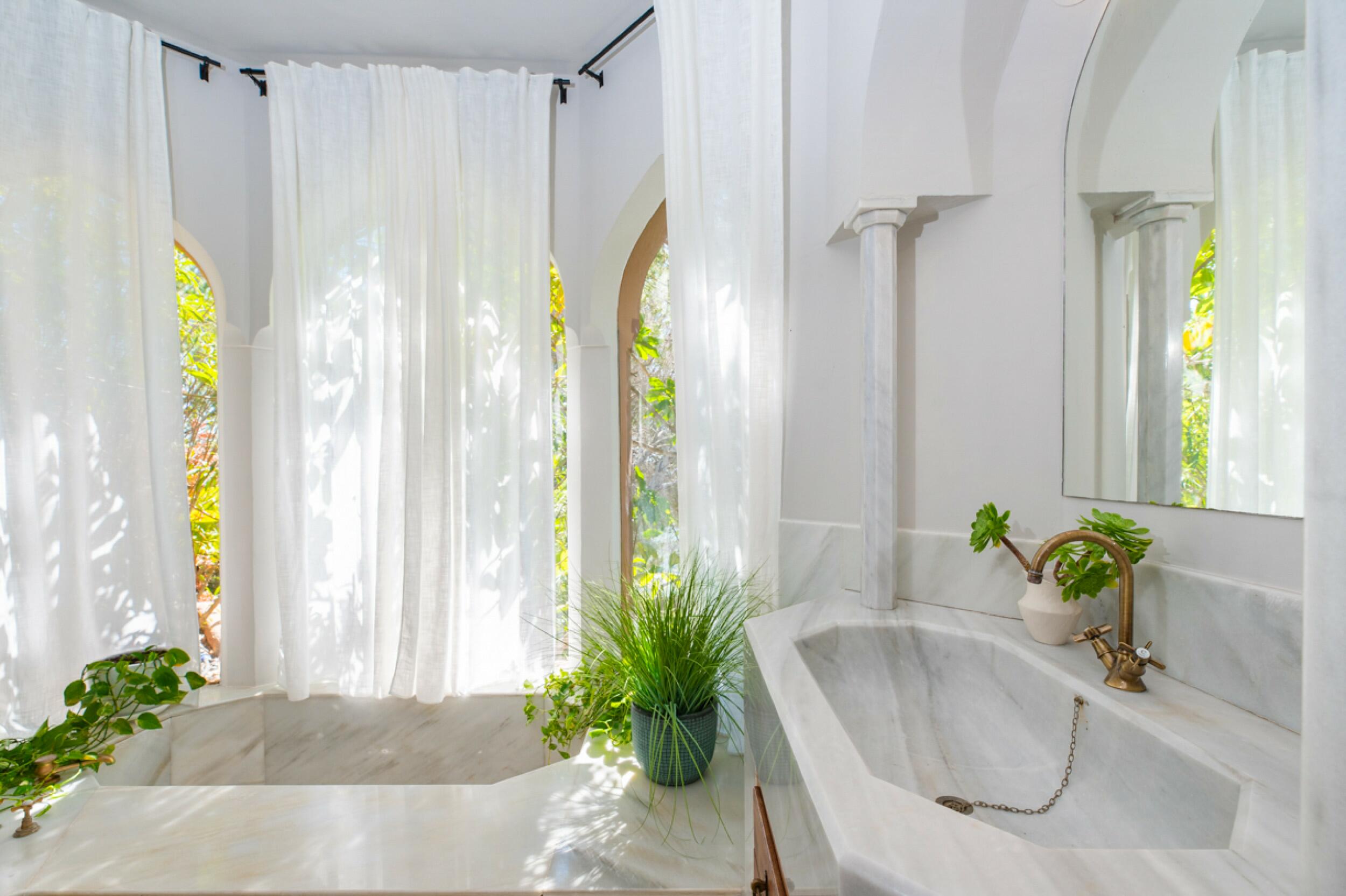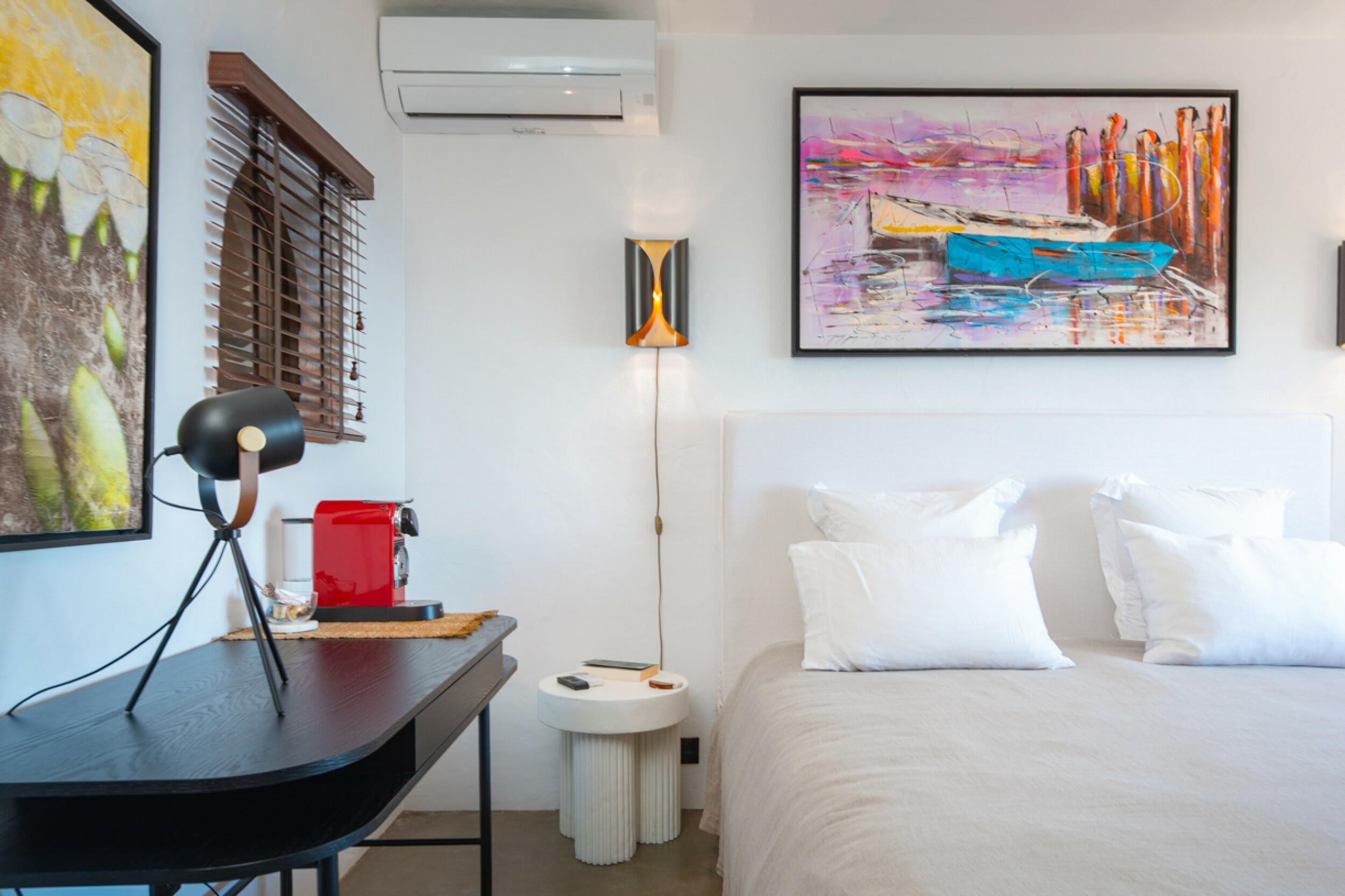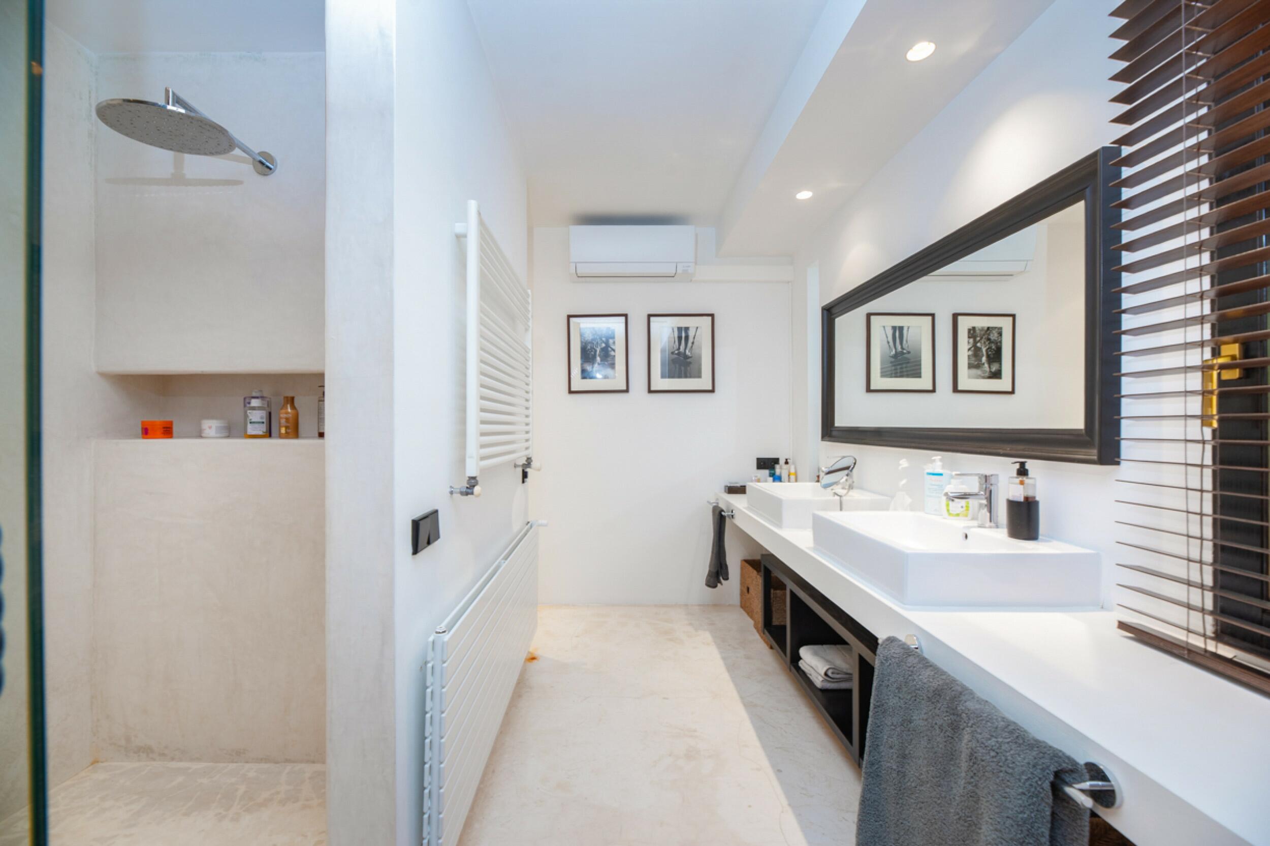 Casa Fontana combina el carácter ibicenco atemporal con el confort contemporáneo: muros de piedra natural y suelos de terracota se combinan con amplios ventanales para inundar los espacios de vida con luz mediterránea. Una cocina de planta abierta, totalmente equipada, fluye hacia el comedor y hacia las terrazas orientadas al sur y al oeste, creando un ritmo fácil y acogedor de la mañana a la noche. Las habitaciones y la sala de estar principal cuentan con aire acondicionado, con detalles pensados como cortinas opacas, Smart TV, Wi-Fi y un cuarto de lavandería con frigorífico adicional.