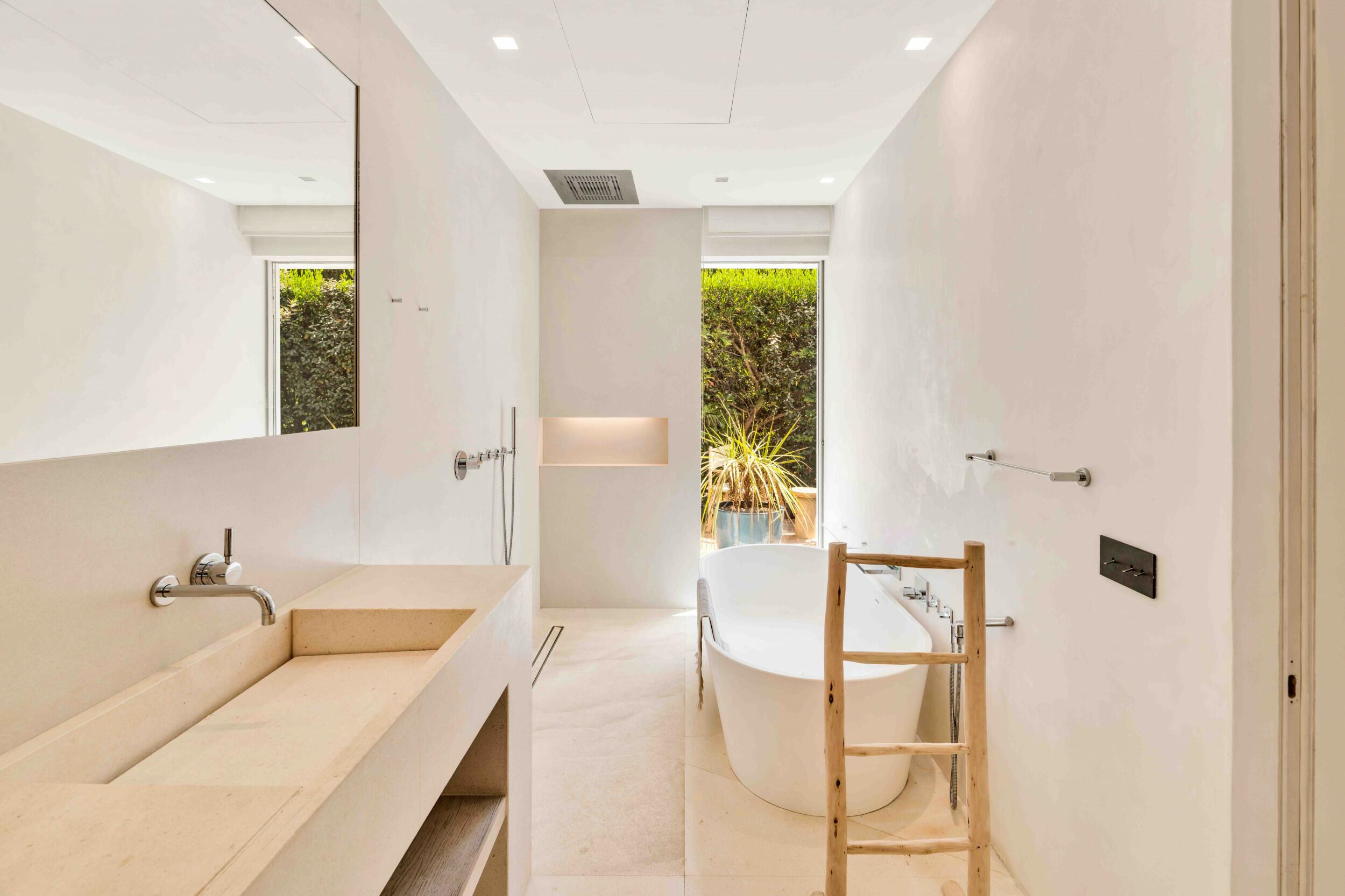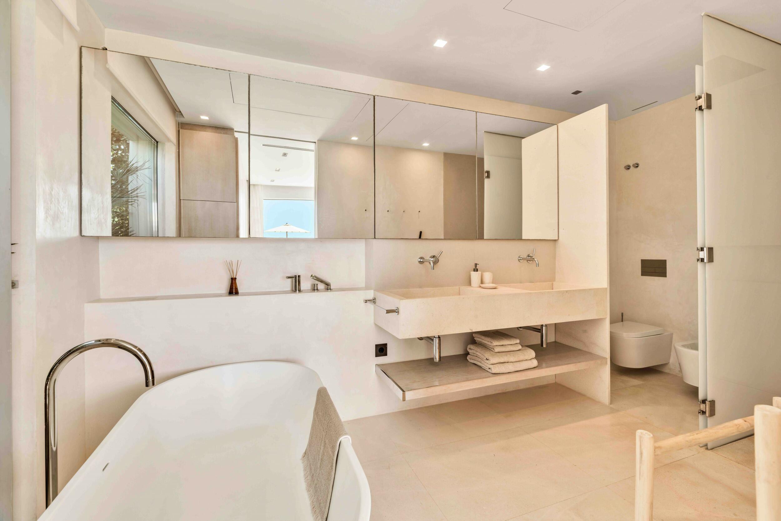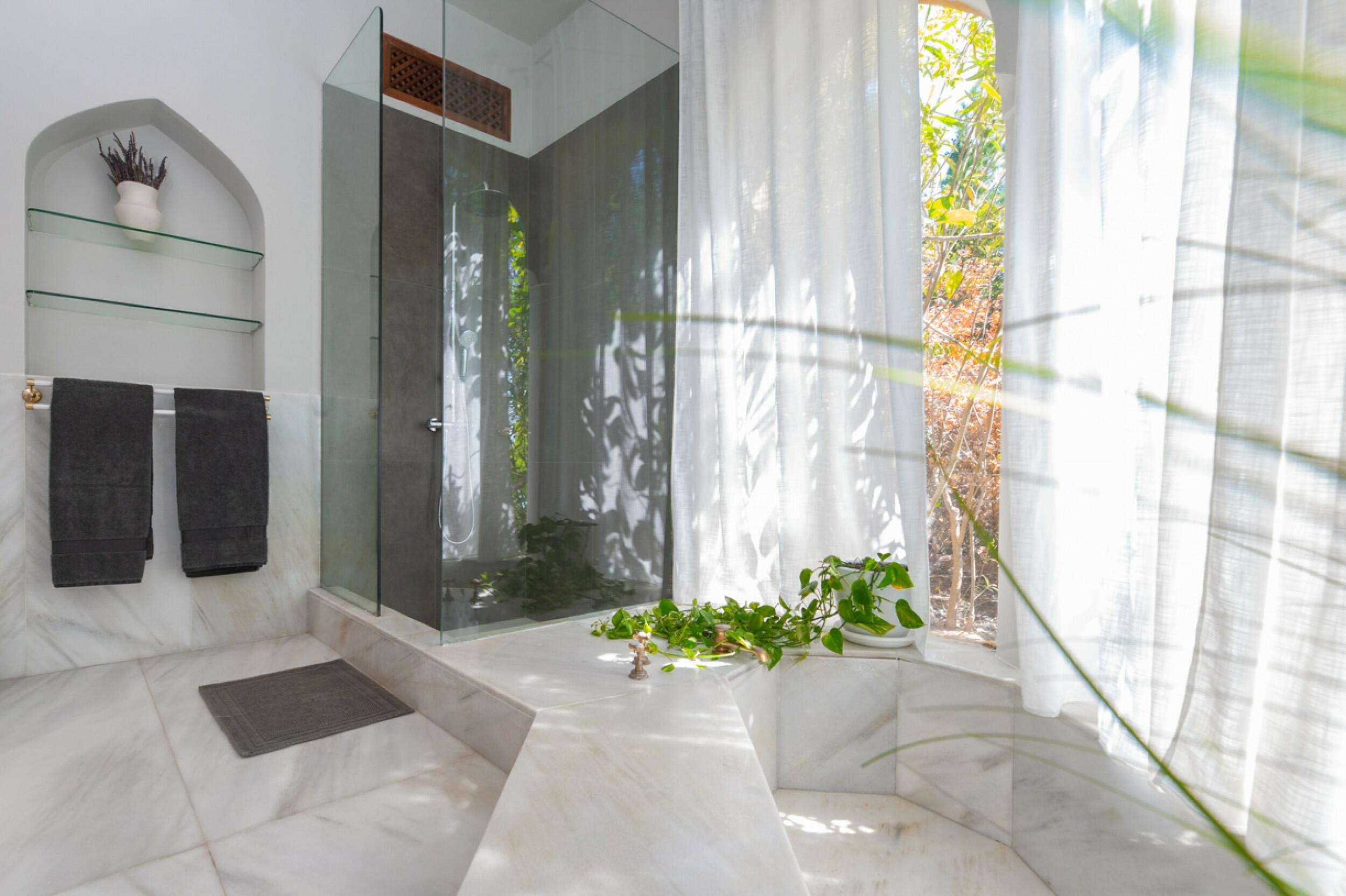 • Suite principal (emperador 210×210): vestidor, bañera y ducha para dos, terraza privada con vistas al jardín y al mar