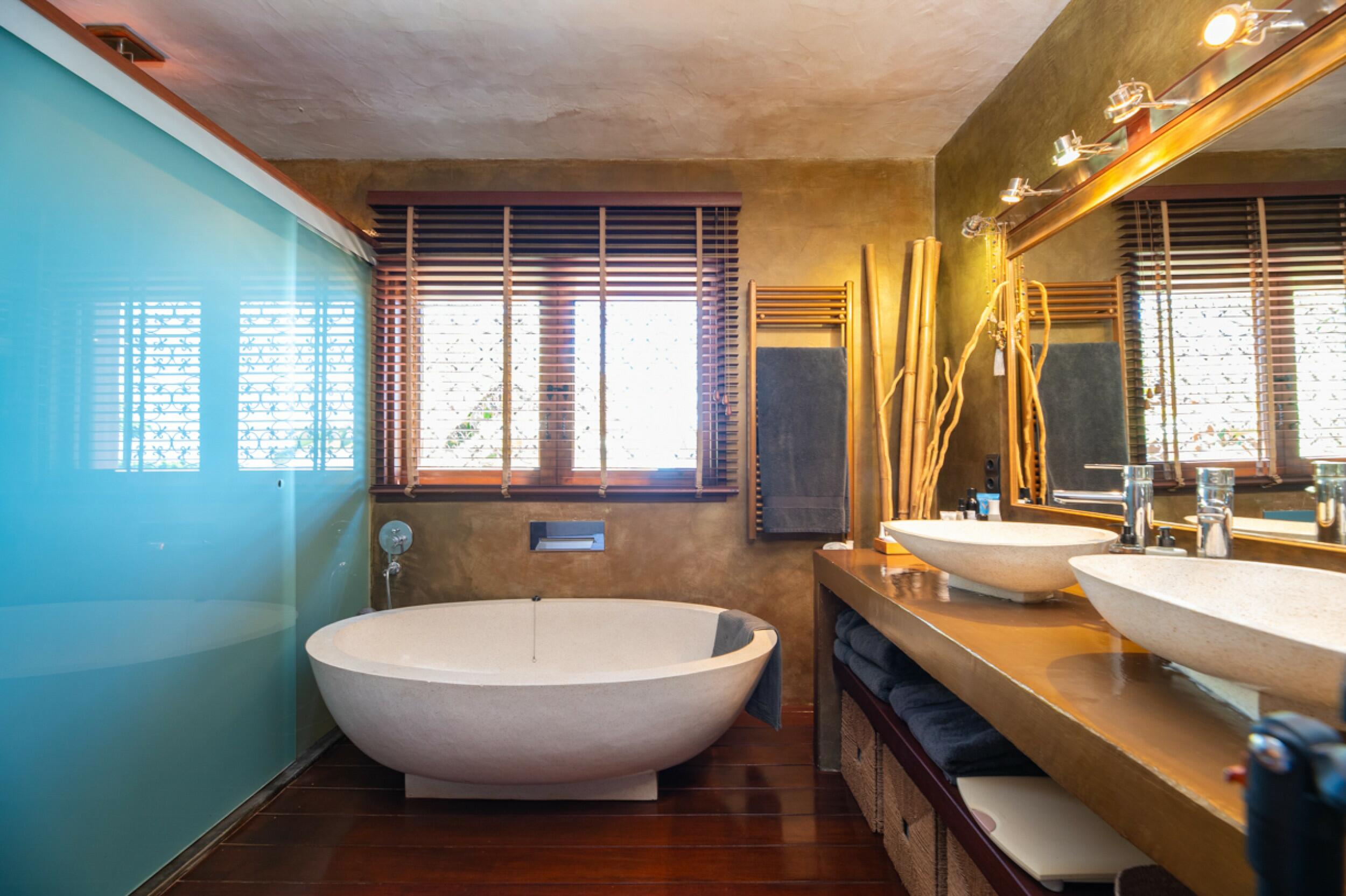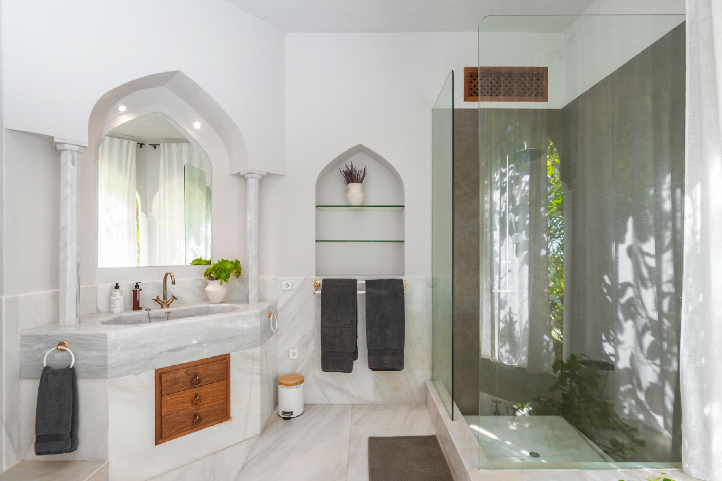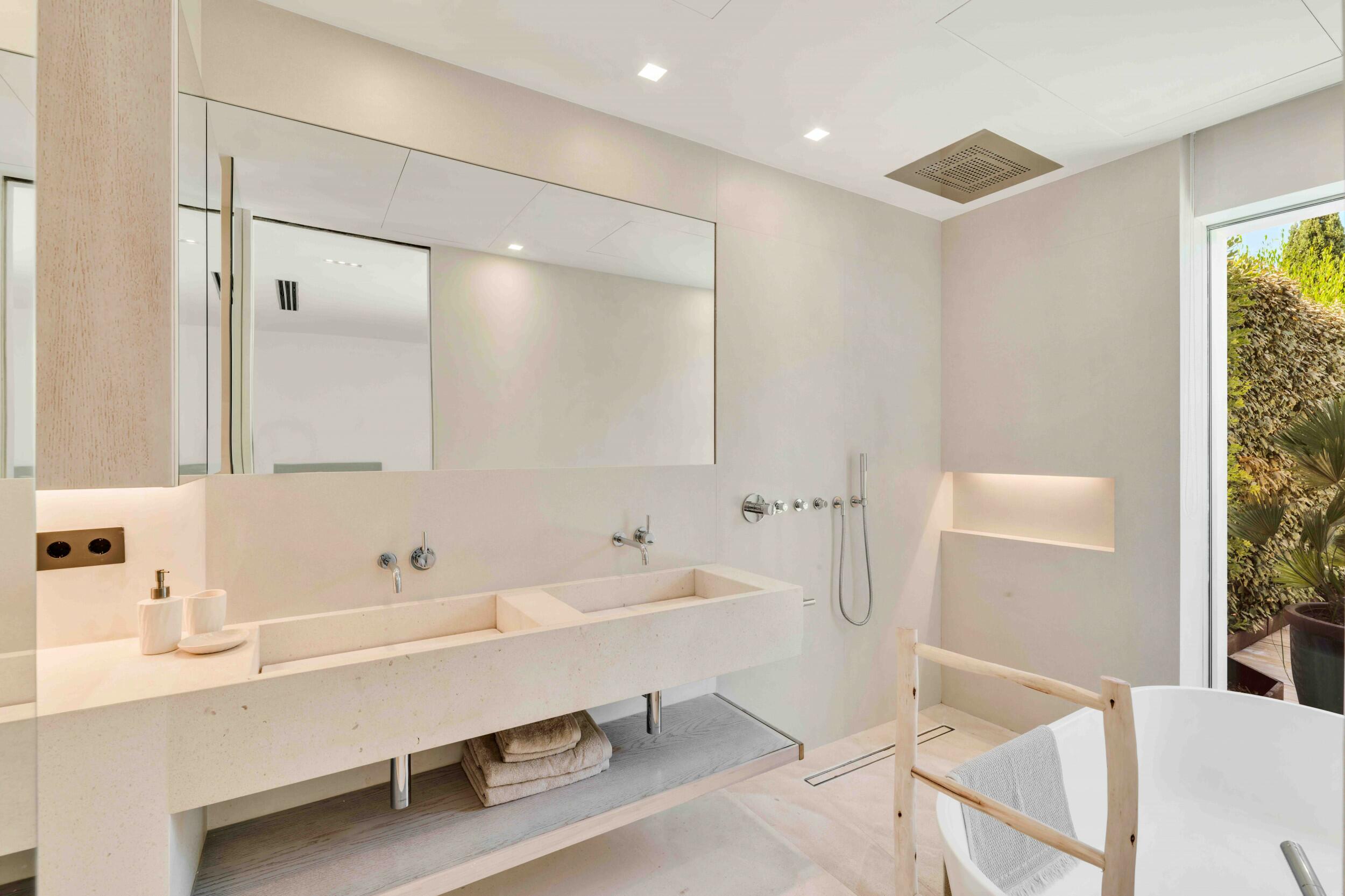 • Suite principal (emperador 210×210): vestidor, bañera y ducha para dos, terraza privada con vistas al jardín y al mar