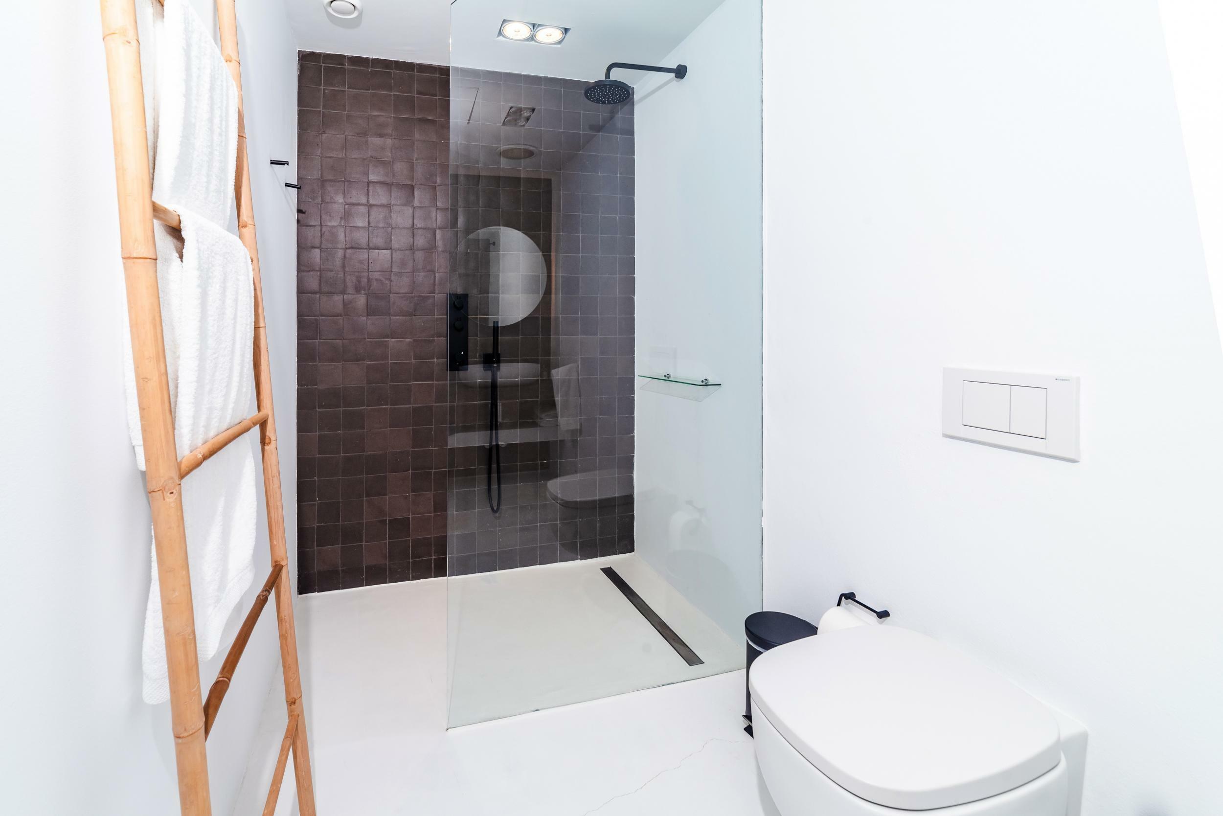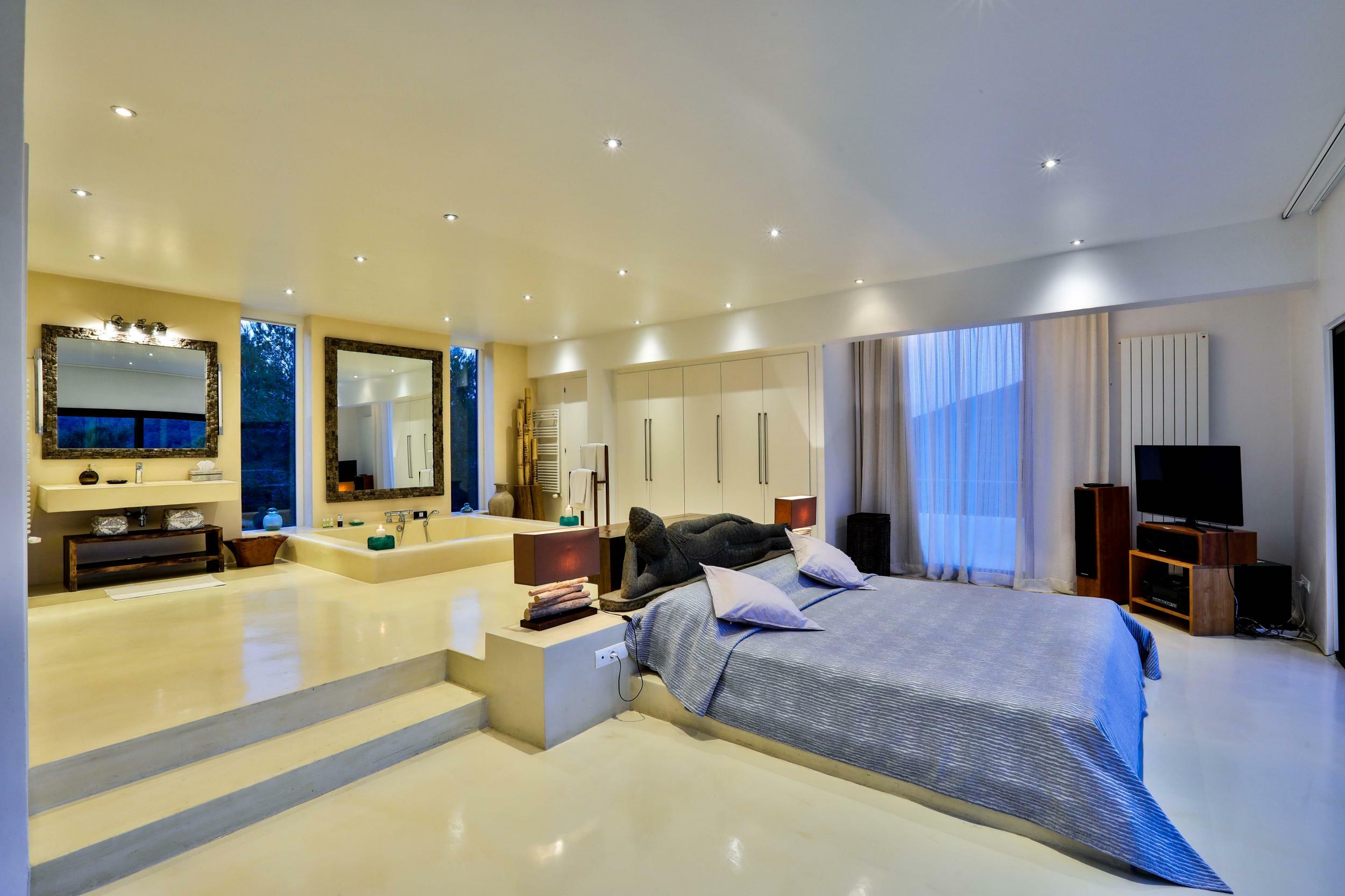 La villa cuenta con cinco dormitorios de buen tamaño, incluyendo una gran suite principal. Cuatro de estos dormitorios se encuentran en la planta superior de la casa principal. El último dormitorio doble es una elegante habitación independiente que se abre a la piscina. Todos los dormitorios tienen vistas al mar, aire acondicionado y acceso a las terrazas exteriores.