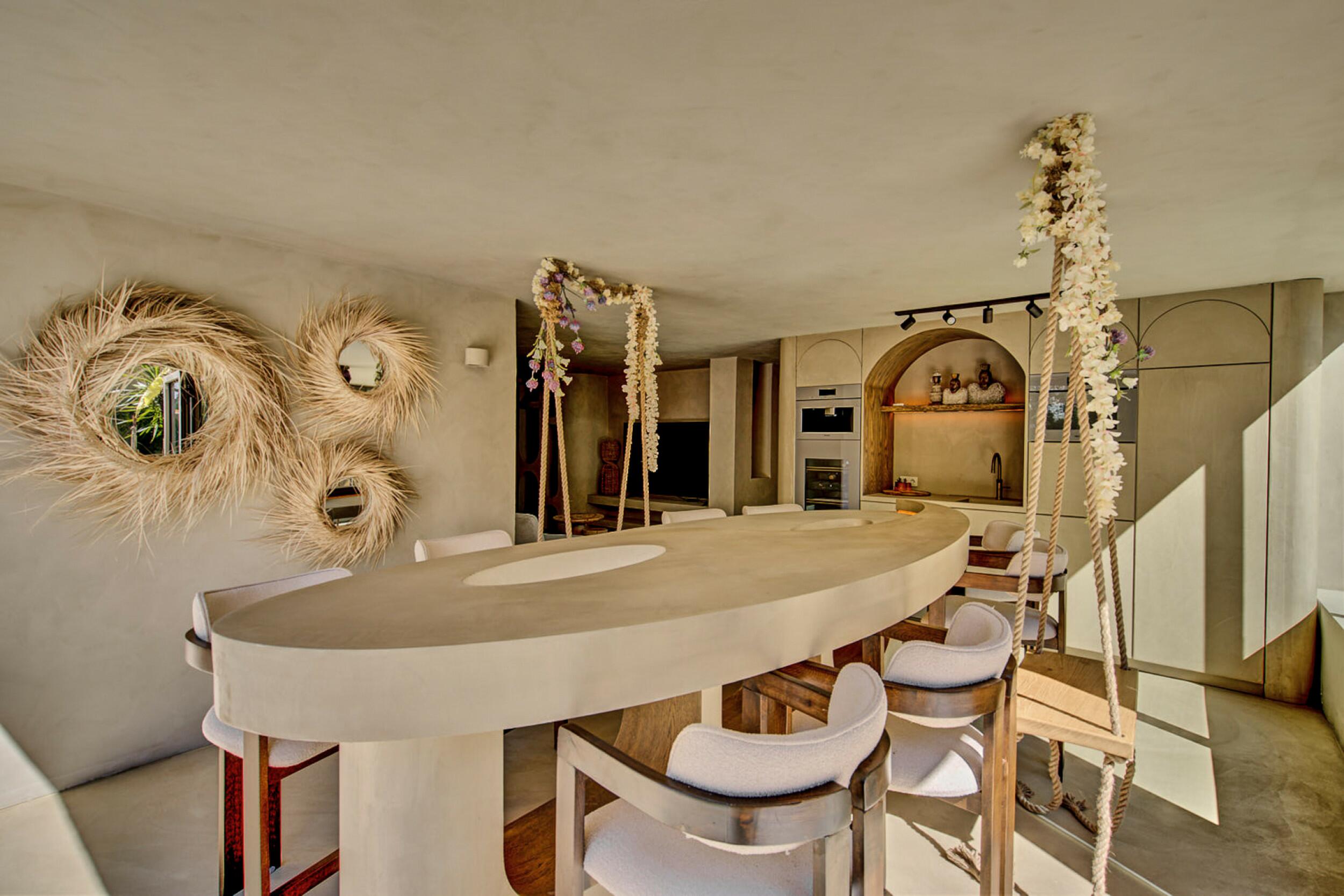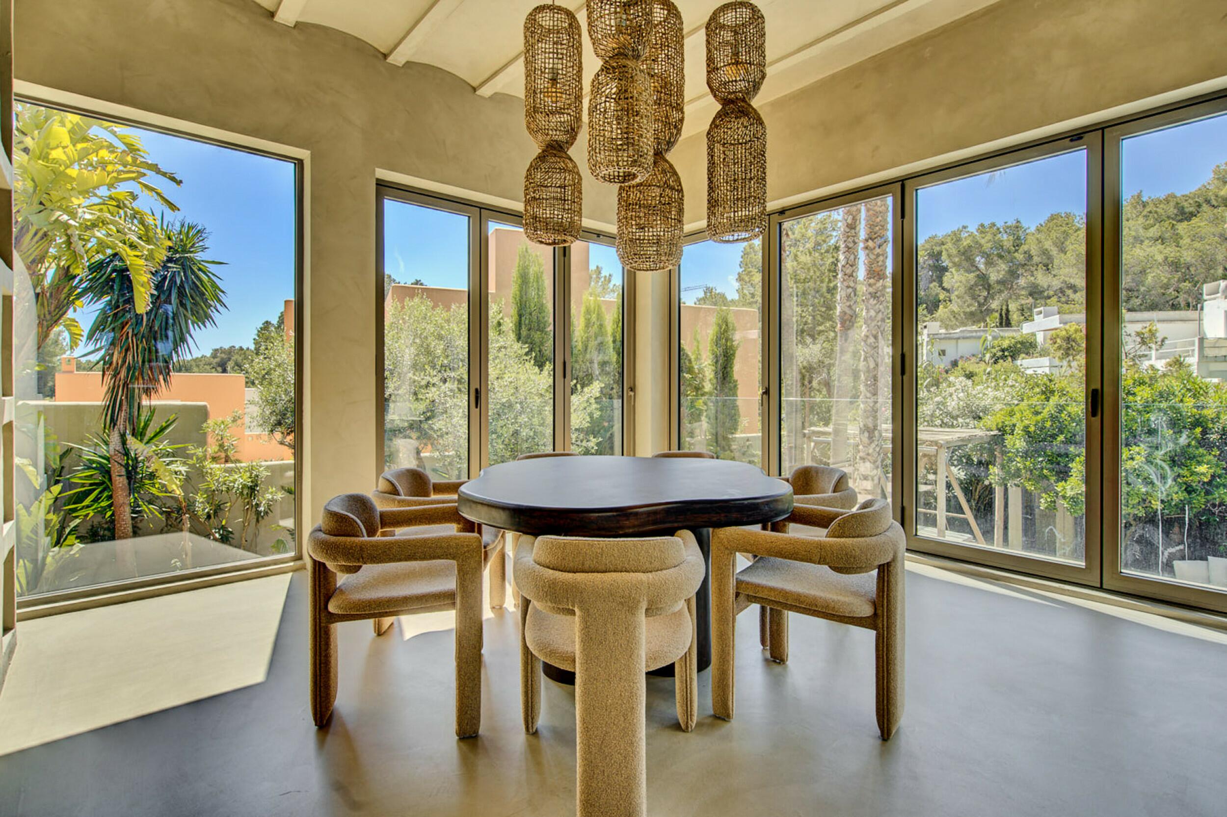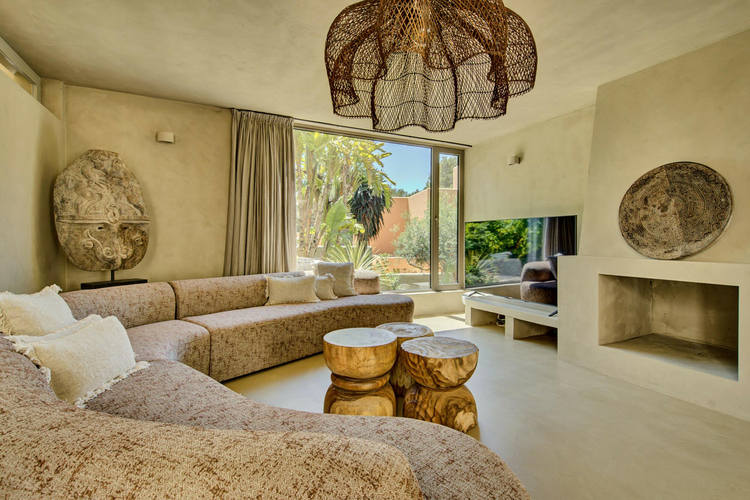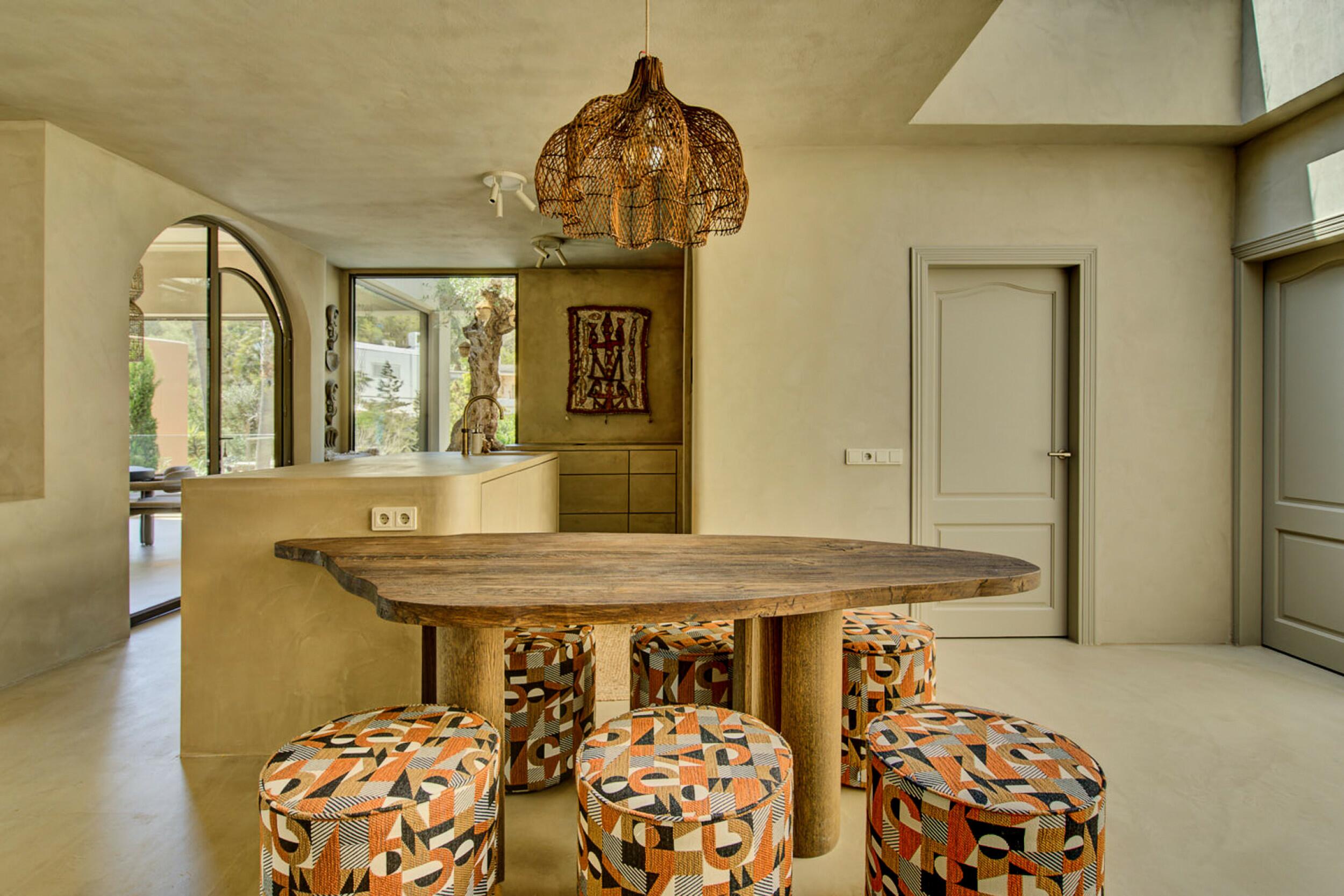 La cuidada selección de materiales y acabados caracteriza esta promoción, diseñada pensando en que el carácter atemporal y la elegancia se extiendan por toda la vivienda. La piedra natural de Ibiza reviste las paredes exteriores para conferir a la casa su aspecto general, articulando la escala de tres niveles. La altura excepcional del techo de 4,5 metros da una sensación de amplitud en combinación con todos los acabados de madera.