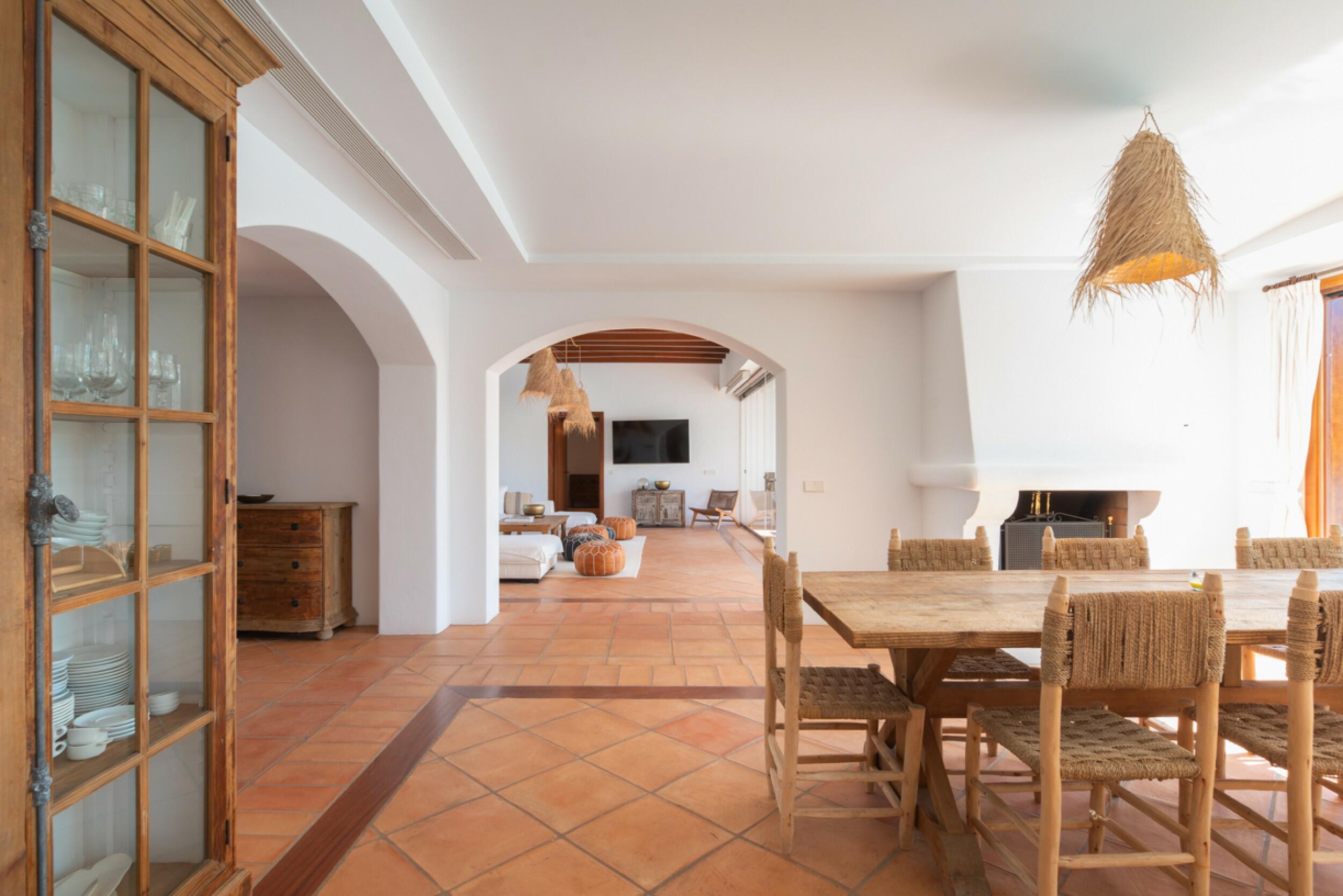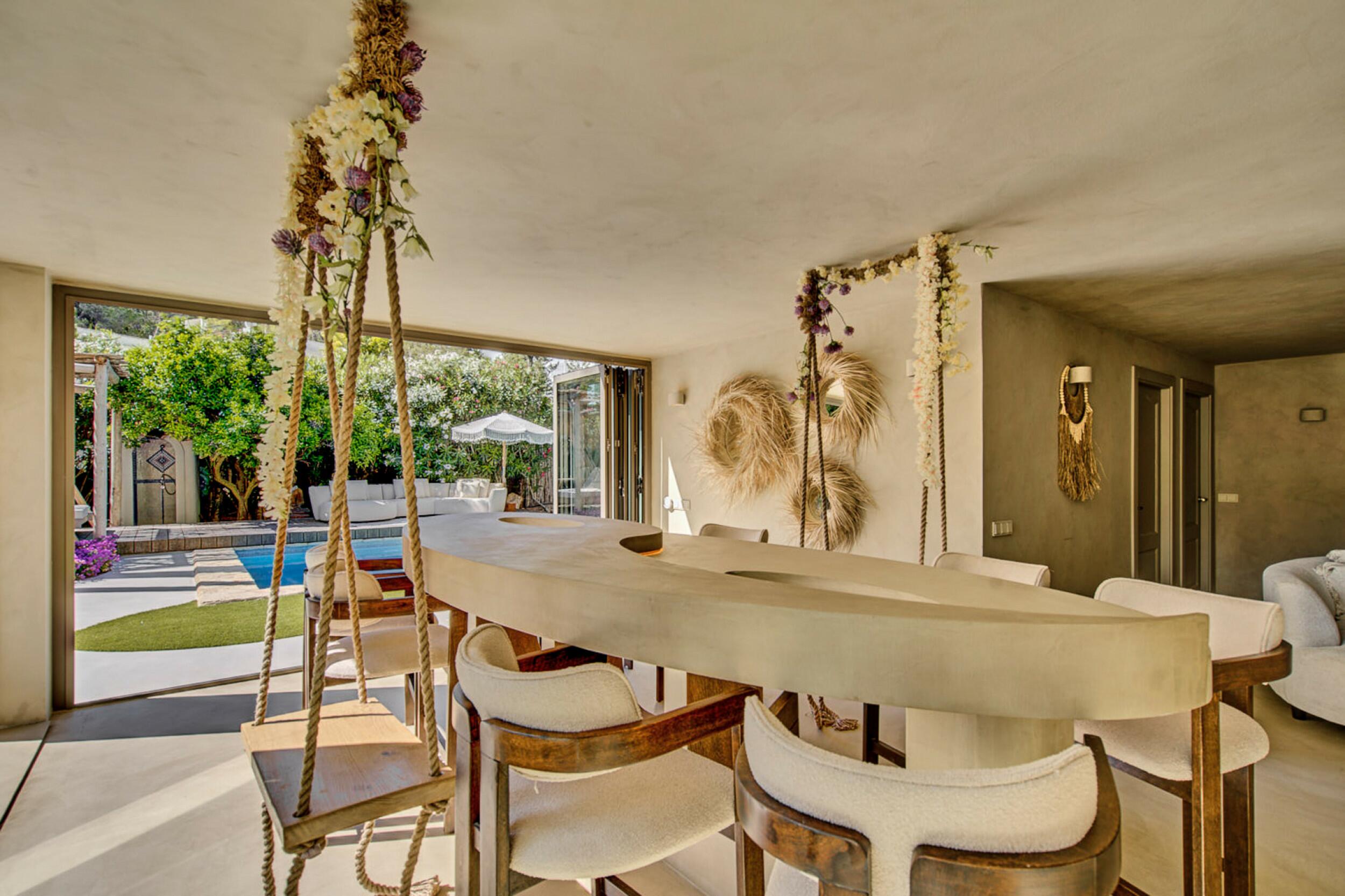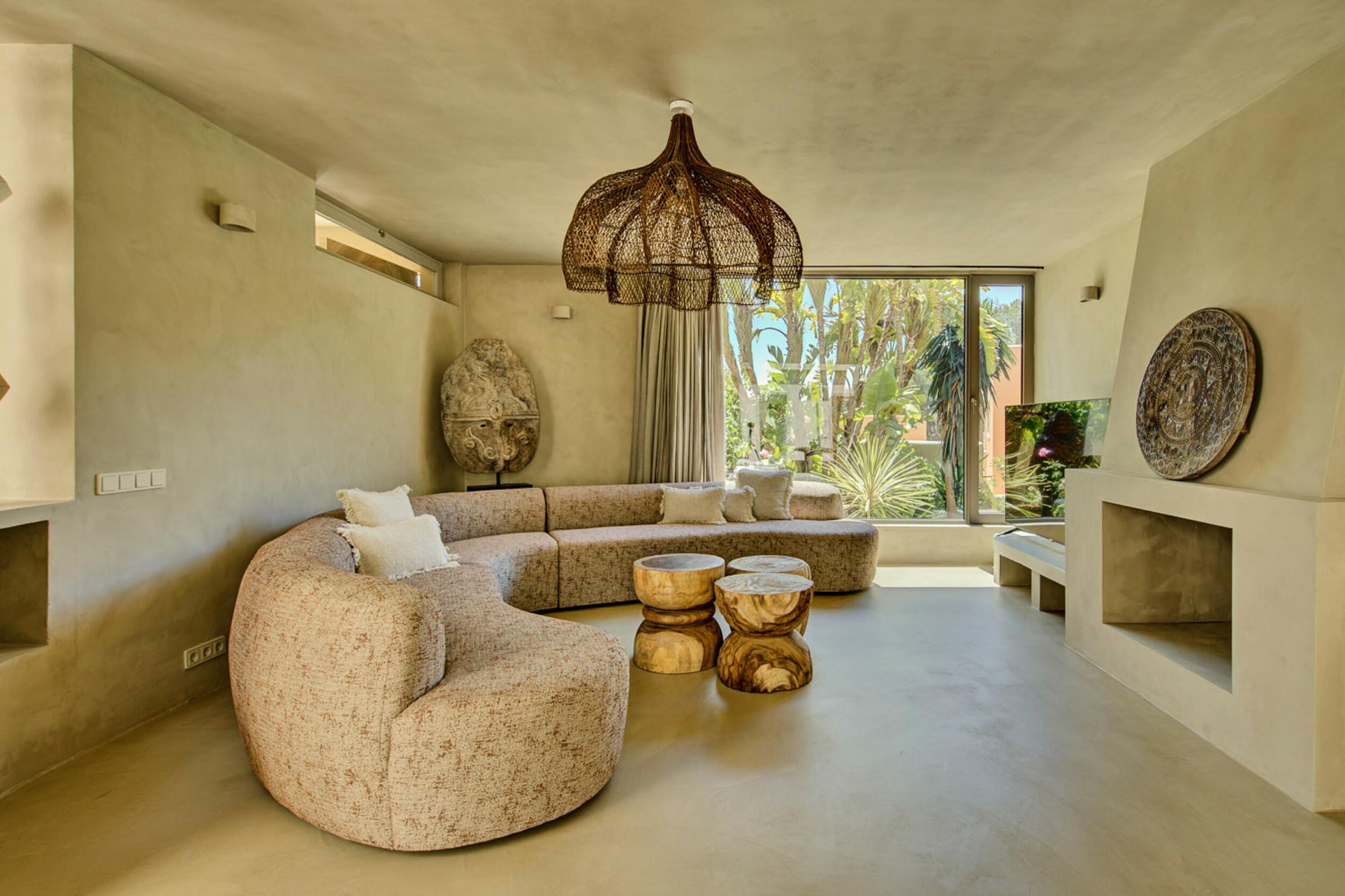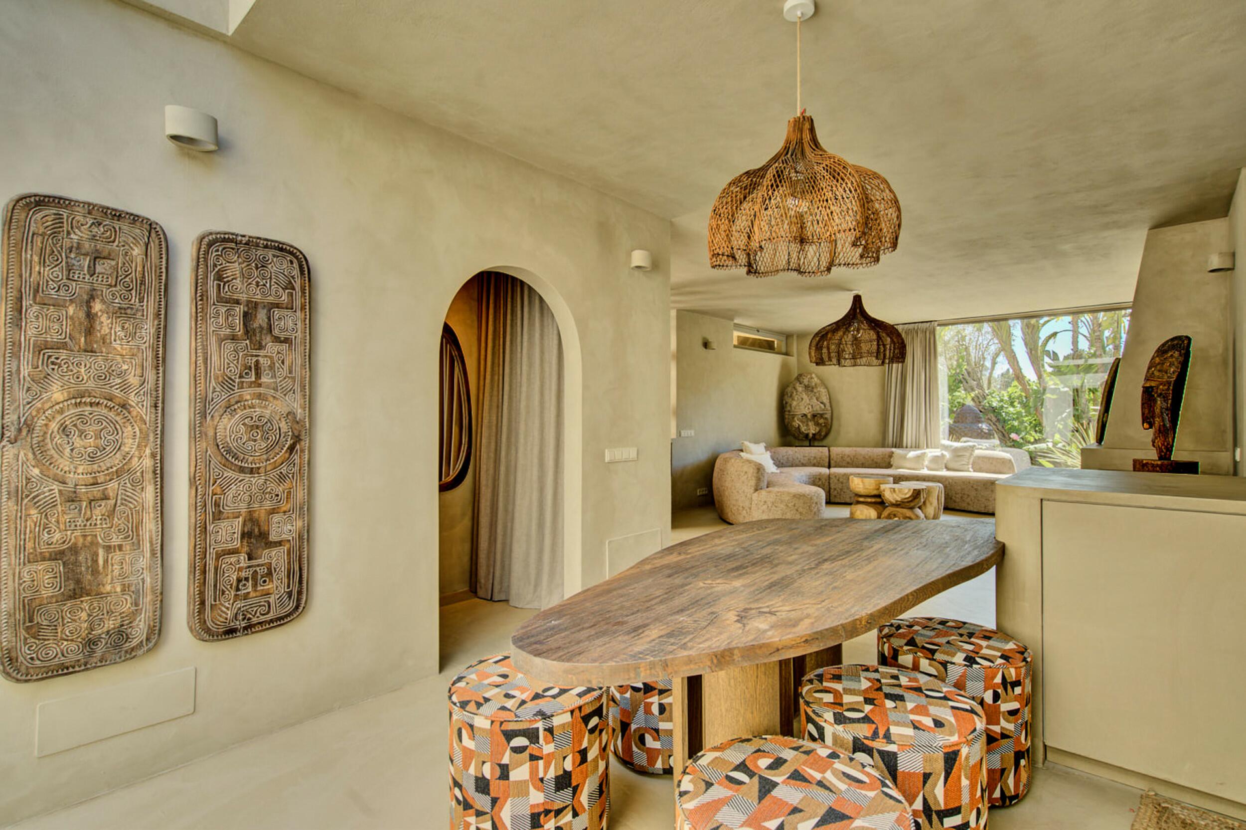 La cuidada selección de materiales y acabados caracteriza esta promoción, diseñada pensando en que el carácter atemporal y la elegancia se extiendan por toda la vivienda. La piedra natural de Ibiza reviste las paredes exteriores para conferir a la casa su aspecto general, articulando la escala de tres niveles. La altura excepcional del techo de 4,5 metros da una sensación de amplitud en combinación con todos los acabados de madera.