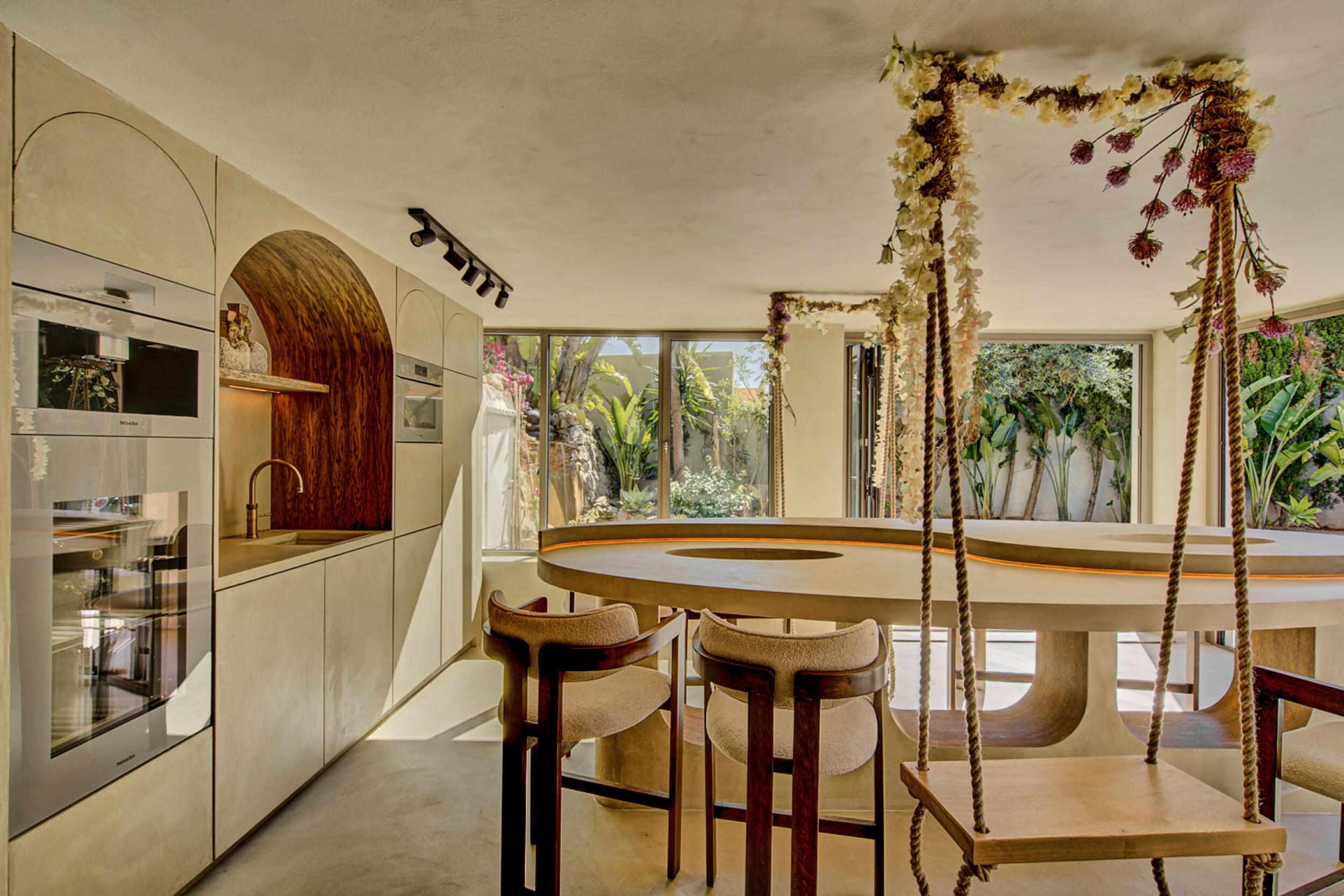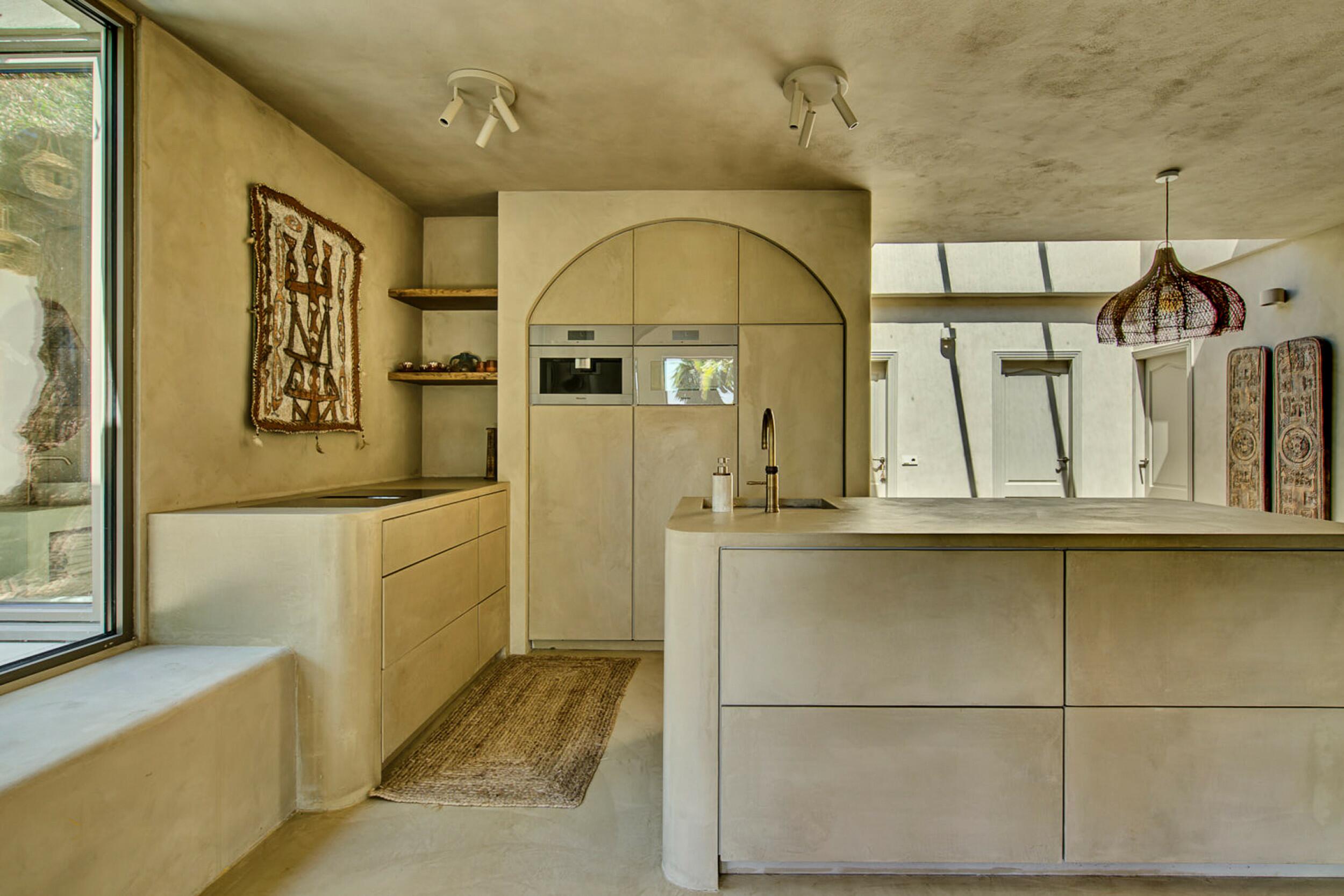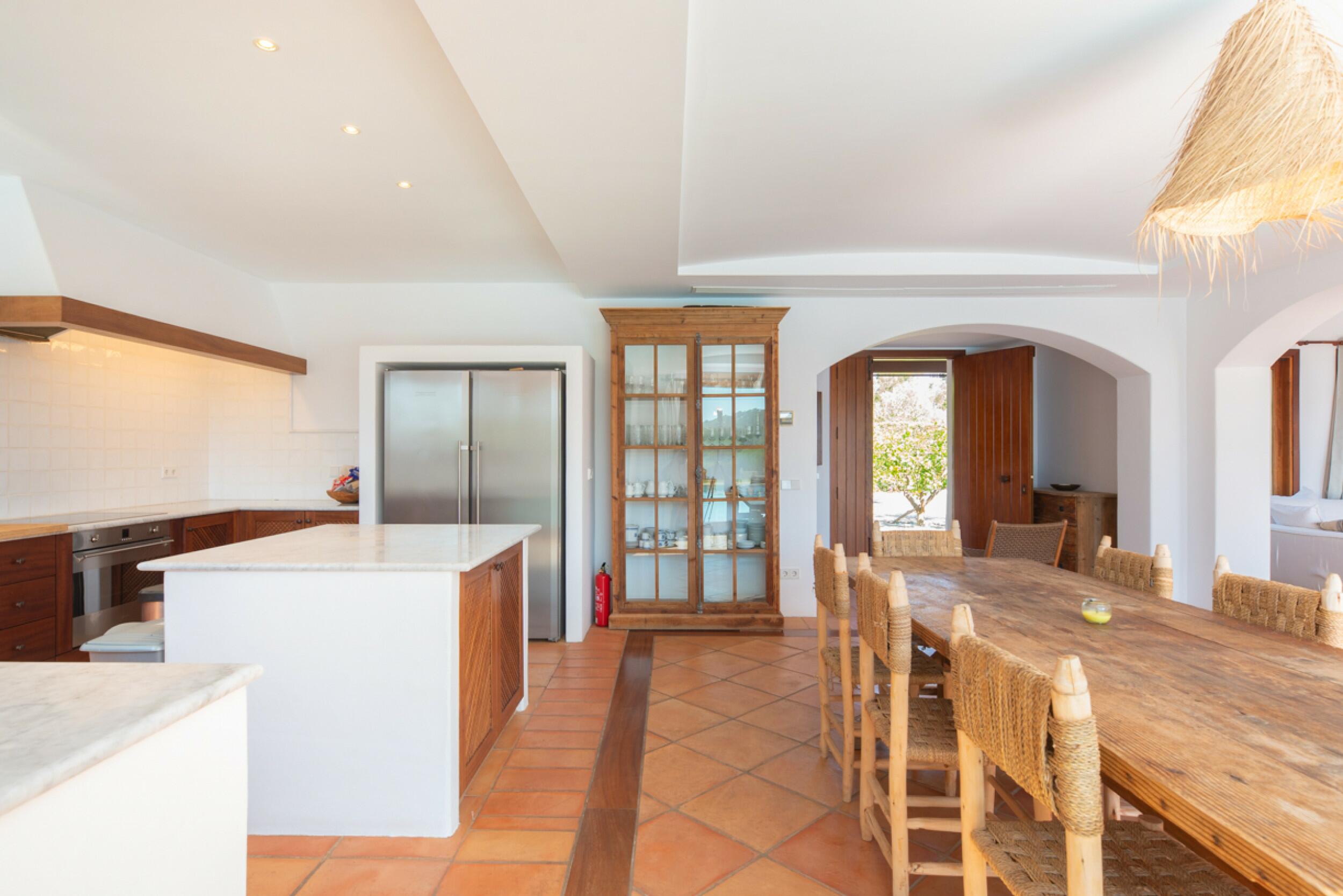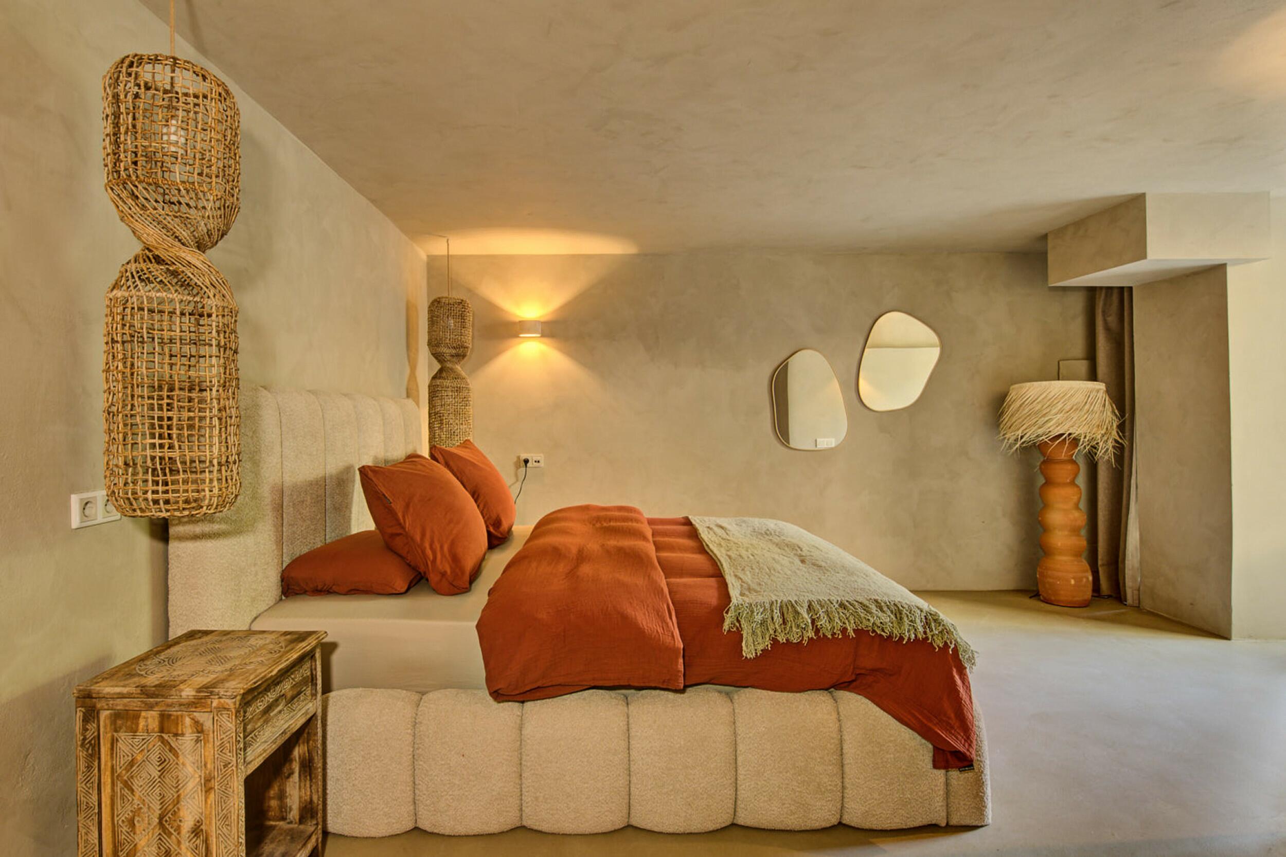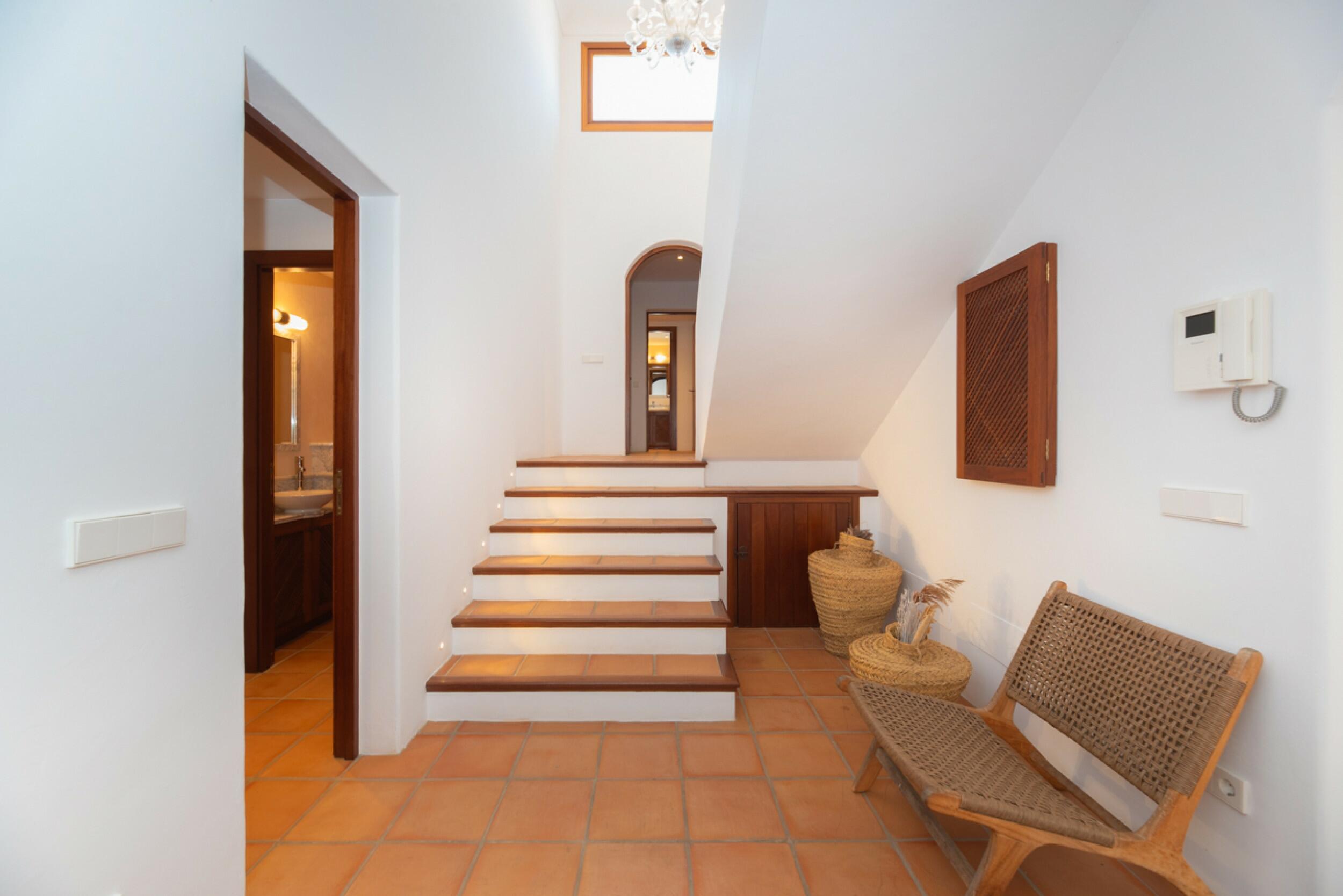 La cuidada selección de materiales y acabados caracteriza esta promoción, diseñada pensando en que el carácter atemporal y la elegancia se extiendan por toda la vivienda. La piedra natural de Ibiza reviste las paredes exteriores para conferir a la casa su aspecto general, articulando la escala de tres niveles. La altura excepcional del techo de 4,5 metros da una sensación de amplitud en combinación con todos los acabados de madera.