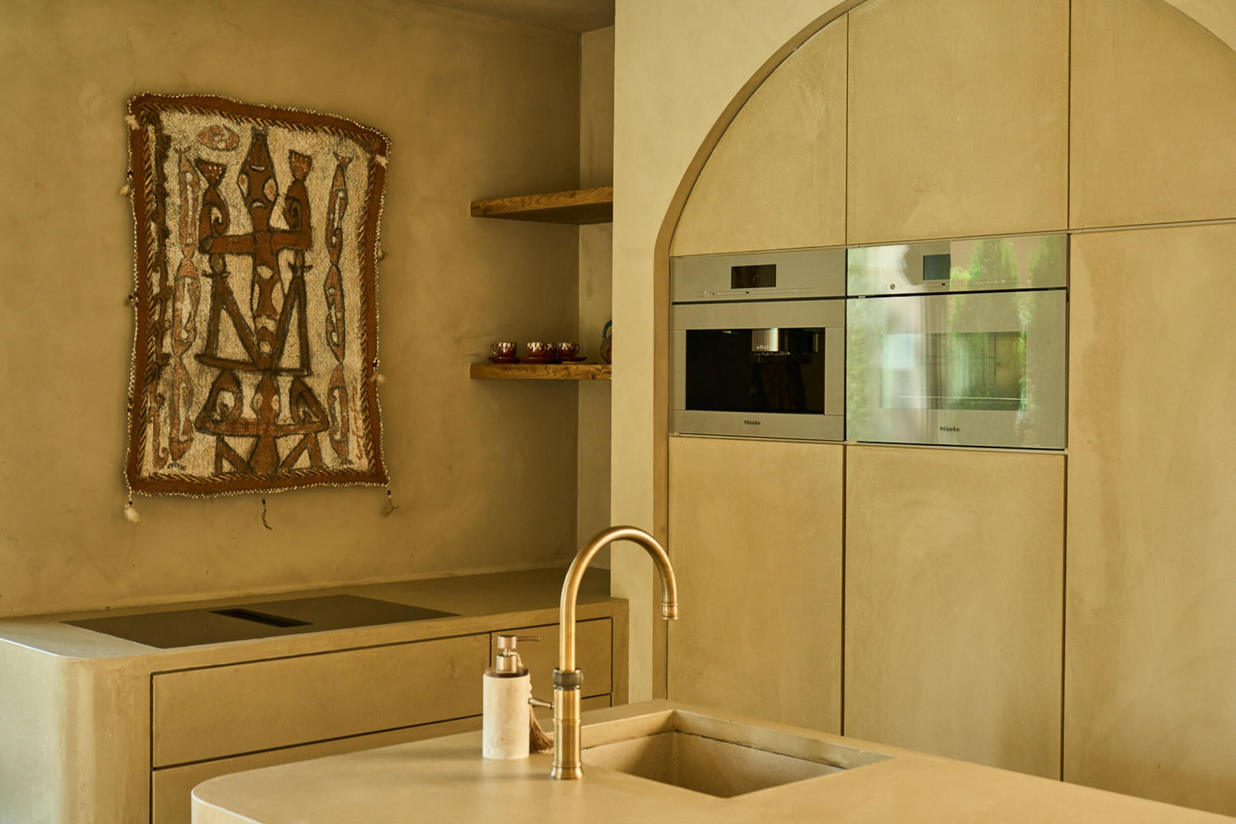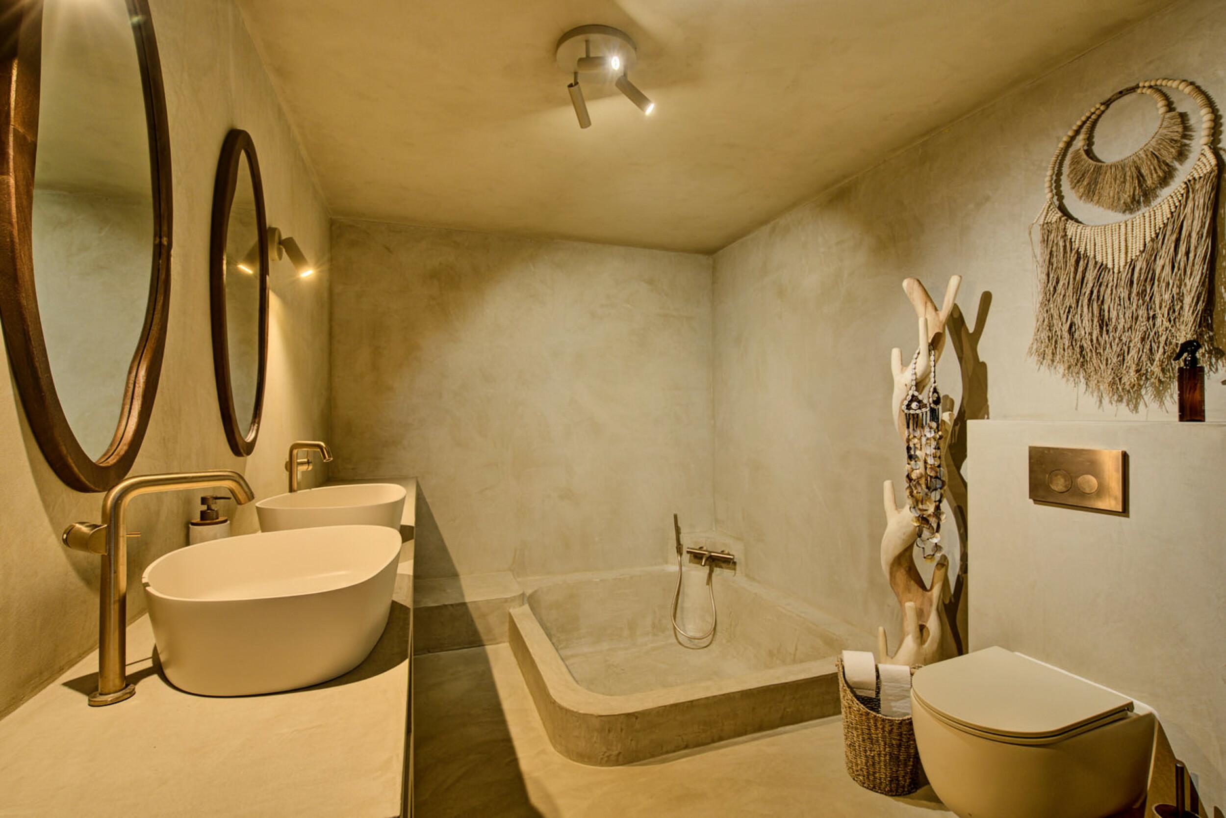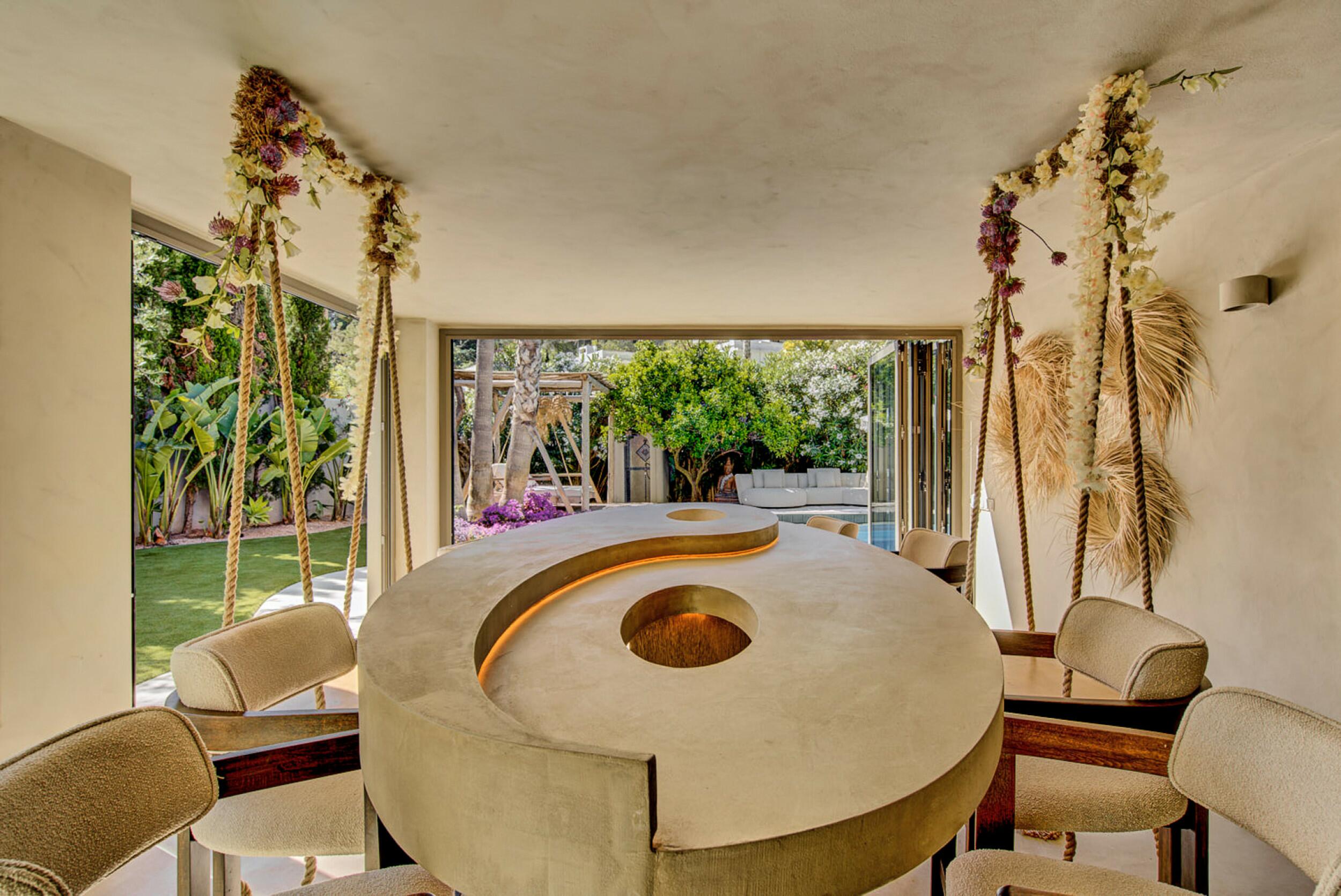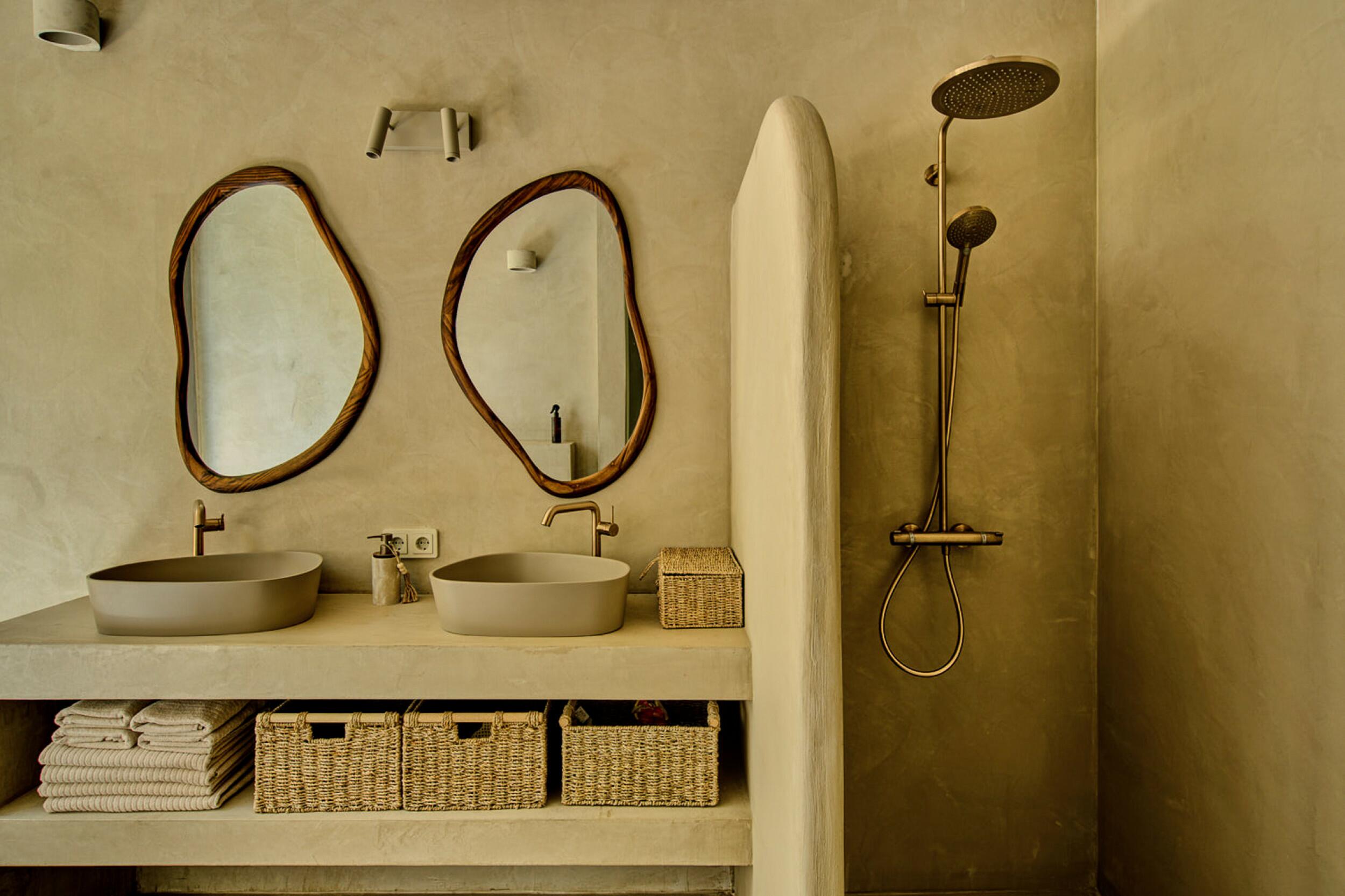 La cuidada selección de materiales y acabados caracteriza esta promoción, diseñada pensando en que el carácter atemporal y la elegancia se extiendan por toda la vivienda. La piedra natural de Ibiza reviste las paredes exteriores para conferir a la casa su aspecto general, articulando la escala de tres niveles. La altura excepcional del techo de 4,5 metros da una sensación de amplitud en combinación con todos los acabados de madera.