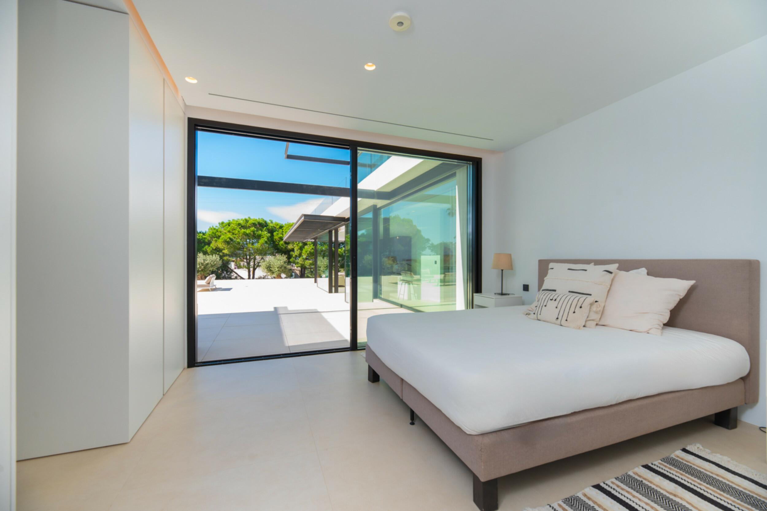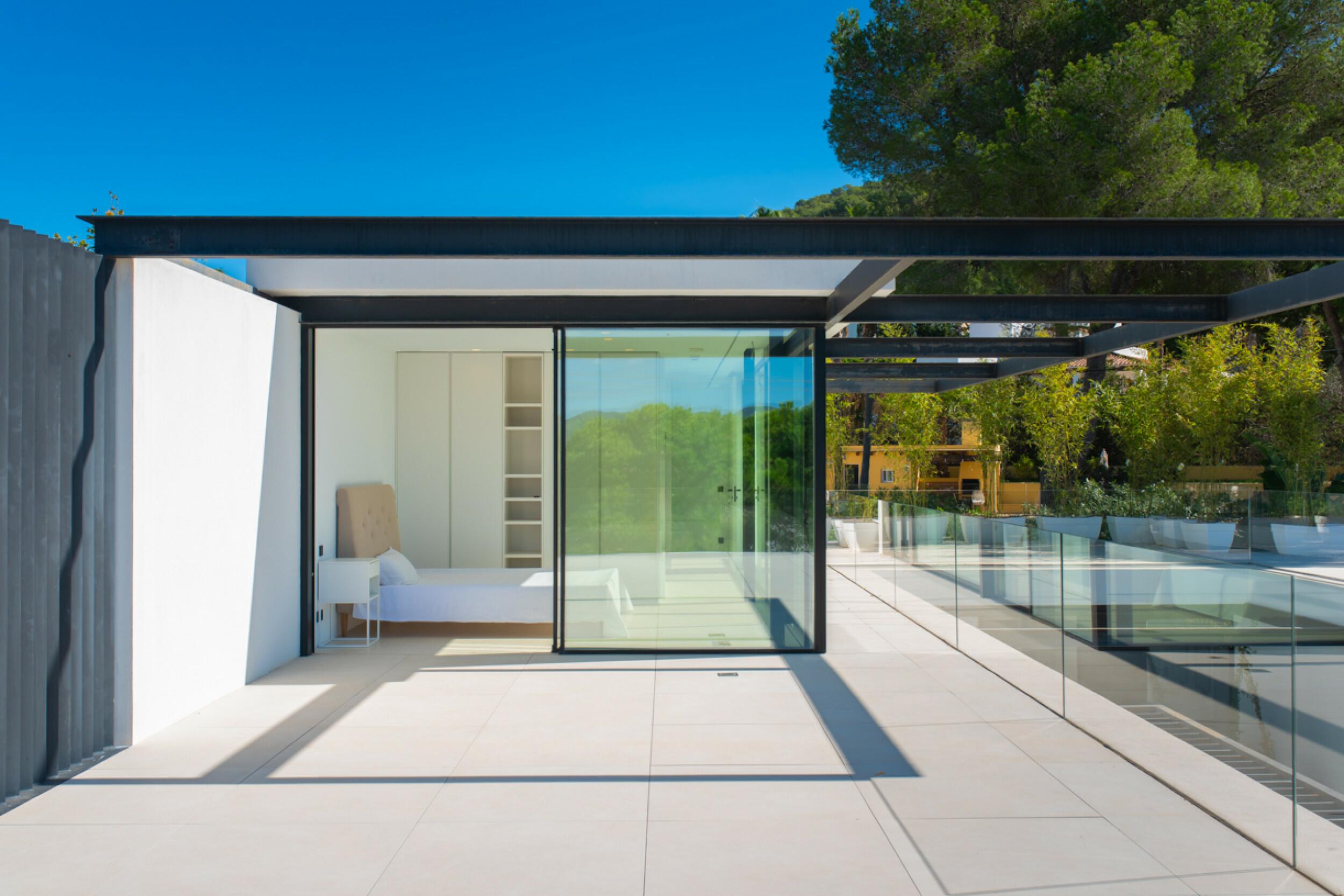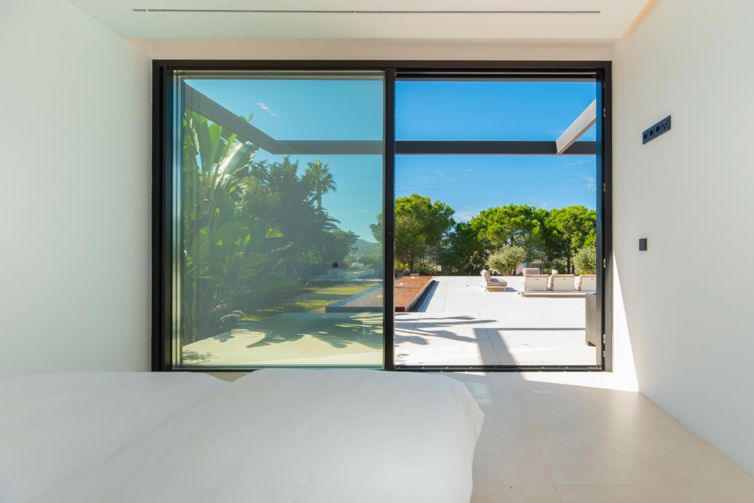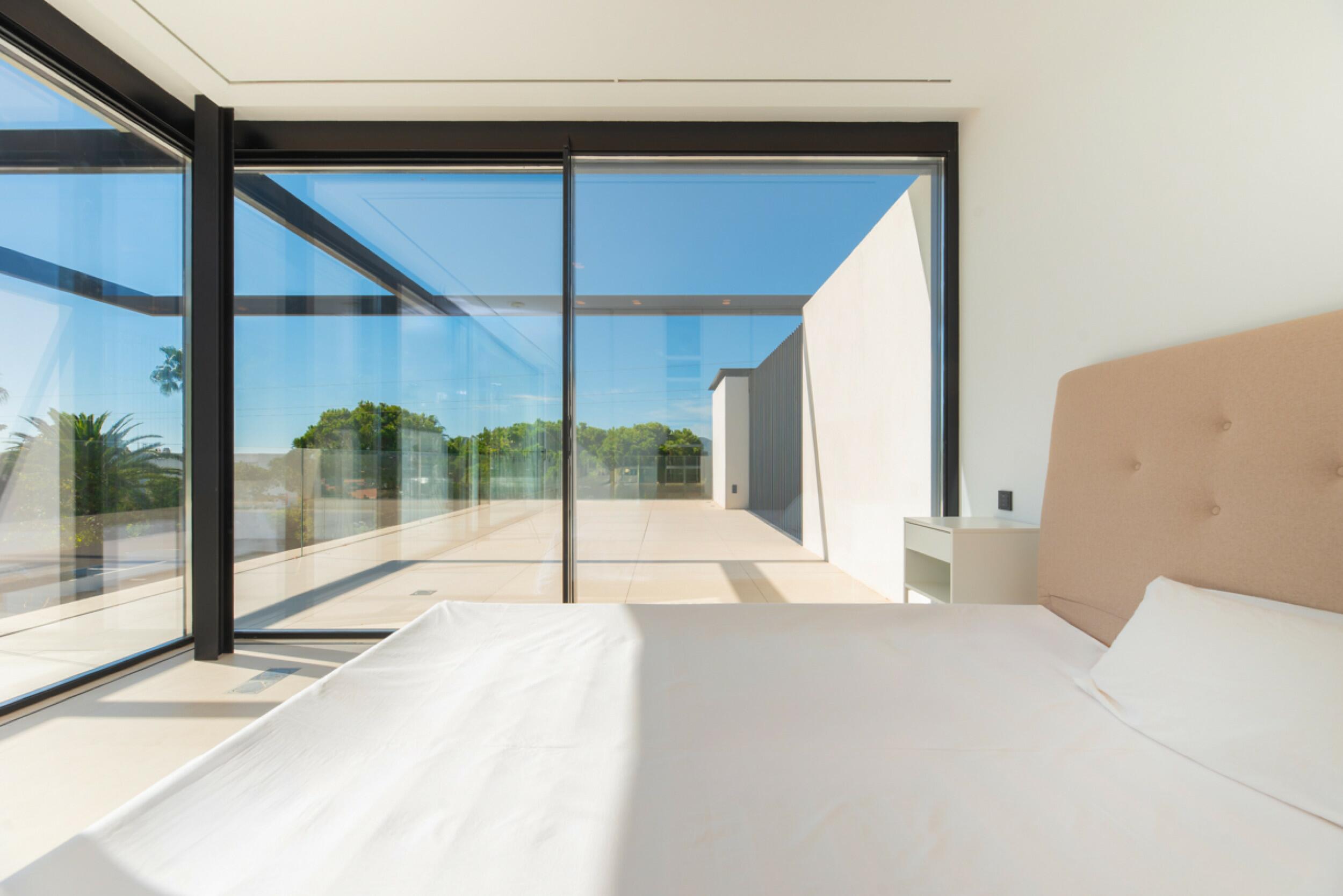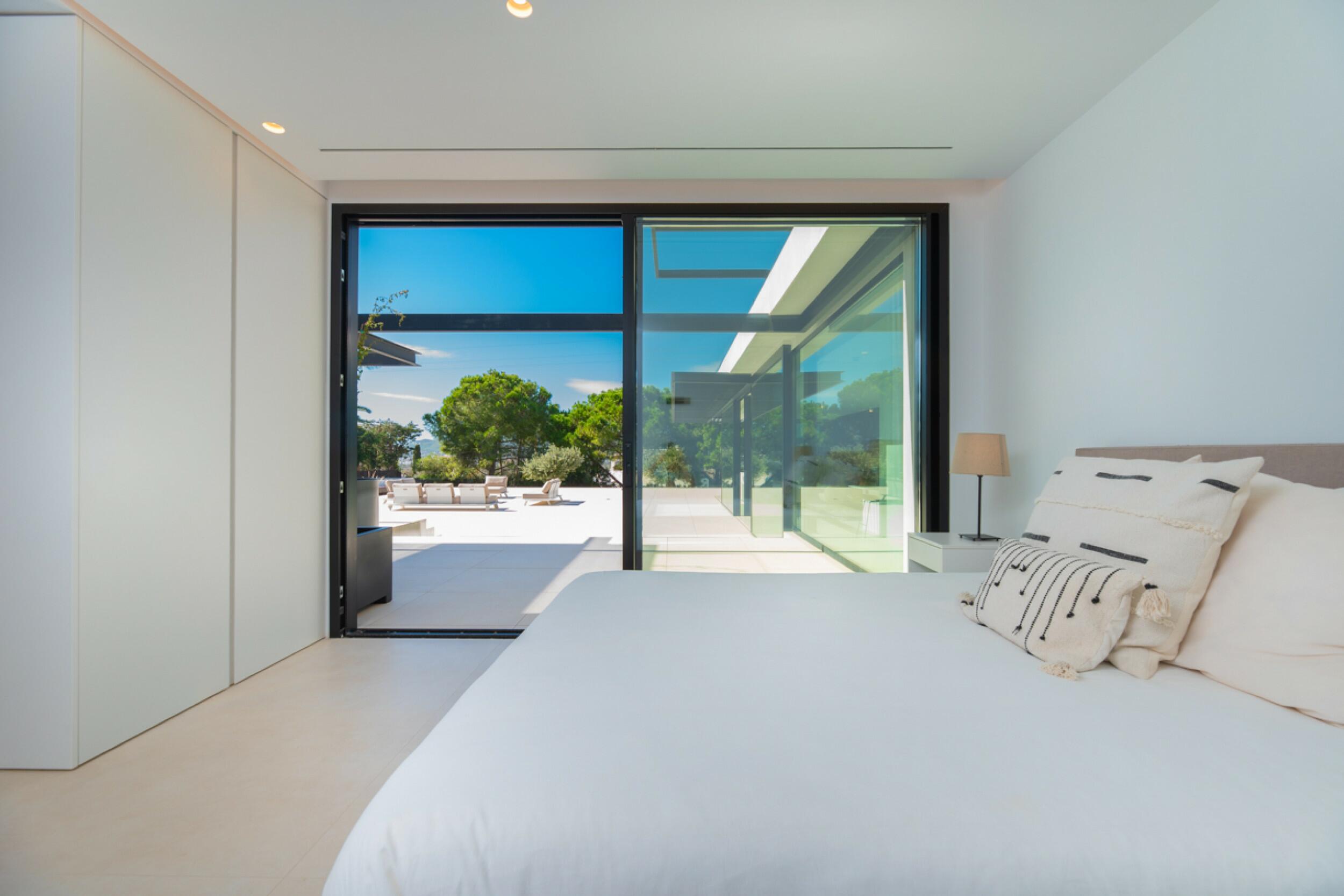 El dormitorio principal está algo apartado de las zonas de estar, se prolonga hasta la piscina y permite disfrutar con las vistas de su posición de privilegio en la parte alta de la parcela. La piscina se funde con el azul profundo del mar y realza todavía más la vista panorámica.