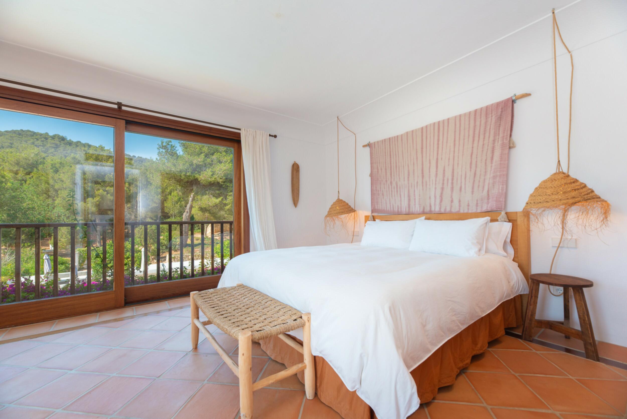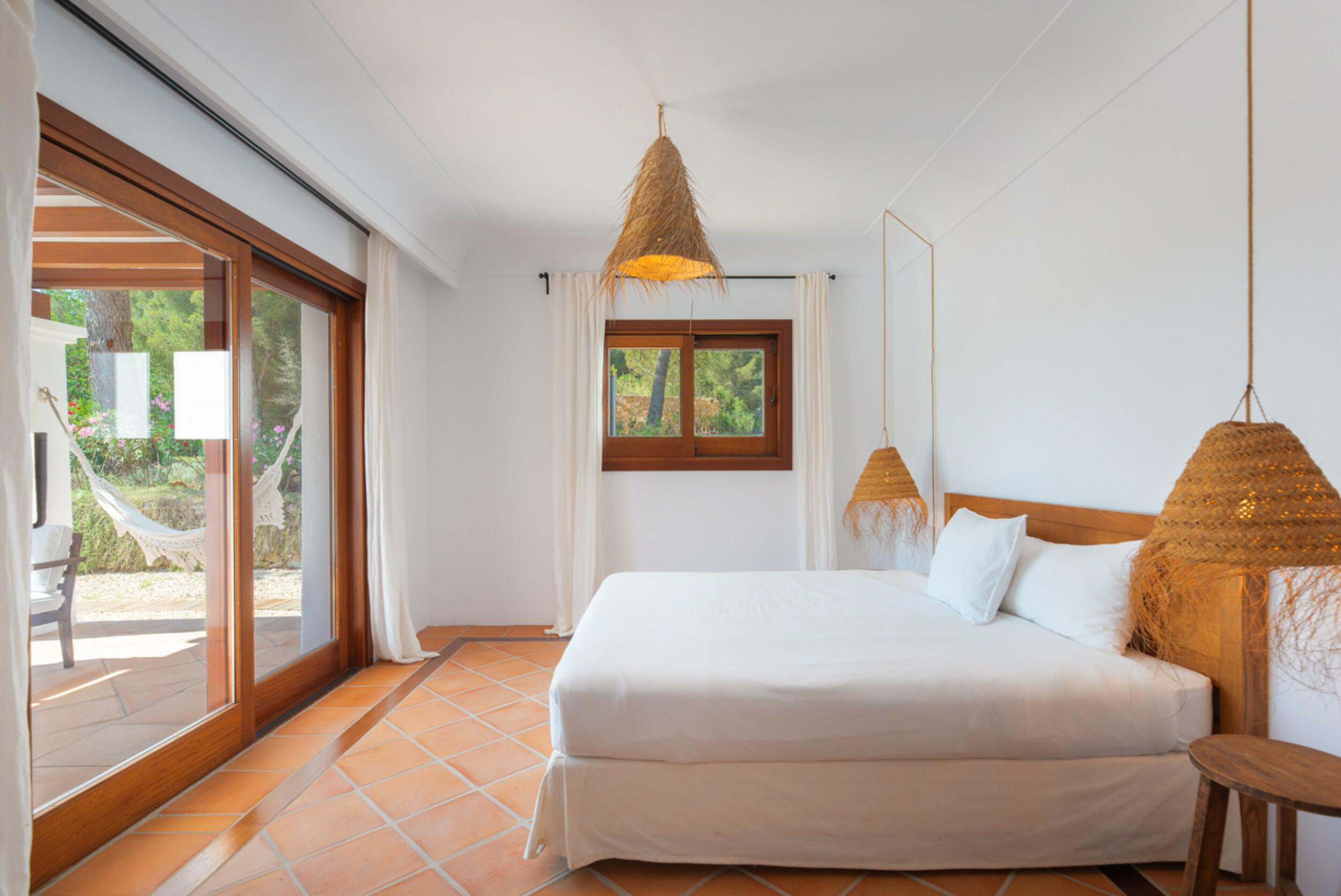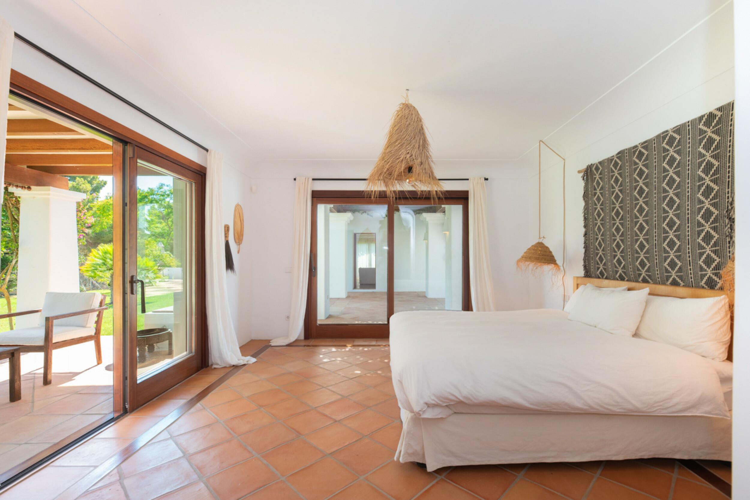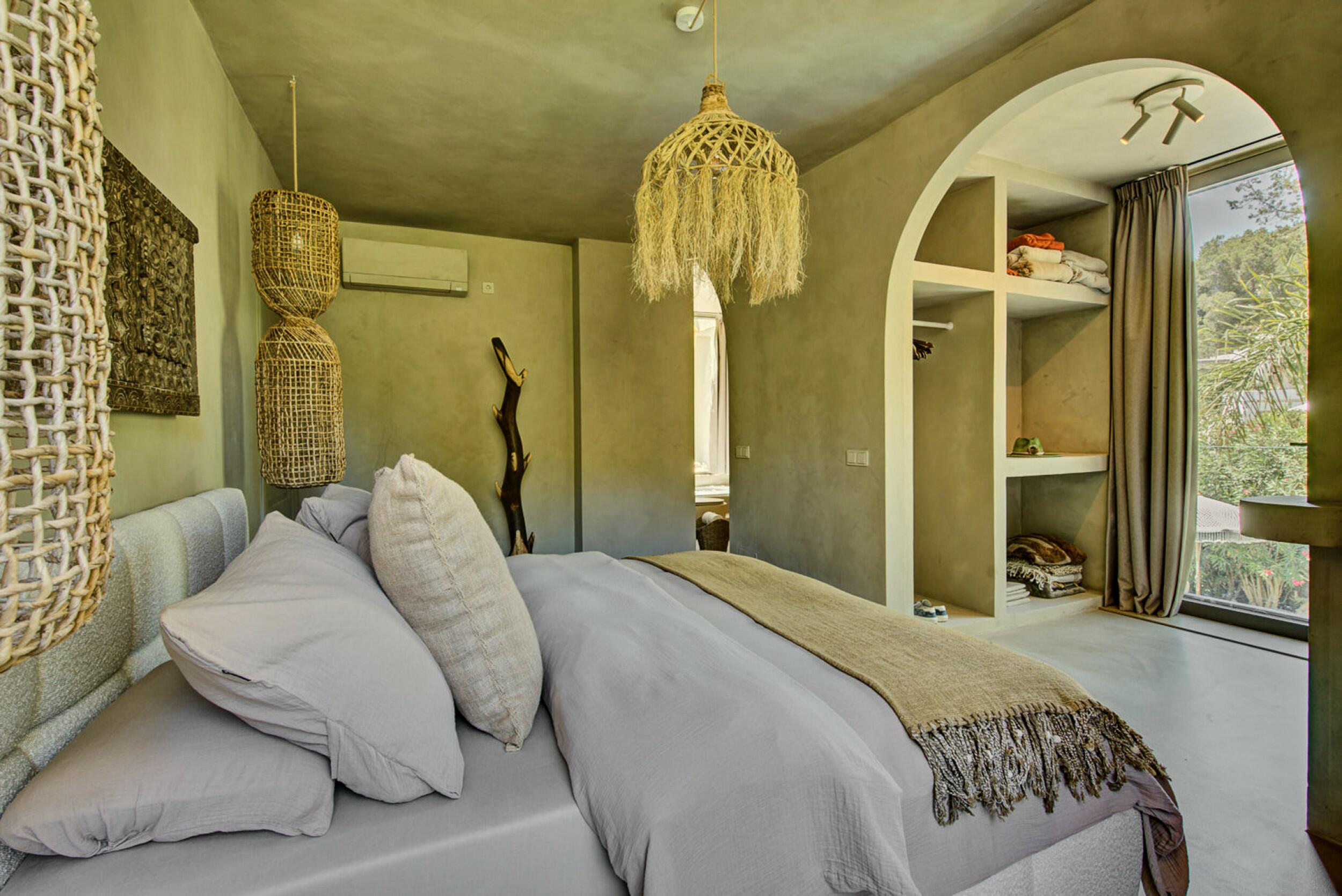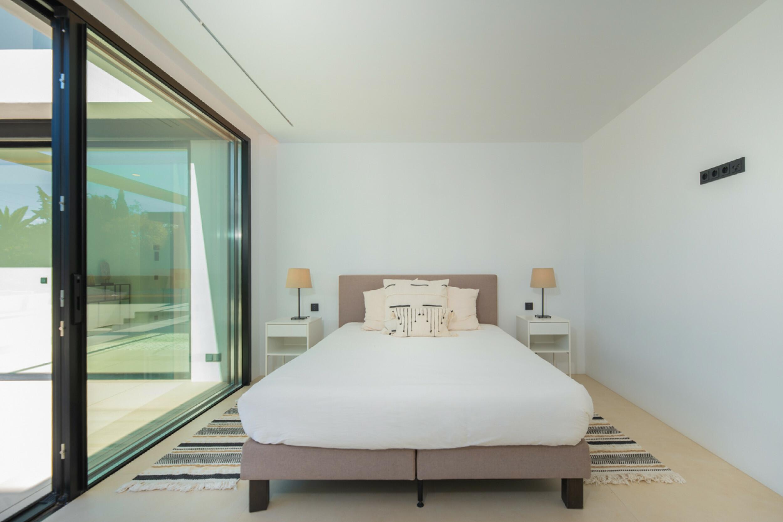 El dormitorio principal está algo apartado de las zonas de estar, se prolonga hasta la piscina y permite disfrutar con las vistas de su posición de privilegio en la parte alta de la parcela. La piscina se funde con el azul profundo del mar y realza todavía más la vista panorámica.
