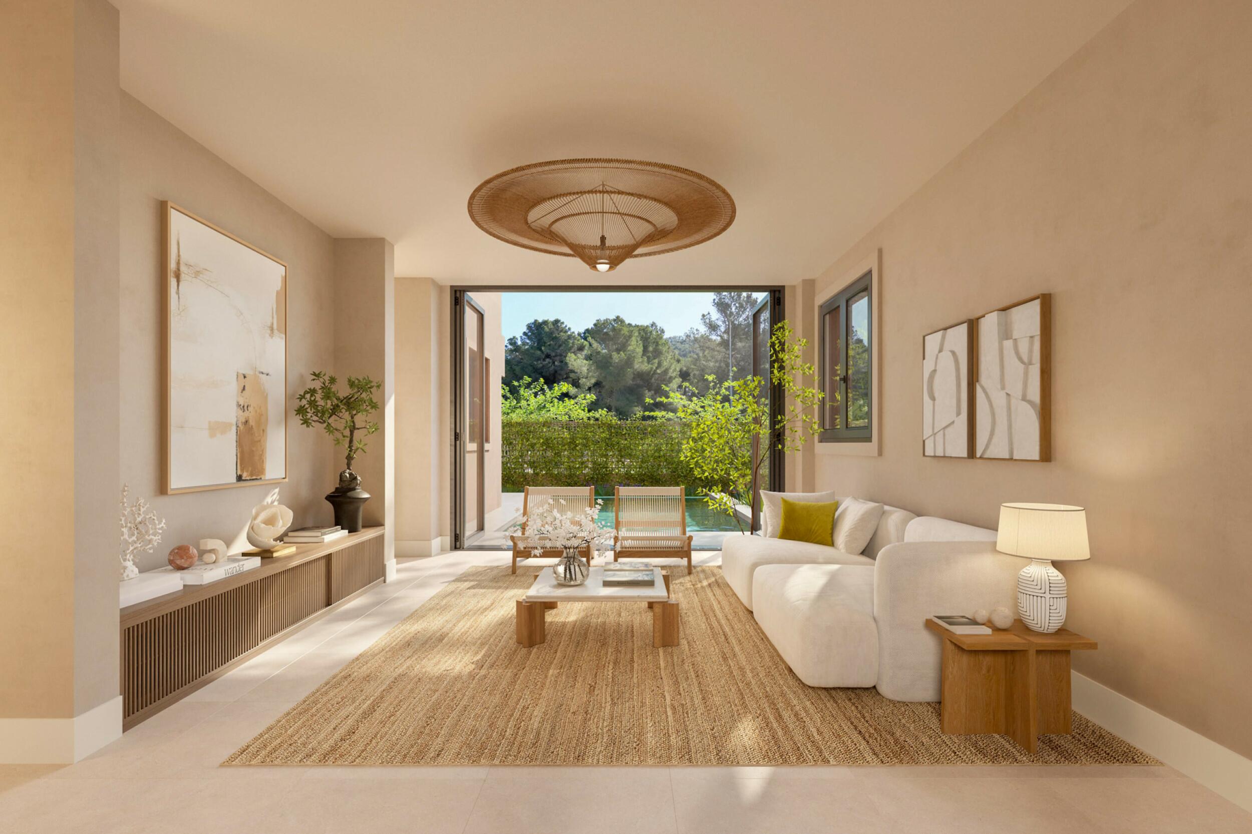 Un magnífico salón con techos muy altos, vistas abiertas a la parte delantera y a un patio que conecta con la zona de la piscina en la parte trasera.