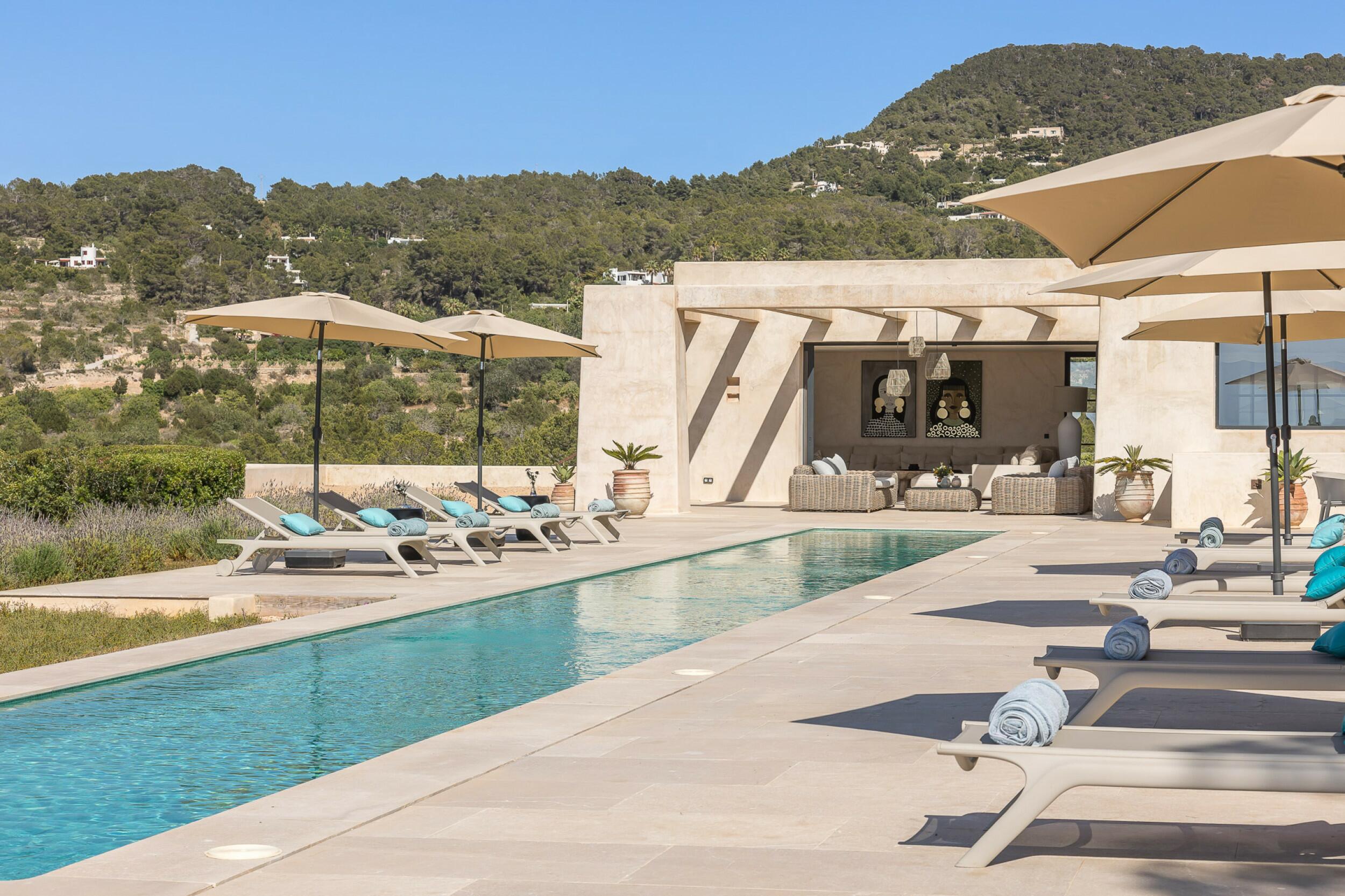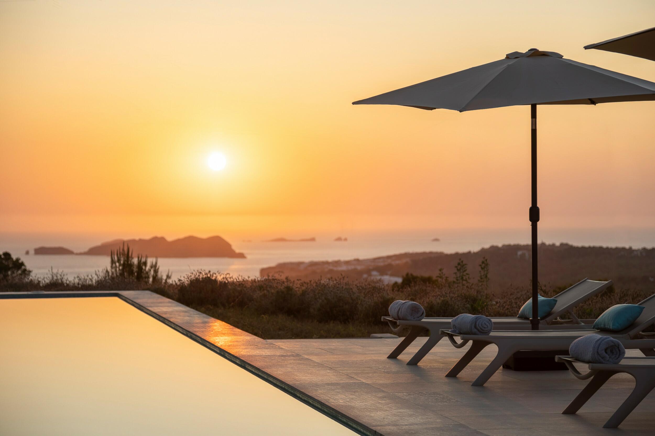 Deléitese con el abrazo de la naturaleza al entrar en su vasto santuario ajardinado. Desde el extenso césped tomamos unos escalones de madera que nos conducen a una piscina privada de 100 m2, centelleante bajo el sol ibicenco y rodeada de tumbonas... aquí, la relajación no tiene límites. Una zona de bar al aire libre y un acogedor espacio para sentarse ofrecen vistas panorámicas al mar, un telón de fondo perfecto para crear recuerdos duraderos con los seres queridos.