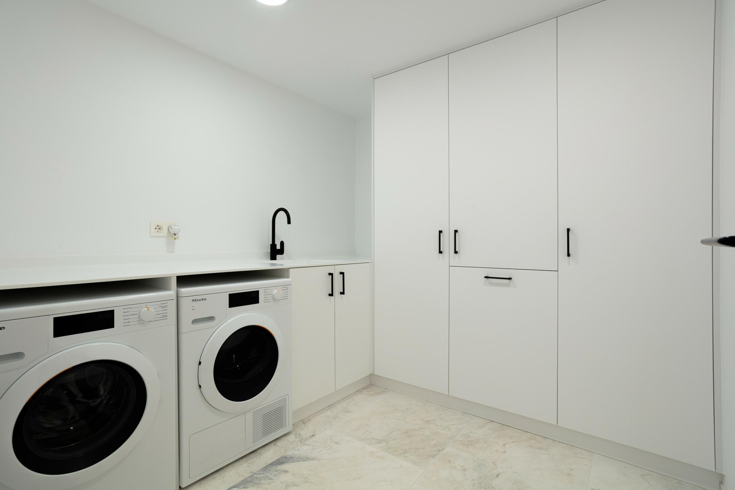 En la planta baja, después de entrar por una entrada majestuosa e histórica, con una altura de 4,8m de techo, y unos materiales dignos del palacio, a la izquierda, nos encontramos la zona de lavandería totalmente equipada. La entrada cuenta con un recibidor, unas escaleras y un ascensor se encuentran al final para el acceso a la planta superior. Más adelante, antes de subir al siguiente nivel, nos encontramos con la sala de máquinas debajo de la escalera y la primera habitación, que puede ser utilizada por el servicio, cuyas dimensiones son de 35m2 incluyendo baño.