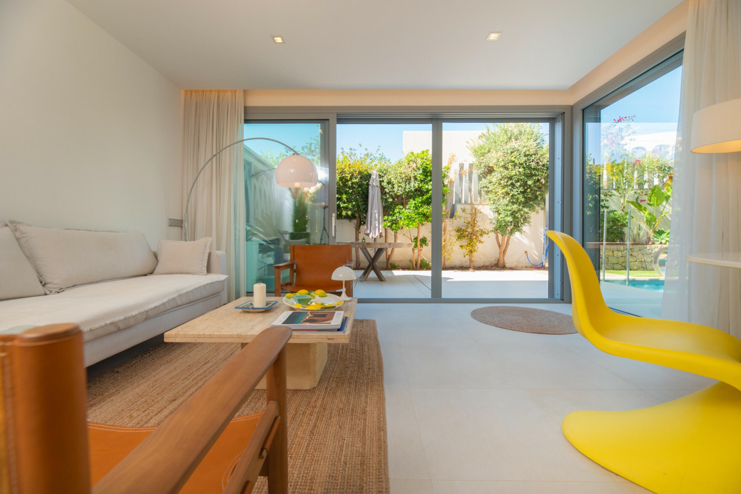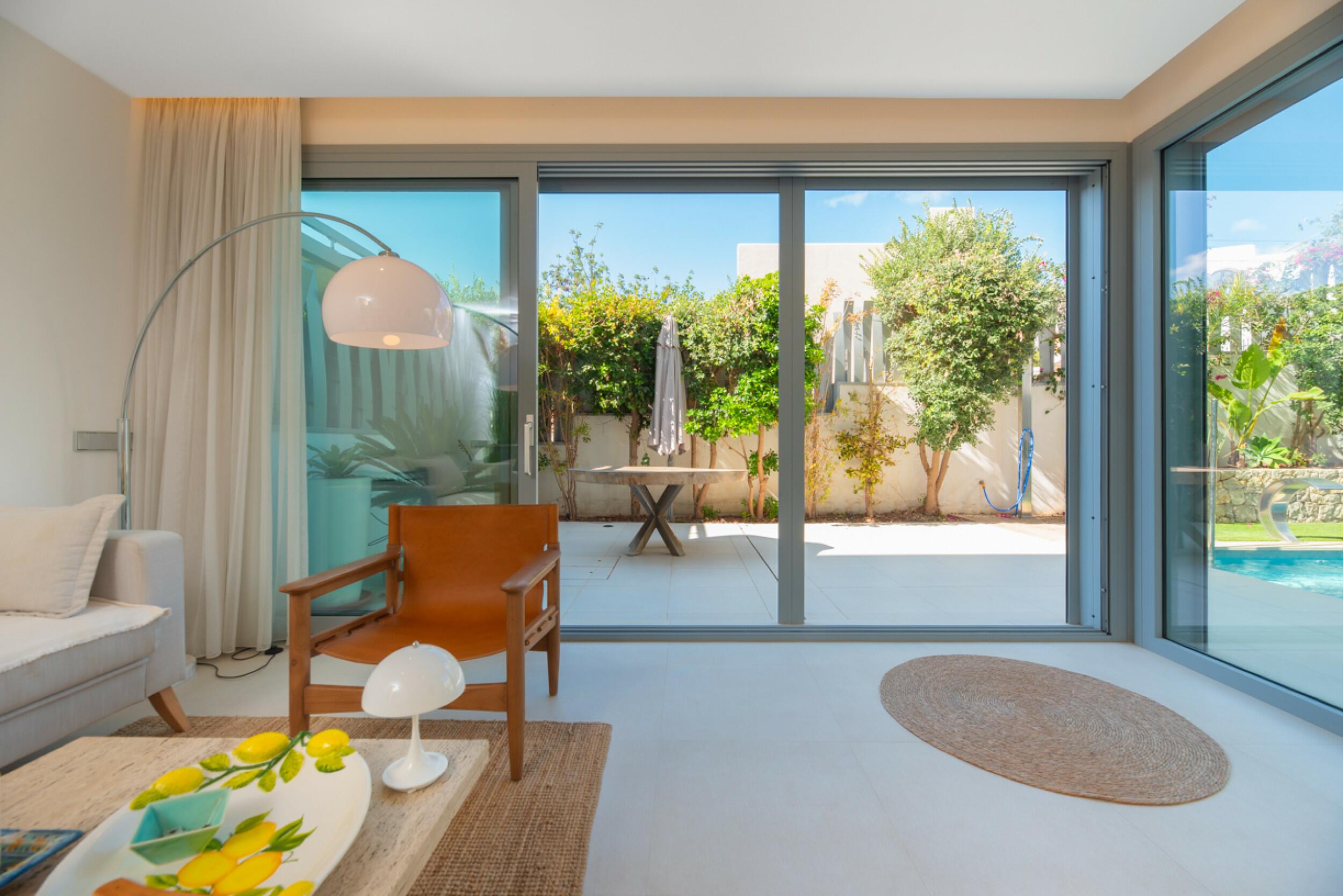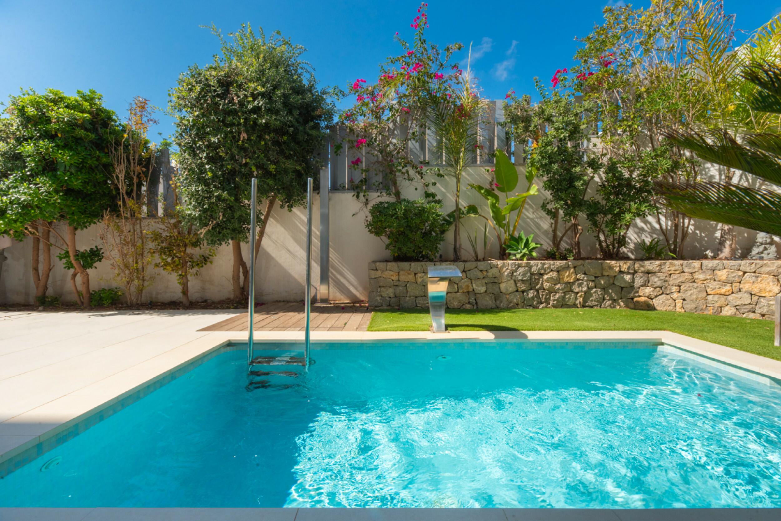 En el proyecto, el exterior de la propiedad está diseñado para maximizar el disfrute de la vida al aire libre, con una piscina de 35 m² y alrededor de 60 m² de pérgolas, perfectas para crear áreas de chill-out o de barbacoa con sombra. Con un total de 240 m² de terrazas descubiertas, esta propiedad ofrece múltiples opciones para relajarse y disfrutar del clima mediterráneo. Además, cuenta con un roof-top que brinda un área adicional para relajarse, desde donde se puede aprovechar al máximo el entorno natural y las vistas panorámicas. El terreno, que es completamente llano, tiene una mezcla de tierra agrícola roja con árboles frutales y una pequeña área de bosque que añade encanto natural al entorno y lo convierte en un espacio ideal para crear un jardín, un huerto o cualquier proyecto que se desee desarrollar. La propiedad estará completamente vallada con una valla de alta calidad, lo que garantiza privacidad y seguridad en todo el terreno, mientras se mantiene en armonía con el entorno natural.
