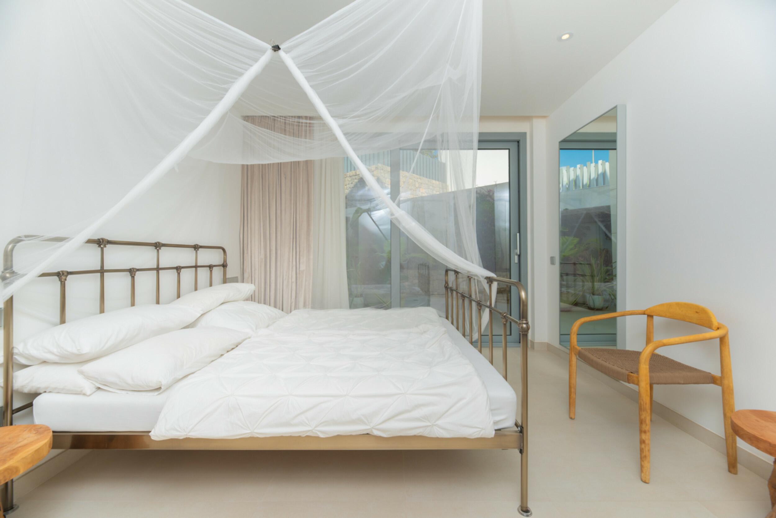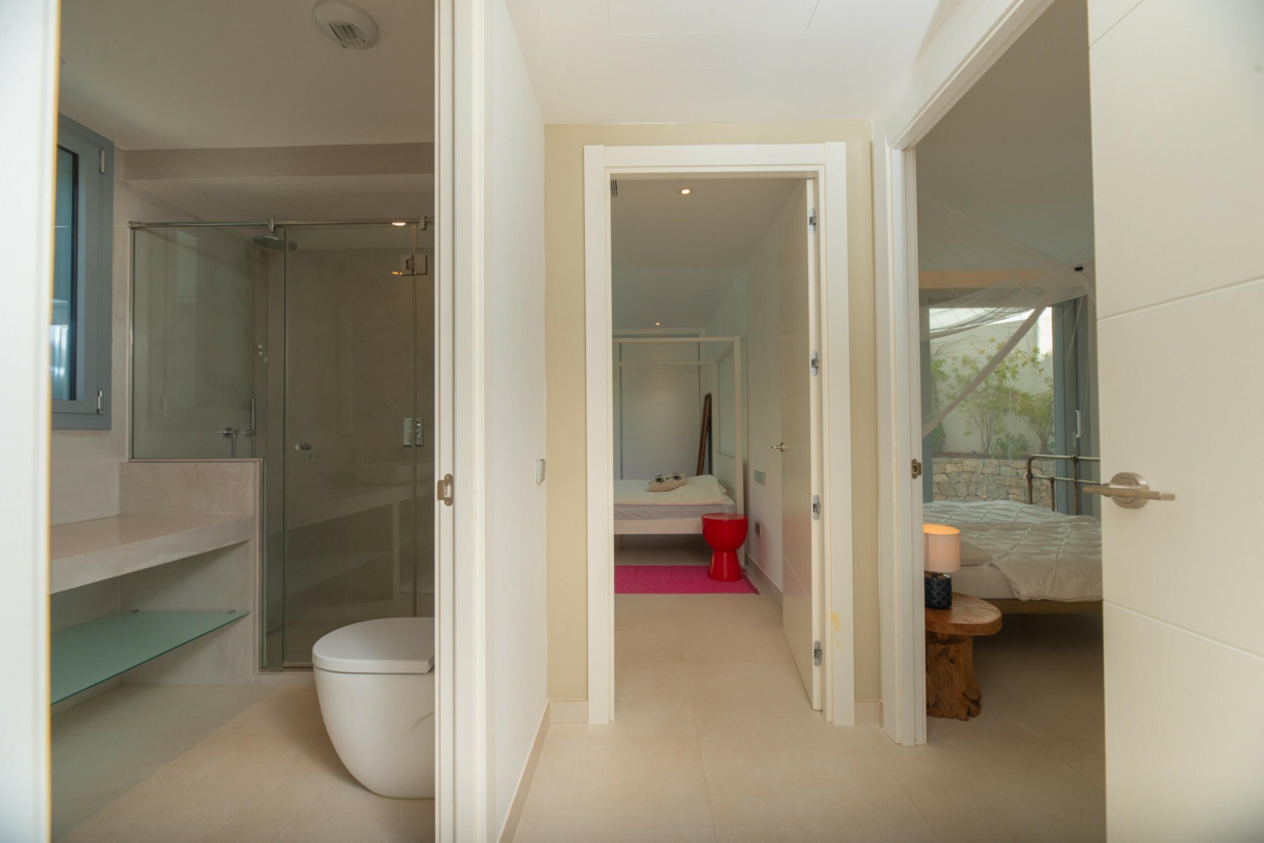 La villa proyectada se distribuye en una única planta y consta de una casa principal de 210 m² y un anexo de 32 m². La casa principal dispone de un elegante hall de entrada, una cocina abierta de diseño moderno y generoso espacio, un acogedor comedor y un salón lleno de luz natural. Además, cuenta con tres dormitorios bien distribuidos para ofrecer confort y privacidad. Dos de ellos cuentan con baños en suite con ducha y armarios empotrados, mientras que la master suite tiene un baño en suite con bañera y un vestidor. Cada dormitorio dispone de una terraza privada.