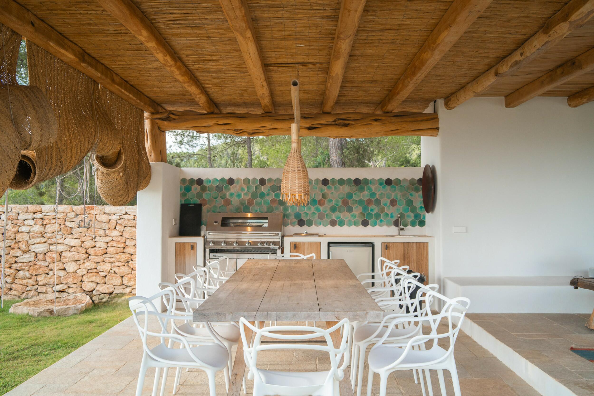 El área exterior cuenta con una variedad de instalaciones de ocio y bienestar, incluyendo una espaciosa piscina de 120 m² rodeada de césped verde y numerosas palmeras, un jacuzzi climatizado, una cancha de voleibol, una zona de fútbol infantil, un gran trampolín y una tranquila plataforma de yoga. Un jardín de vegetales bien cuidado y un cobertizo para herramientas complementan la vegetación, que incluye 90 olivos (para la producción de aceite de oliva privado) y varios naranjos. El área del pabellón es el centro de entretenimiento de la propiedad y cuenta con una cocina exterior totalmente equipada con tres frigoríficos, dos lavavajillas, una placa de inducción (con conexión a gas disponible), un horno para pizza/pan, barbacoa y cocinero de paella. Esta área es ideal para comidas al aire libre y actualmente incluye un gimnasio exterior, área de ping pong y un baño exterior. También hay un espacio de almacenamiento dedicado para equipos de playa, y varias cisternas debajo del pabellón aseguran una excelente gestión del agua para la propiedad.