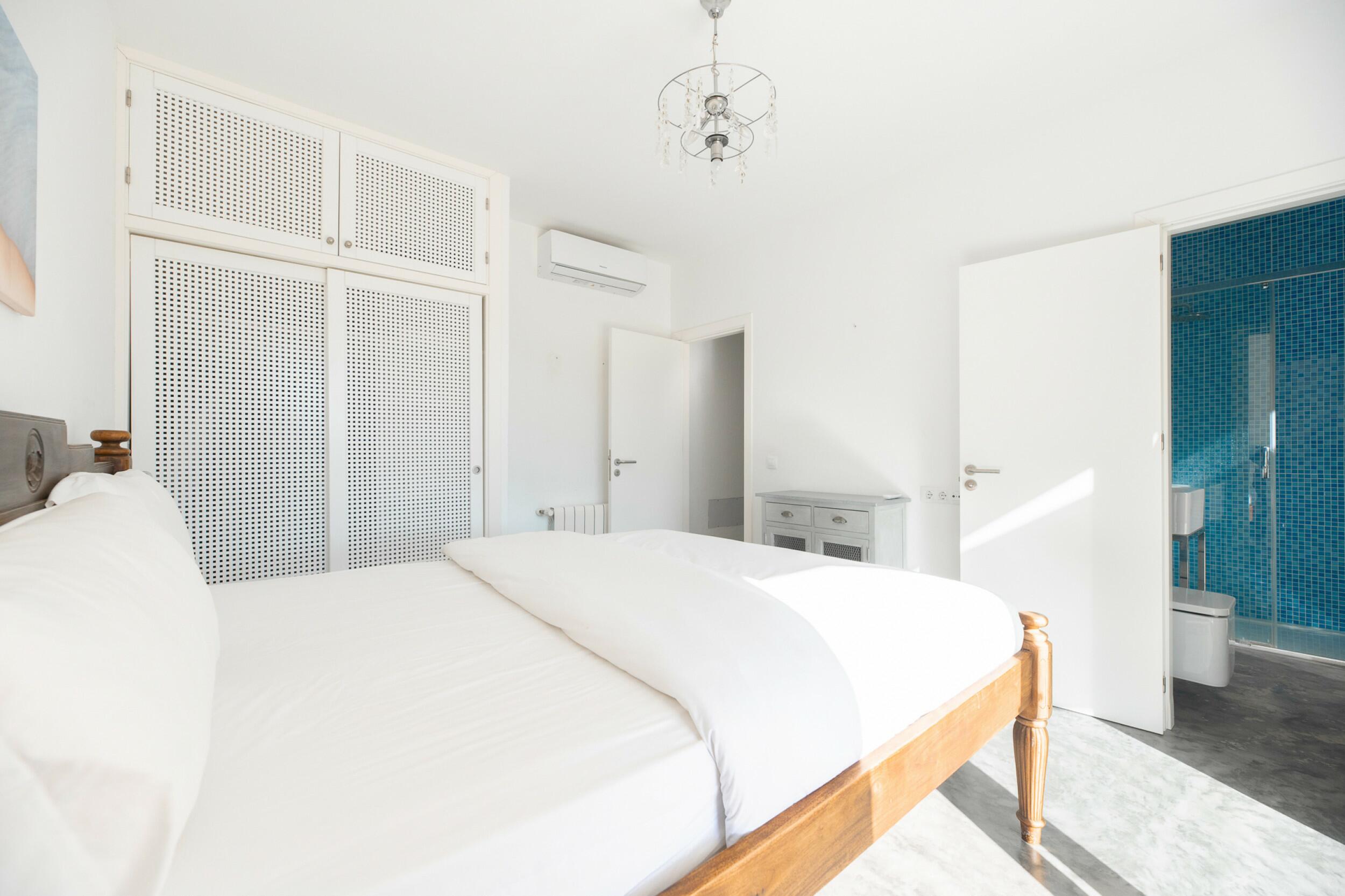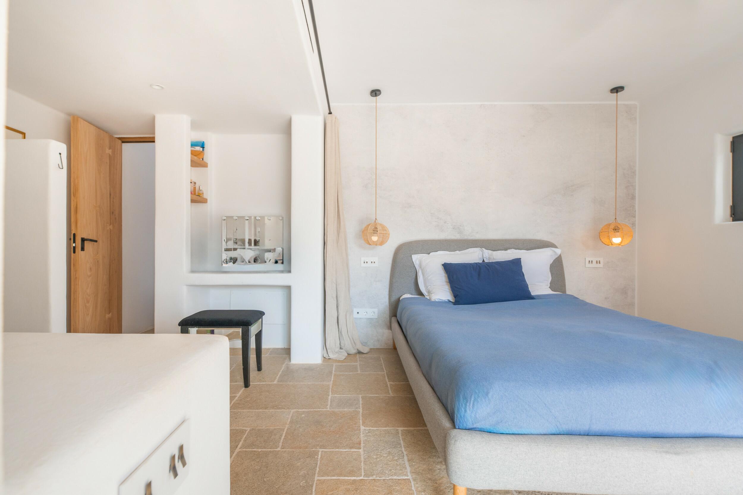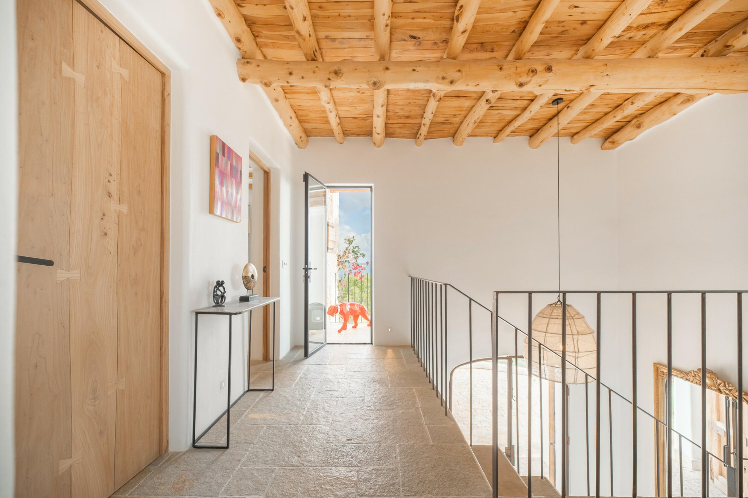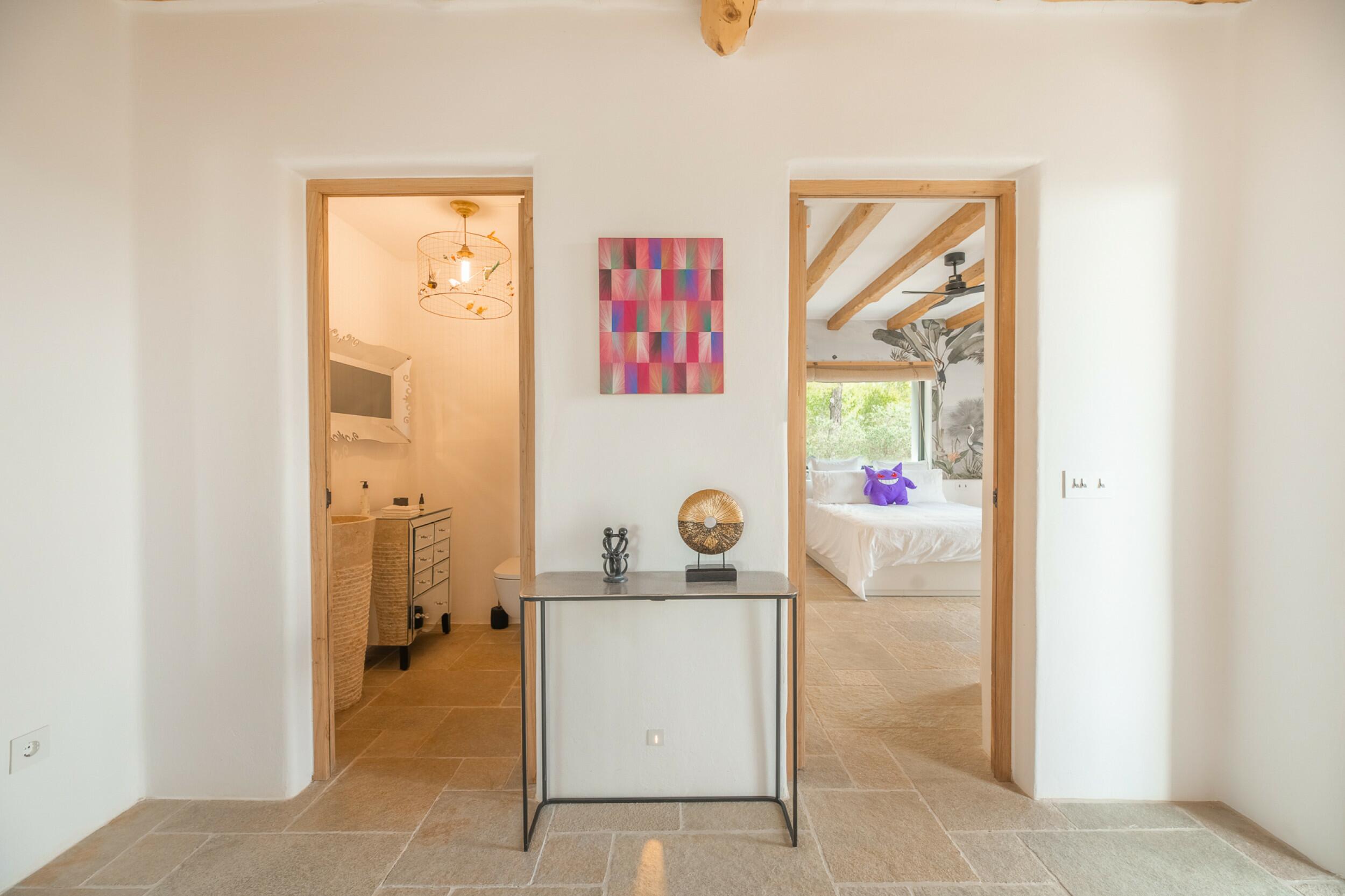 La primera planta cuenta con un total de cuatro dormitorios dobles en suite, uno de los cuales tiene acceso directo a una terraza que conduce a la azotea. Un espacioso distribuidor con área de oficina integrada añade funcionalidad a este nivel. La joya de la planta es la amplia suite principal, que cuenta con chimenea propia, balcón privado, vistas a Dalt Vila, un lujoso baño en suite con bañera y ducha, y un generoso vestidor. También ofrece acceso directo a otro dormitorio doble en suite, ideal para usar como habitación infantil, oficina privada o alojamiento para invitados.