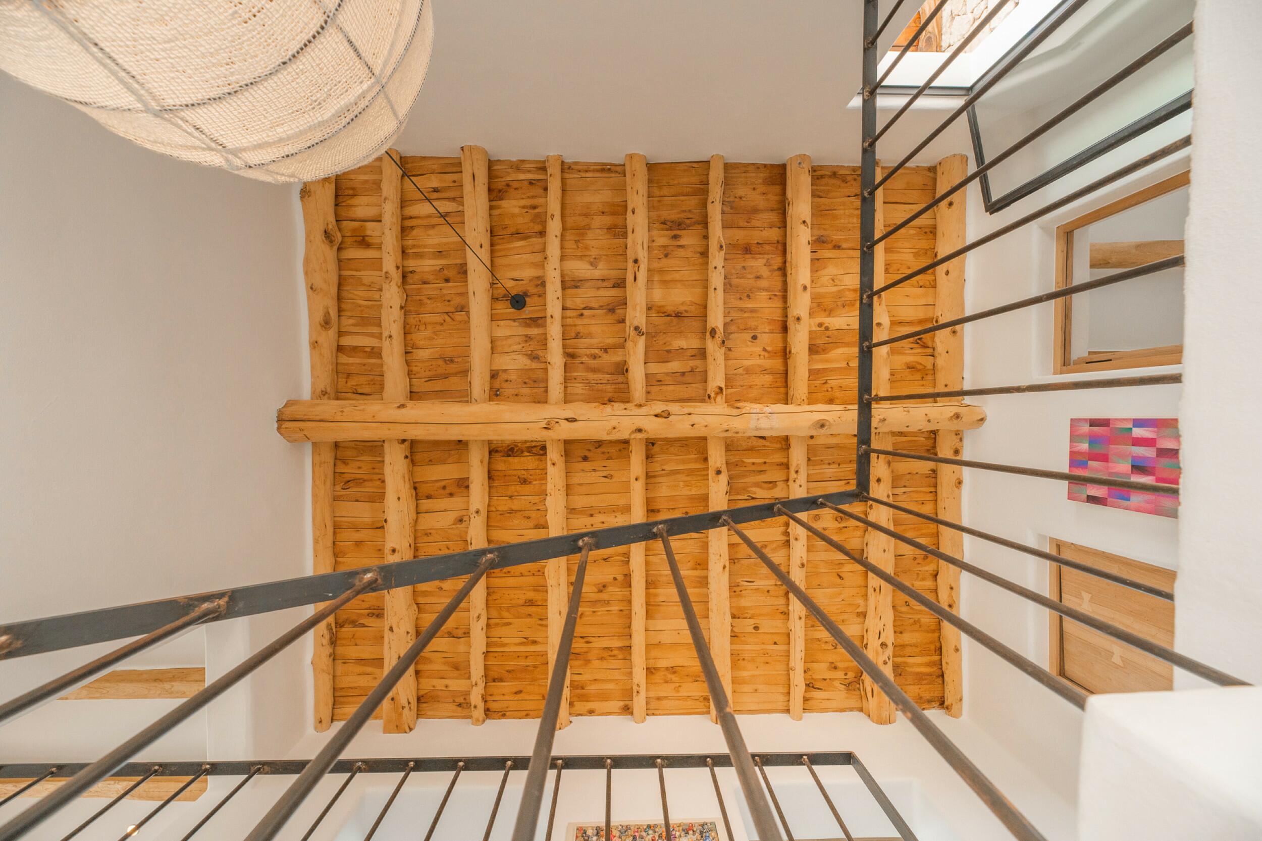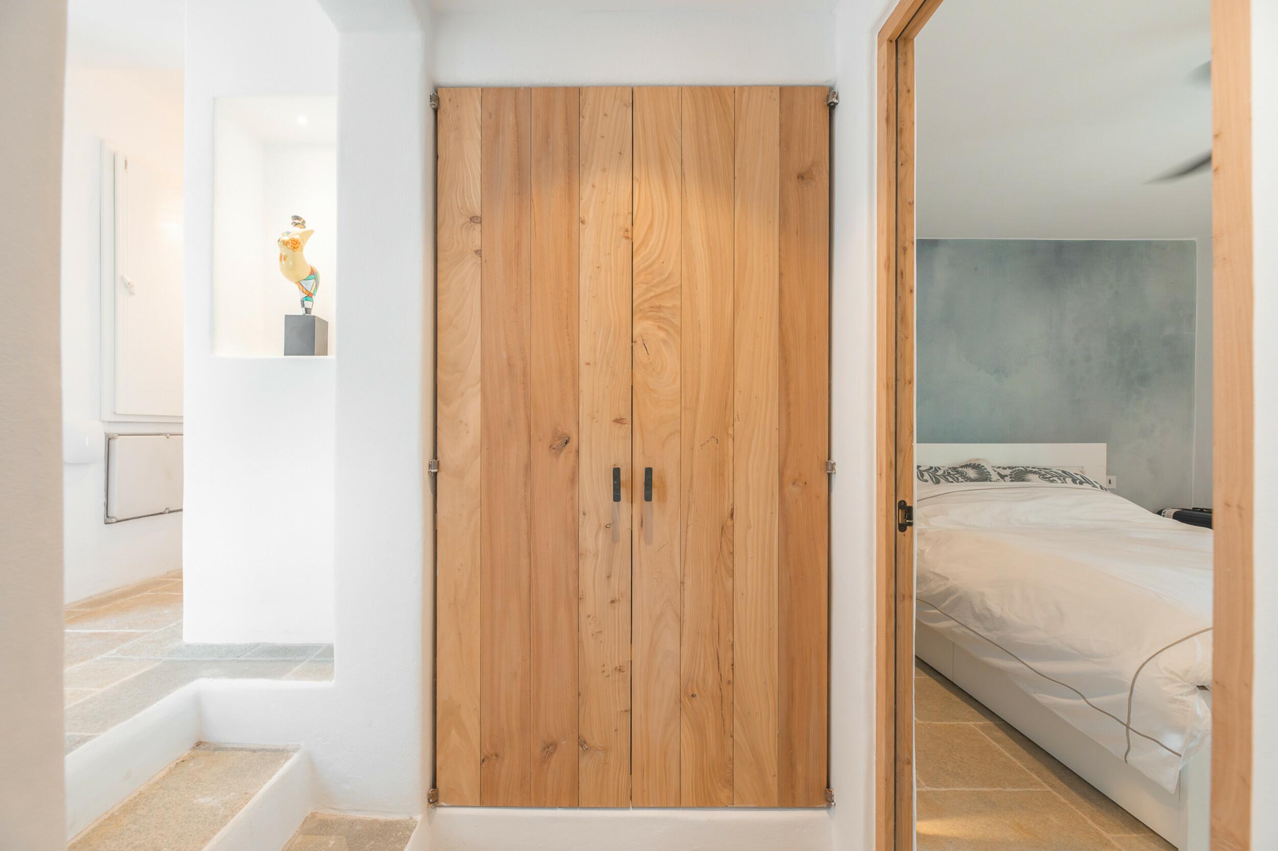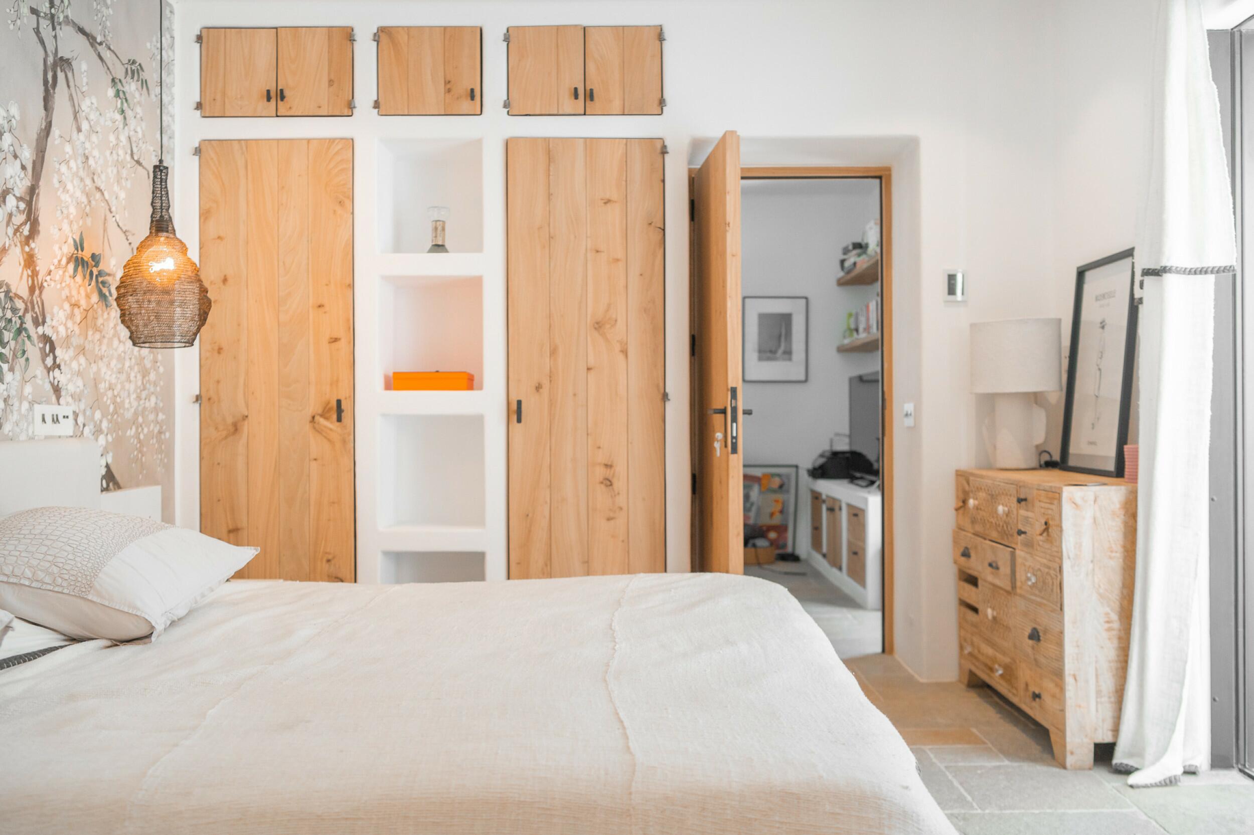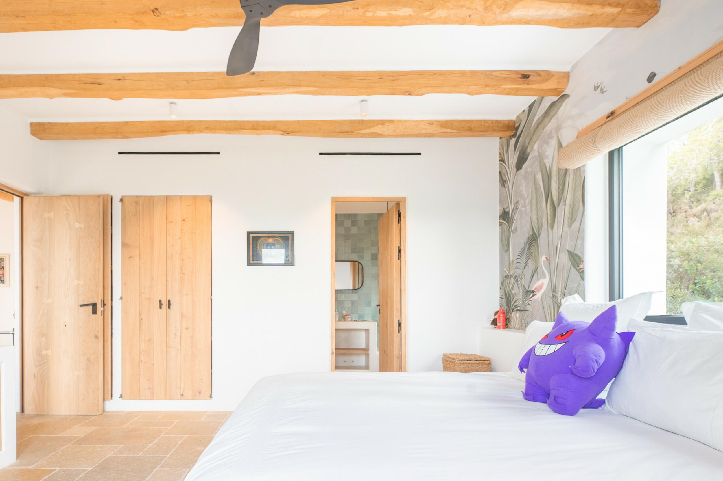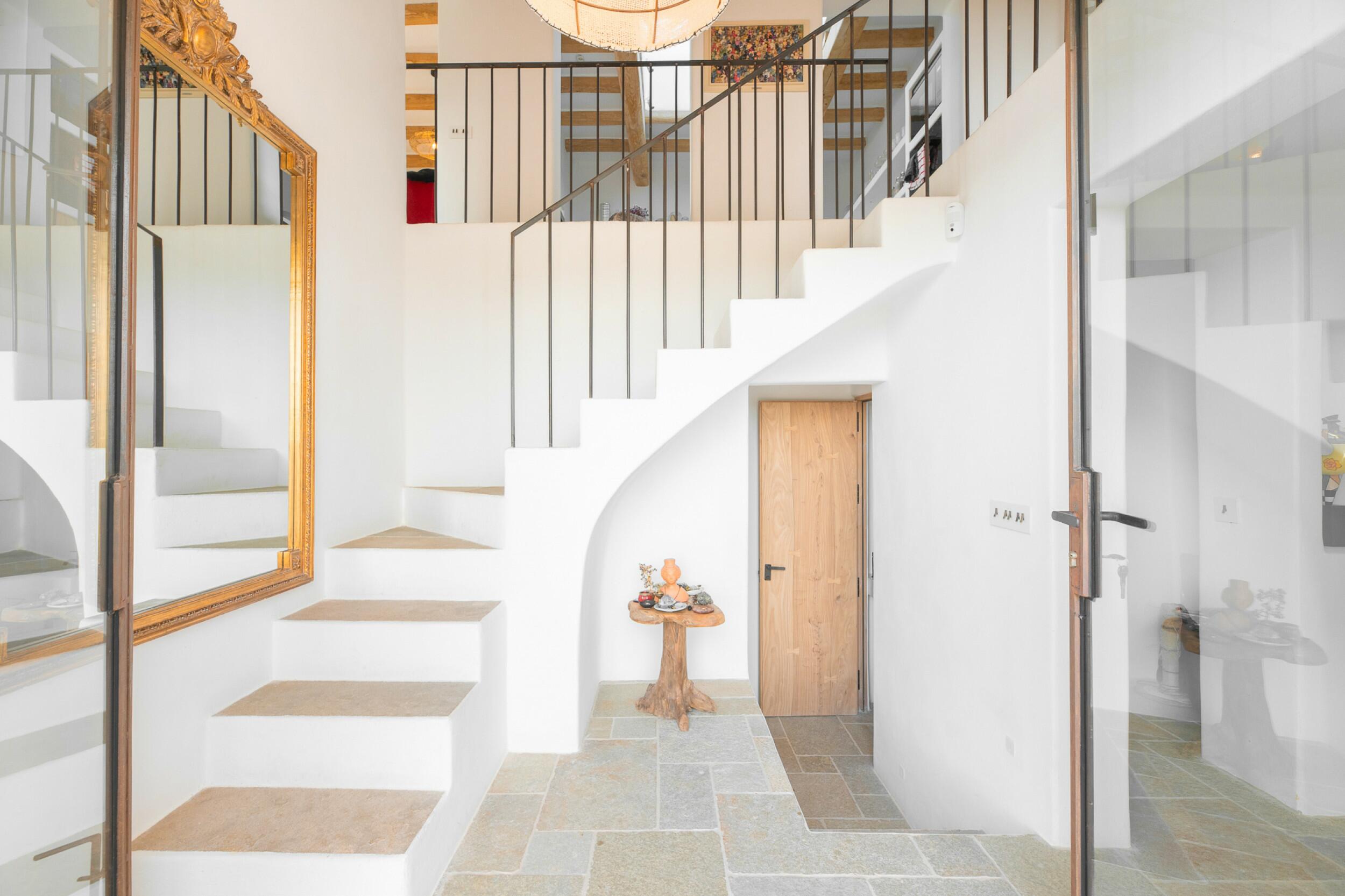 La primera planta cuenta con un total de cuatro dormitorios dobles en suite, uno de los cuales tiene acceso directo a una terraza que conduce a la azotea. Un espacioso distribuidor con área de oficina integrada añade funcionalidad a este nivel. La joya de la planta es la amplia suite principal, que cuenta con chimenea propia, balcón privado, vistas a Dalt Vila, un lujoso baño en suite con bañera y ducha, y un generoso vestidor. También ofrece acceso directo a otro dormitorio doble en suite, ideal para usar como habitación infantil, oficina privada o alojamiento para invitados.