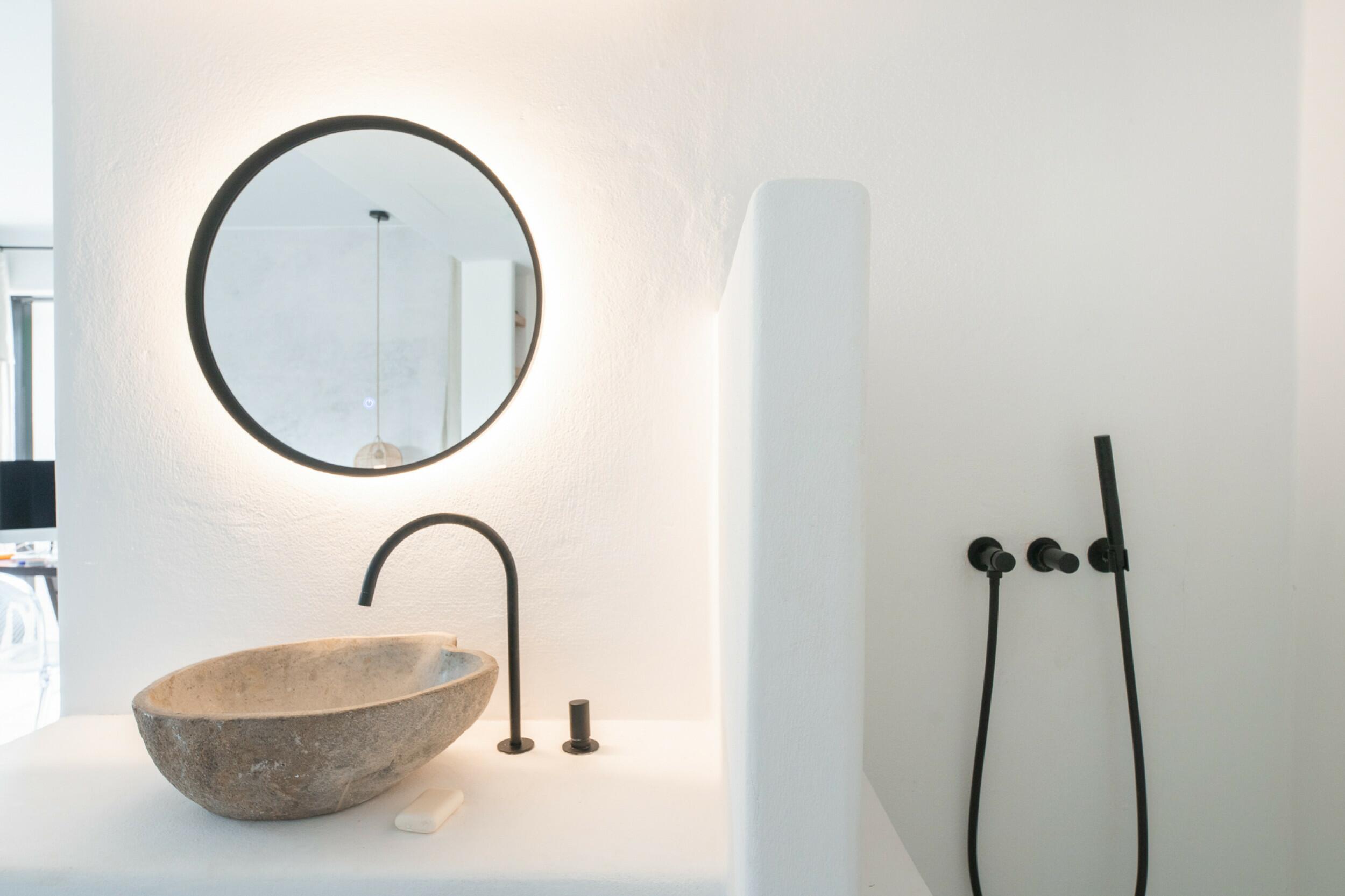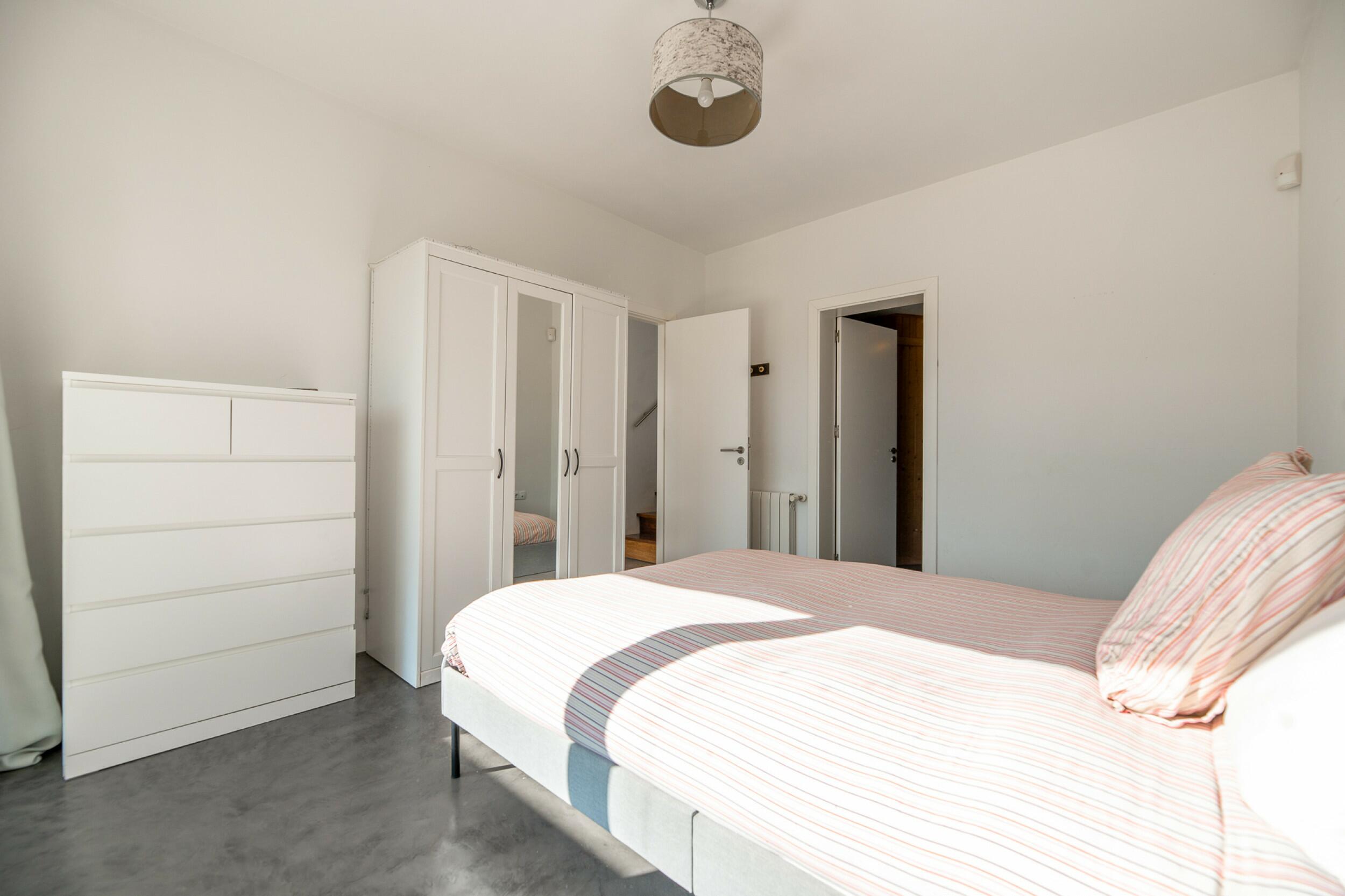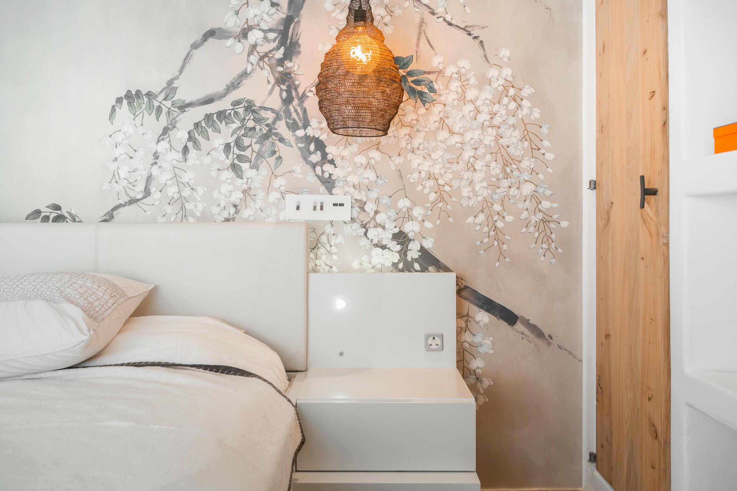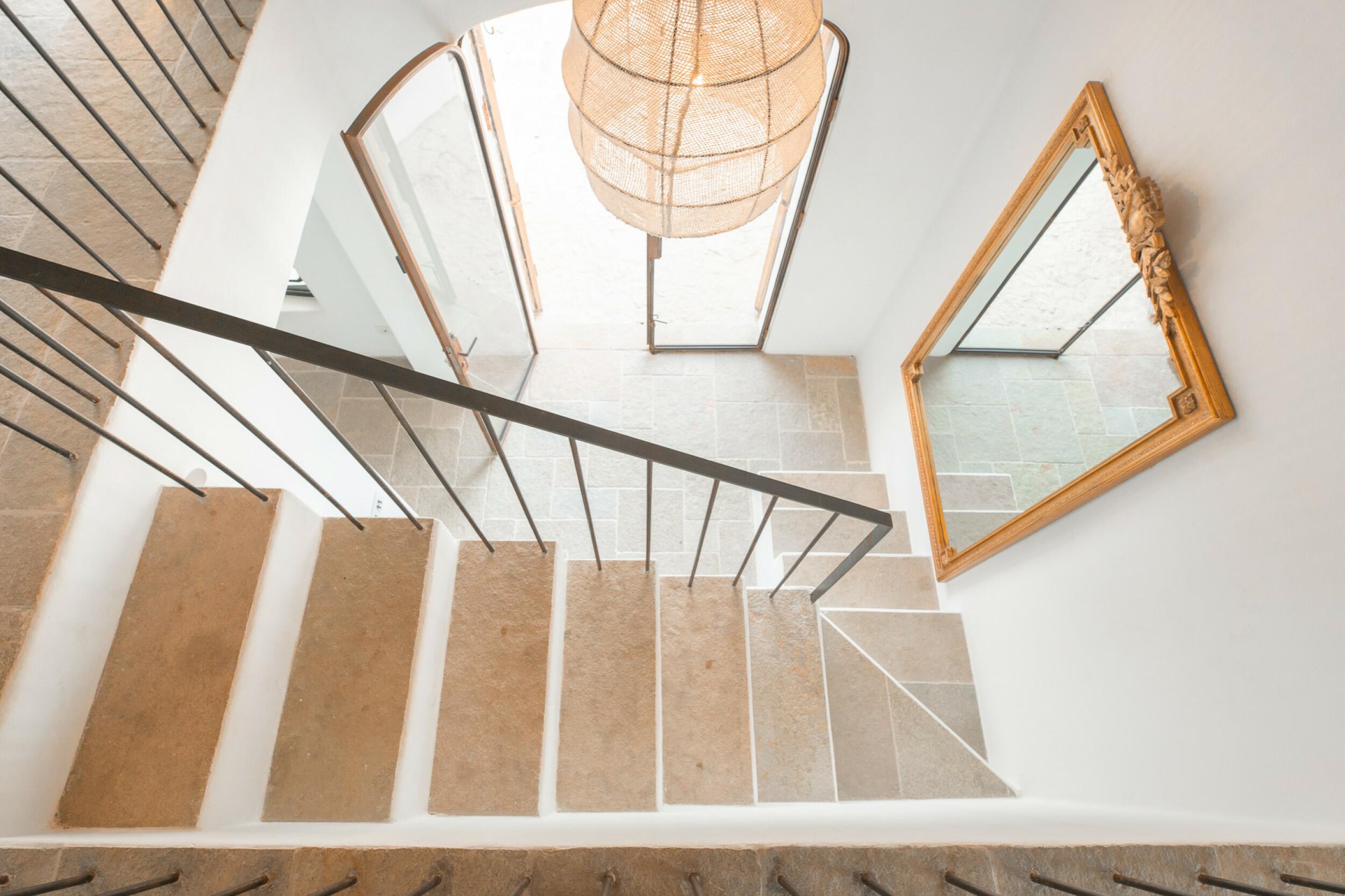 La primera planta cuenta con un total de cuatro dormitorios dobles en suite, uno de los cuales tiene acceso directo a una terraza que conduce a la azotea. Un espacioso distribuidor con área de oficina integrada añade funcionalidad a este nivel. La joya de la planta es la amplia suite principal, que cuenta con chimenea propia, balcón privado, vistas a Dalt Vila, un lujoso baño en suite con bañera y ducha, y un generoso vestidor. También ofrece acceso directo a otro dormitorio doble en suite, ideal para usar como habitación infantil, oficina privada o alojamiento para invitados.