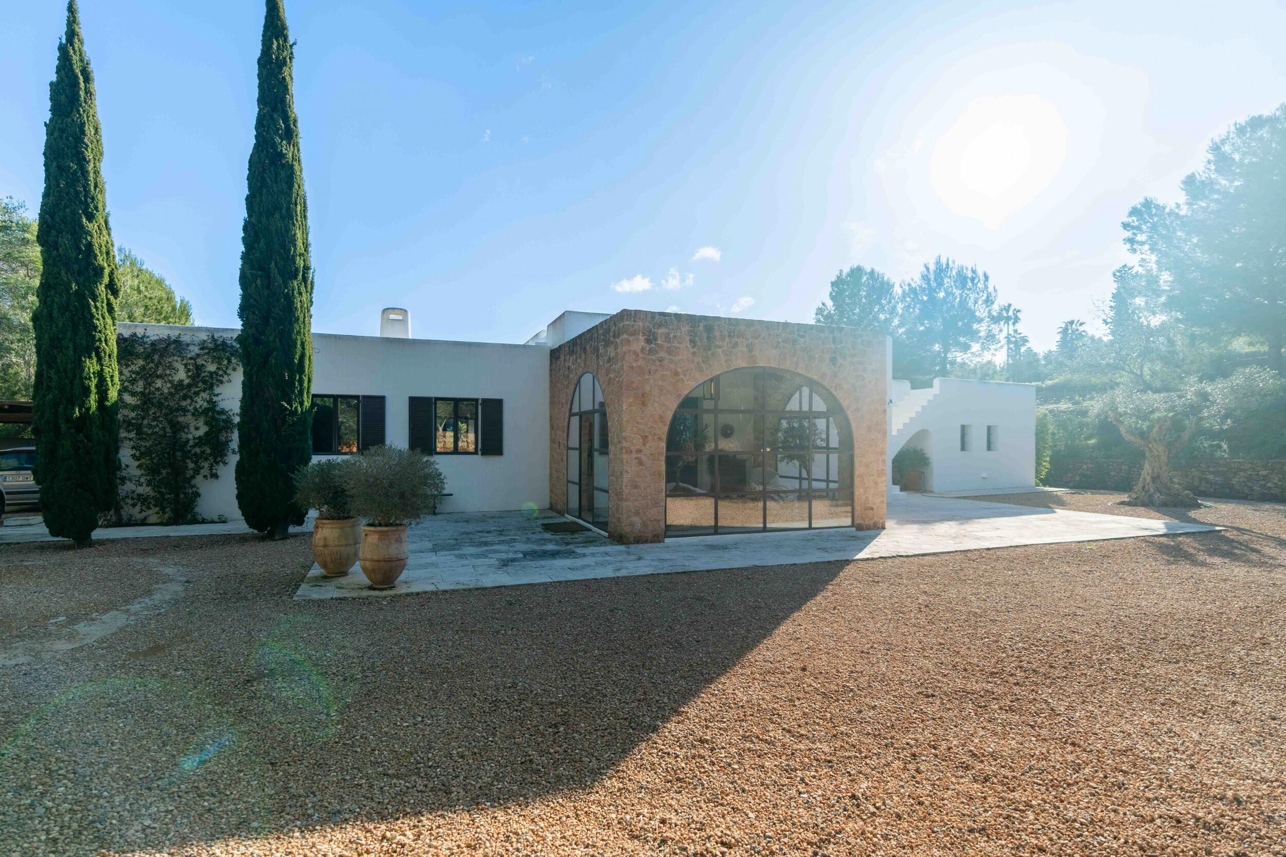 La "Finca Golf" es una finca con 150 años de historia, una joya inmobiliaria que Prestige Properties tiene el privilegio de presentar, rara vez disponible en el mercado. Esta propiedad excepcional combina magistralmente el auténtico encanto ibicenco con una posición elevada y tranquila, situado directamente en el prestigioso y único campo de golf de la isla. Cuidadosamente restaurada y ubicada en un generoso terreno de cerca 5.500 m², ofrece una rara combinación de privacidad, carácter y proximidad, a solo un paso de los fairways del golf. Idealmente situada a pocos minutos de las playas de arena de Santa Eulalia y a un corto trayecto en coche de la vibrante ciudad de Ibiza. La finca es perfecta para vivir todo el año o para escapadas de verano inolvidables. La finca abarca aproximadamente 400 m² y se compone de una casa principal, un zona de invitados independiente y un apartamento de invitados completamente equipado. Una licencia de alquiler válida permite hasta 8 huéspedes, aunque el diseño acomoda cómodamente hasta 10 residentes, lo que la convierte en una excelente oportunidad tanto para uso privado como para alquileres vacacionales generadores de ingresos.