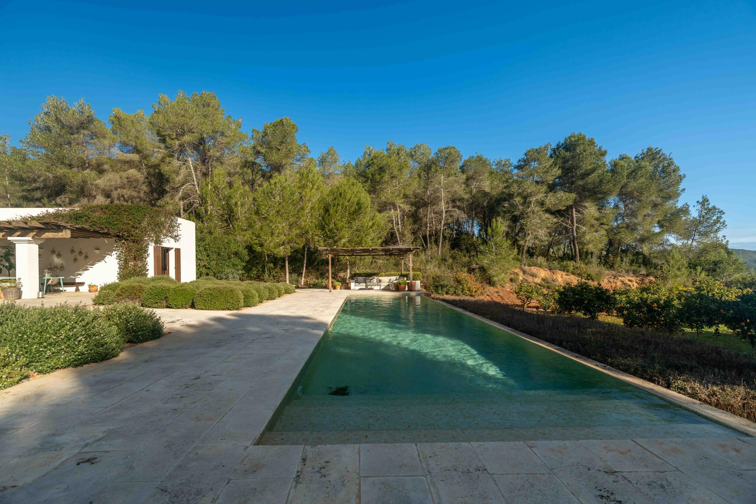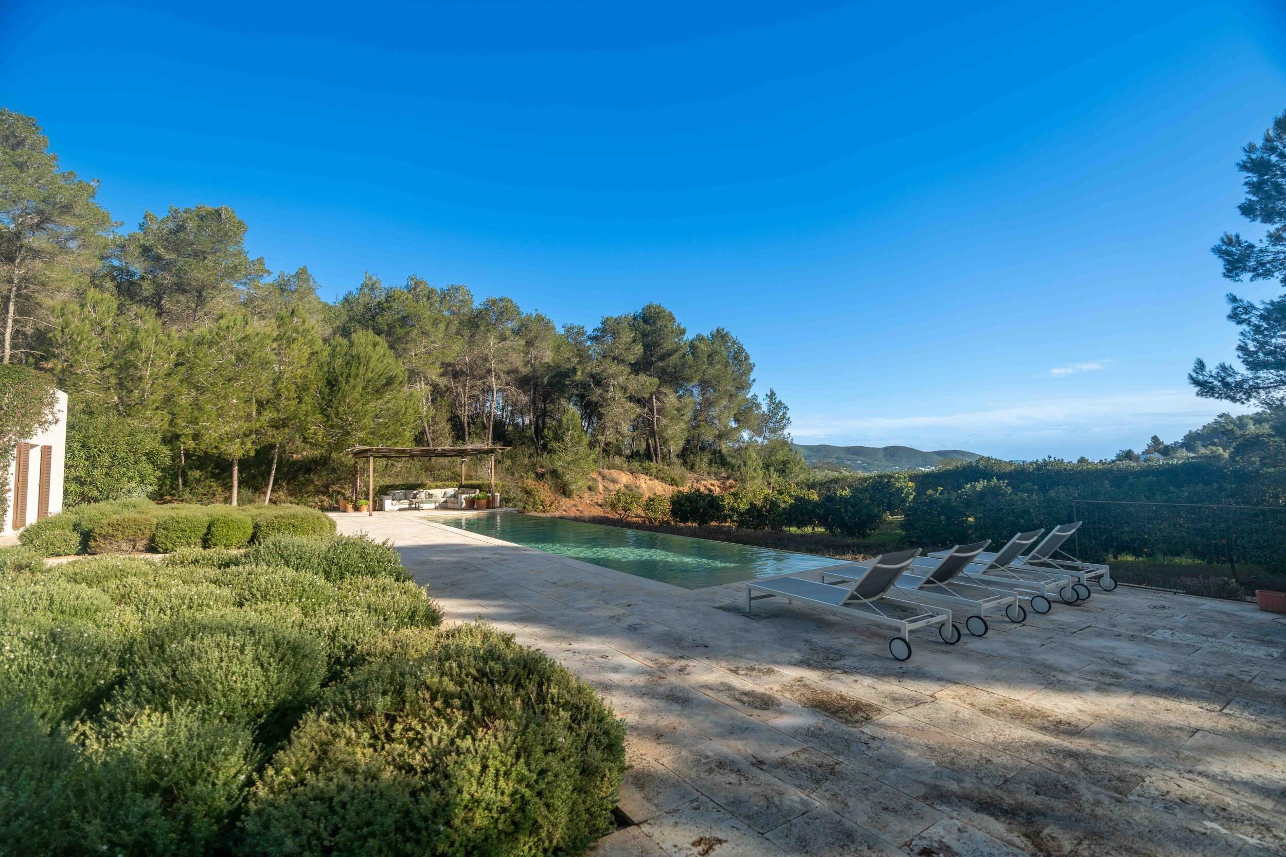 La finca está ubicada en un área tranquila en la costa este de Ibiza, ofreciendo un entorno altamente aislado y privado. Una de las características más distintivas de la propiedad es su excepcional proximidad a los fairways del Club de Golf de Ibiza, a solo un breve paseo de 3 minutos, lo que la convierte en una elección destacada para los entusiastas del golf. A pesar de su ubicación tranquila, la finca sigue estando bien conectada: Santa Eulalia está a solo 10 minutos en coche, mientras que la ciudad de Ibiza y el aeropuerto internacional de la isla se pueden alcanzar en 15-20 minutos. La fachada principal de la casa da al sur, mientras que el área de la piscina está orientada al oeste, asegurando una excelente exposición al sol durante todo el año. Las vistas son principalmente de los propios terrenos de la propiedad, el exuberante jardín y el bosque de pinos circundante, ofreciendo un sereno telón de fondo natural. En algunas áreas, el campo de golf es parcialmente visible, y desde la azotea, se abren vistas más expansivas a través de las colinas verdes y los fairways cercanos.