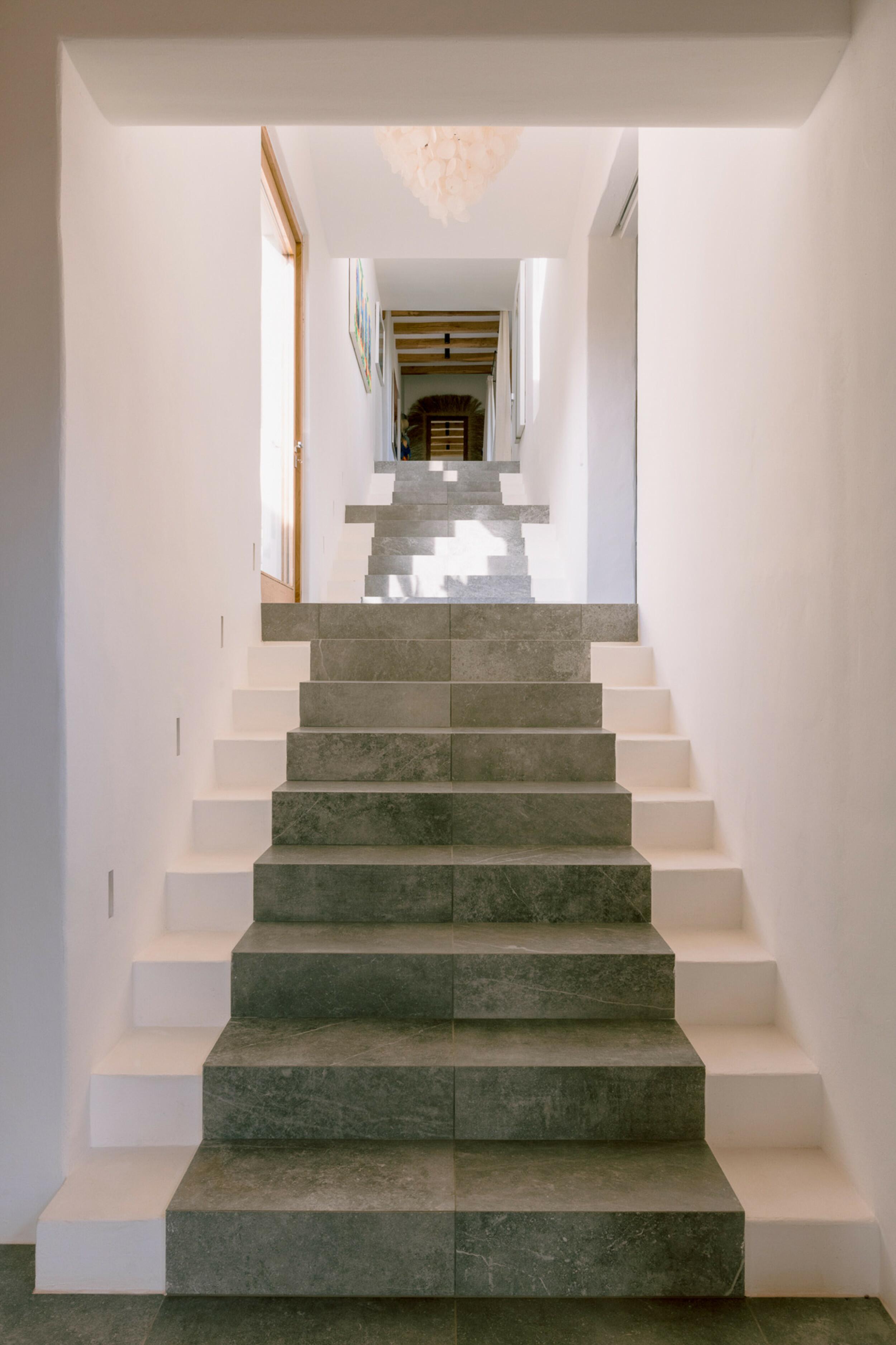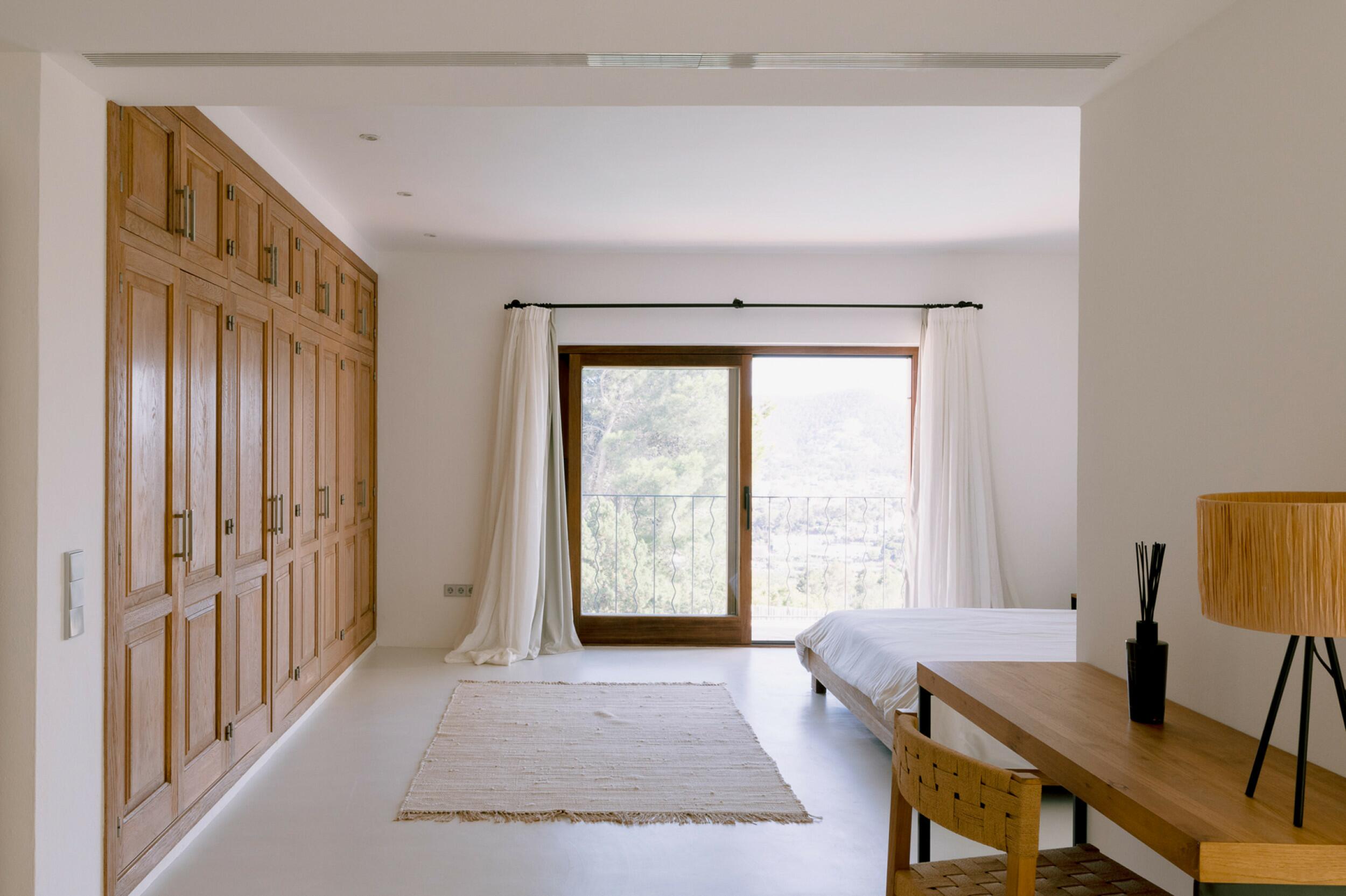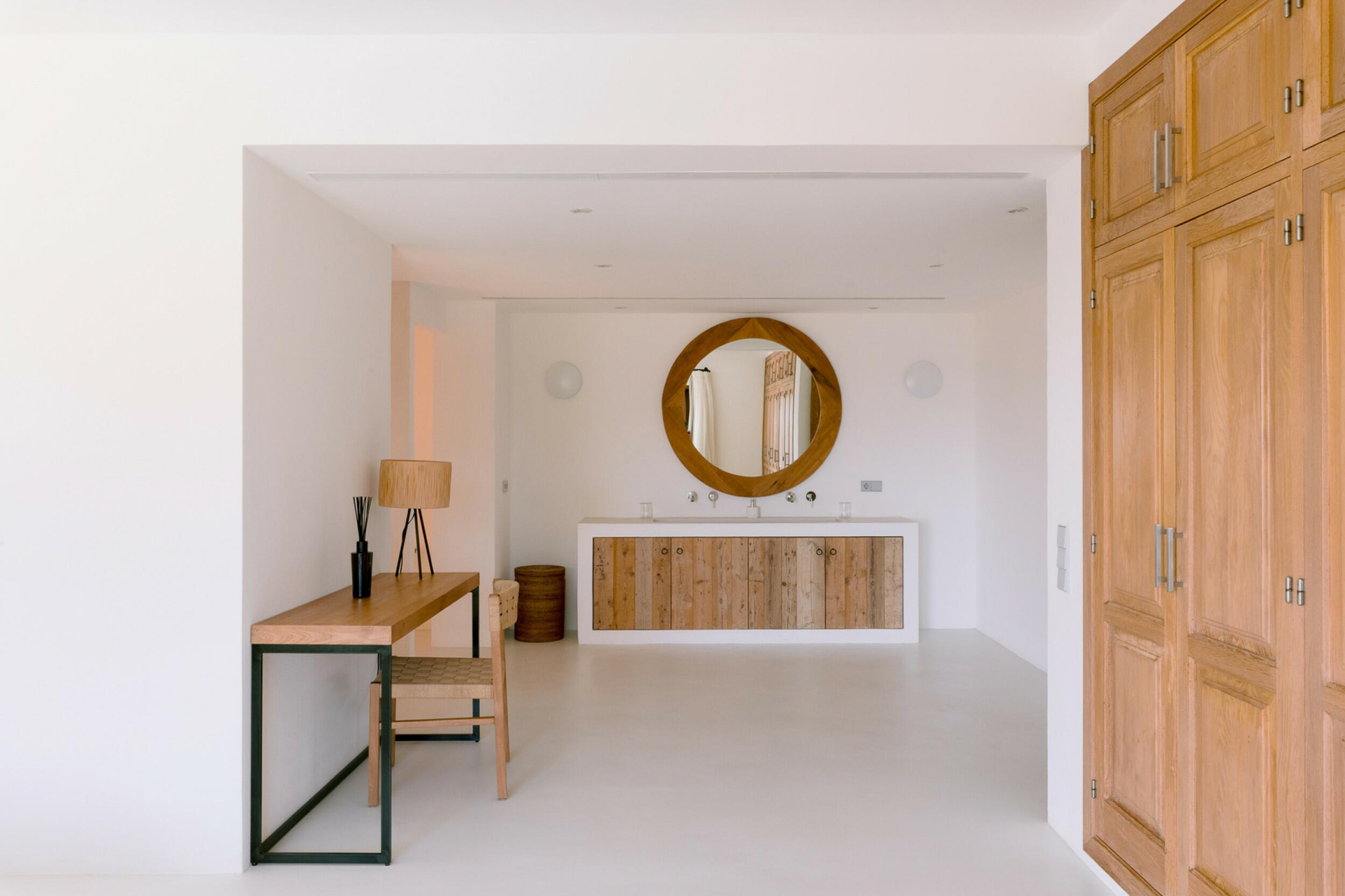 La residencia principal está diseñada cuidadosamente para crear un ambiente luminoso y ventilado en todas partes. Los techos altos y las paredes gruesas contribuyen a un interior naturalmente fresco y cómodo. La casa cuenta con cuatro amplios dormitorios en suite, cada uno con vestidores y almacenamiento integrado. El corazón del hogar es la sala de estar y comedor de doble altura, ideal para entretenerse o disfrutar de momentos familiares relajados. Una cocina principal completamente equipada está respaldada por una cocina exterior separada, perfecta para organizar reuniones bajo el cielo ibicenco. La finca también incluye una casa de huéspedes separada con tres dormitorios adicionales en suite, asegurando privacidad para los visitantes. Un discreto anexo para el personal proporciona alojamiento para apoyar eficientemente las operaciones de la finca.