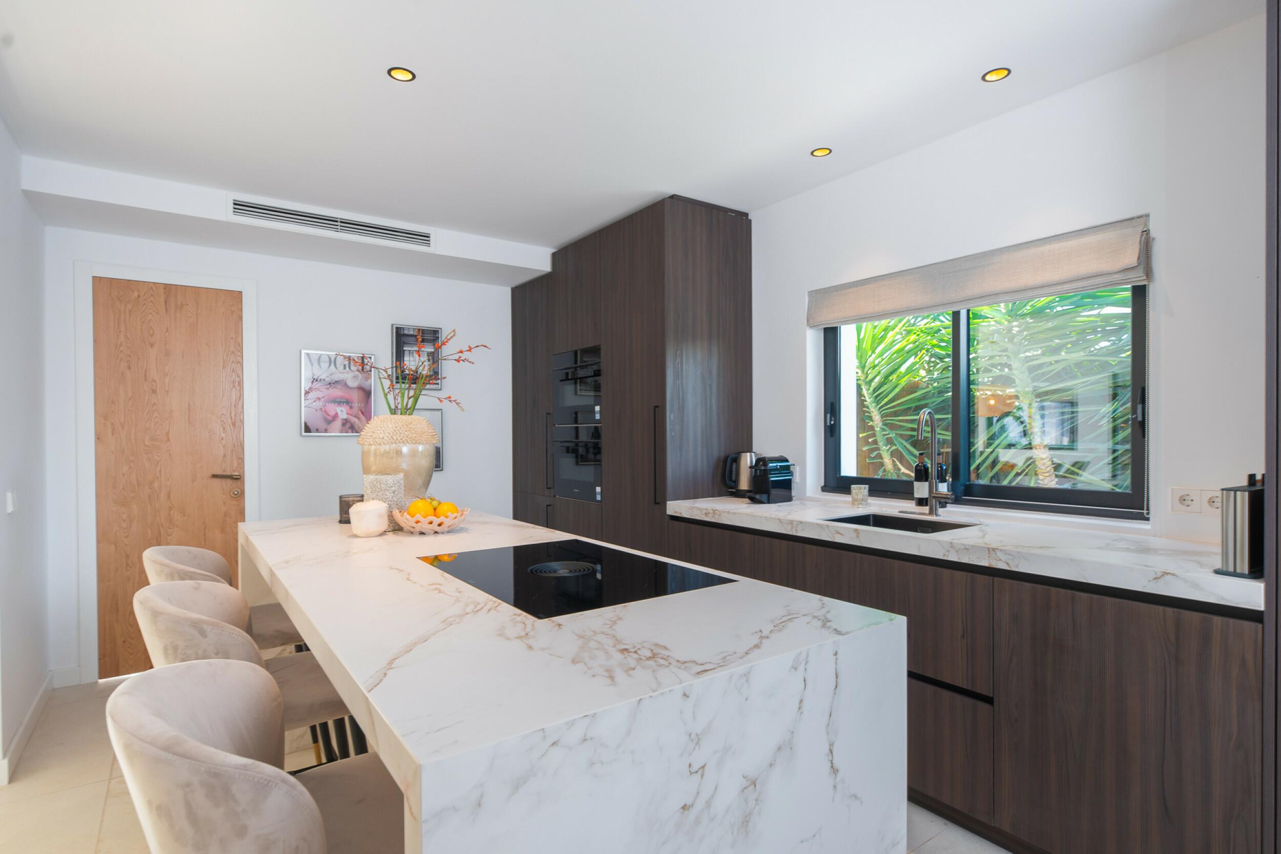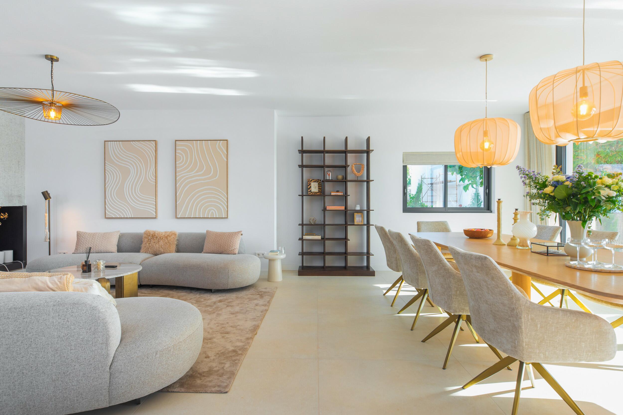 La villa está dividida en dos niveles independientes, ofreciendo flexibilidad y confort. El nivel principal cuenta con un gran vestíbulo de entrada, una luminosa y espaciosa sala de estar y comedor con ventanas panorámicas, y una moderna cocina de concepto abierto con una isla central y electrodomésticos de alta gama. El nivel inferior presenta una cocina adicional, un comedor con una mesa ovalada distintiva con diseño yin-yang, y múltiples áreas de descanso diseñadas para la relajación. La propiedad ofrece un total de siete dormitorios y seis baños, incluyendo varias habitaciones con baño en suite que proporcionan privacidad y conveniencia.