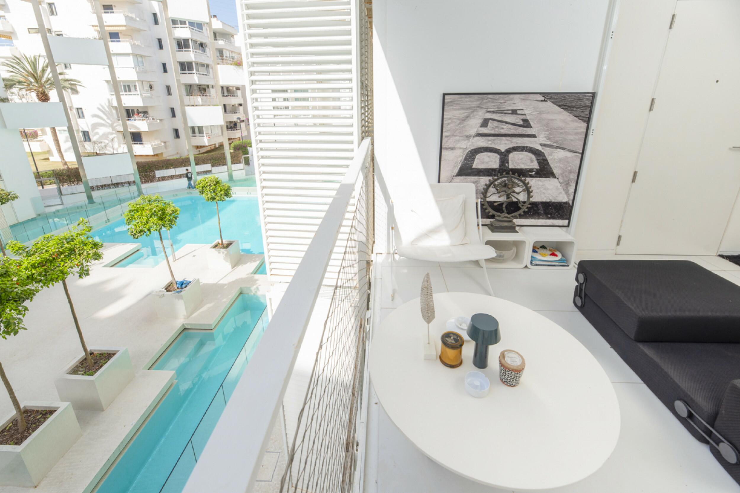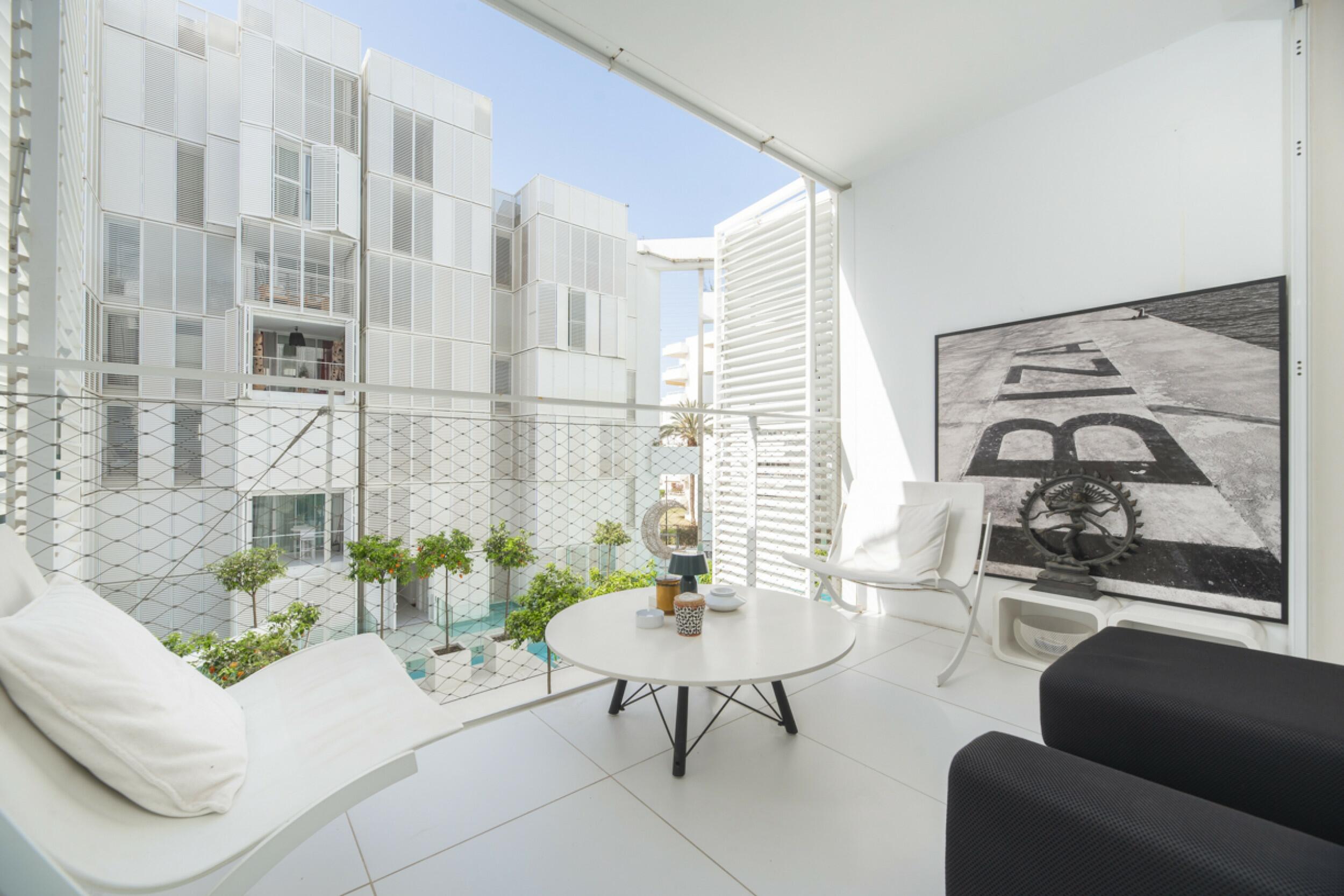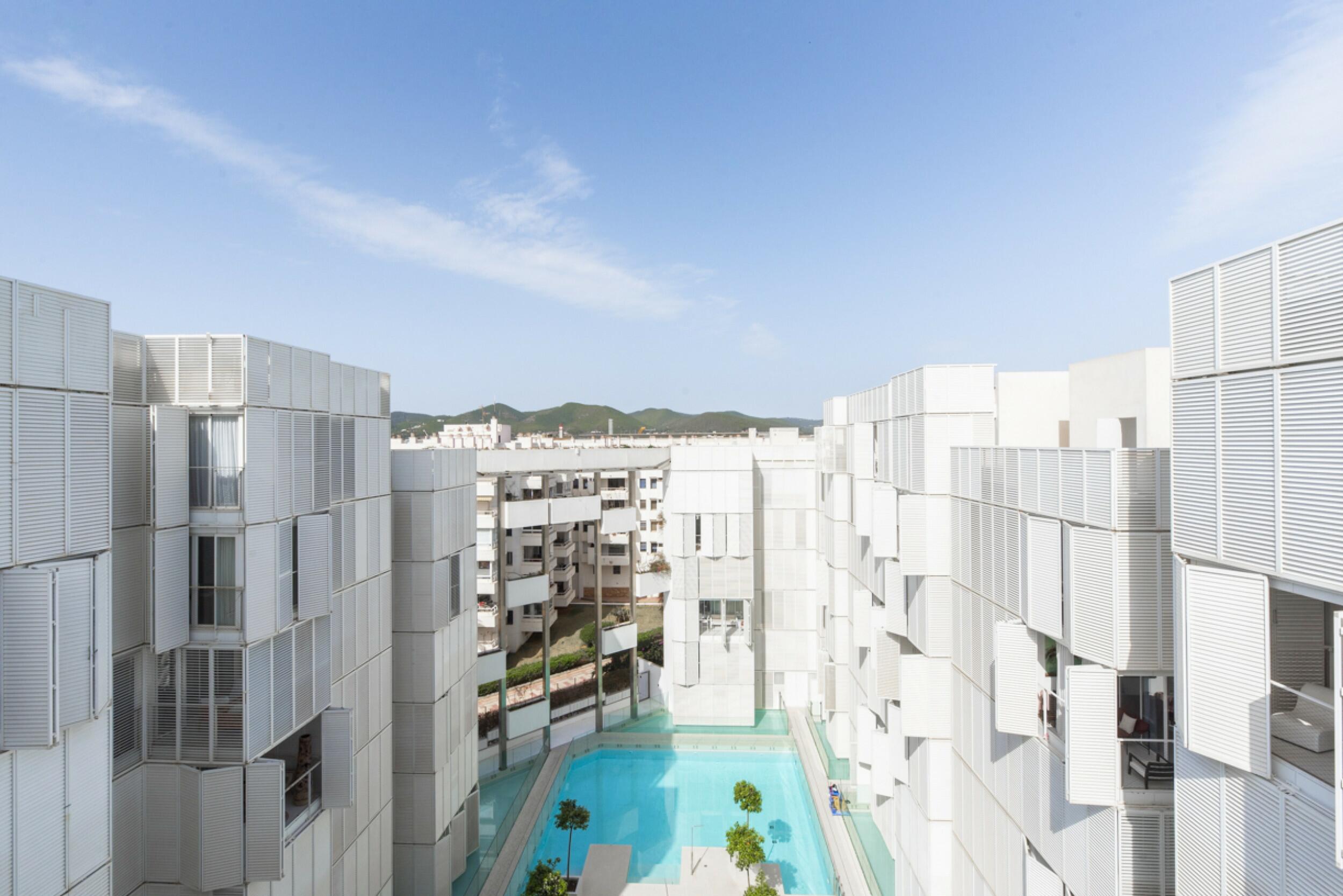 Los espacios exteriores cuentan con jardines cuidadosamente diseñados y una cautivadora piscina central, formando el vibrante corazón de la comunidad. Las extensas terrazas difuminan los límites entre el confort interior y la belleza del exterior de Ibiza, creando un ambiente de armonía y relajación.