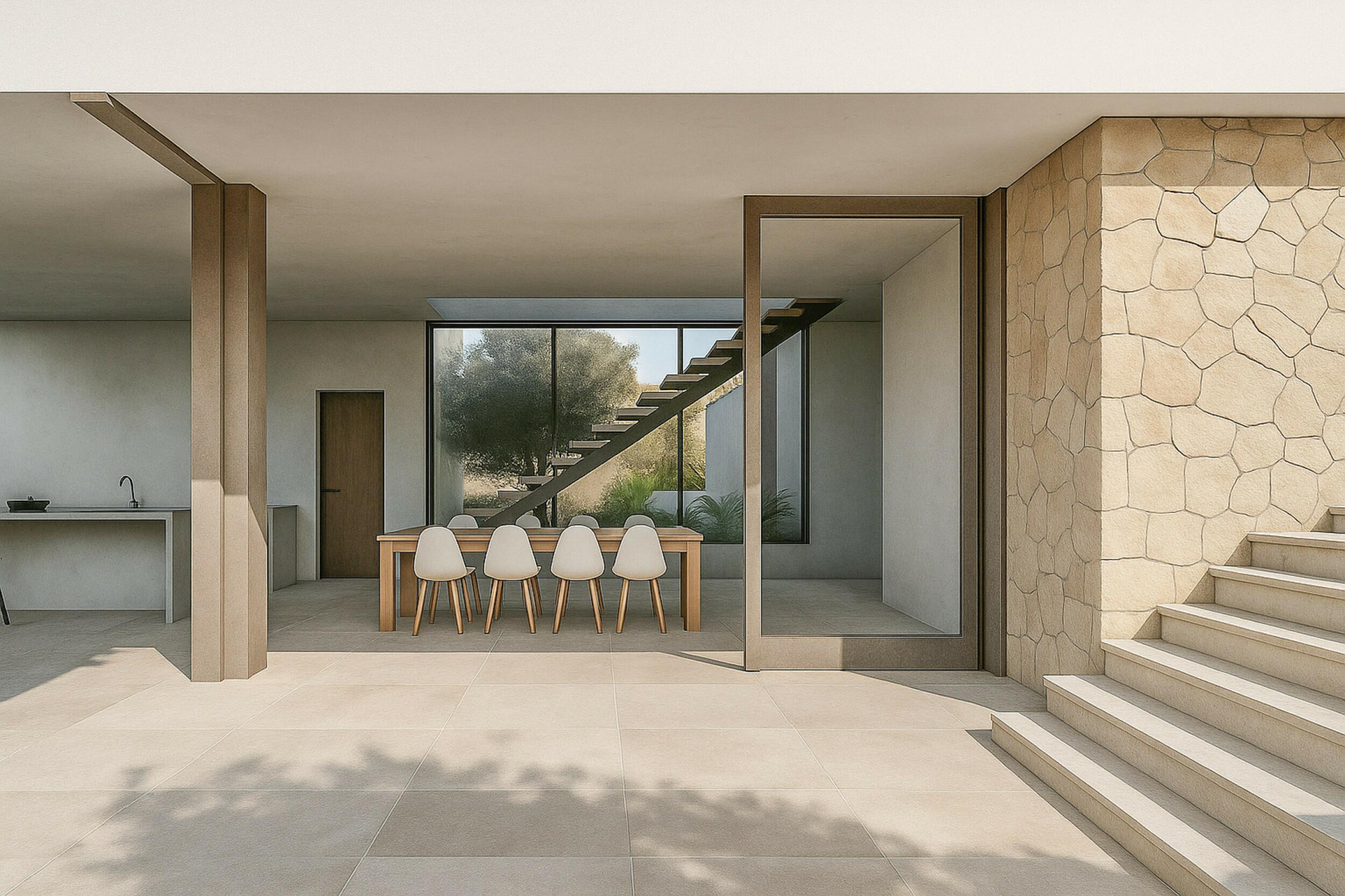 Las áreas exteriores están diseñadas tanto para la relajación como para el entretenimiento. La gran piscina, que mide 38 m², está rodeada de terrazas soleadas que disfrutan de hermosas vistas al mar y la histórica silueta de Dalt Vila. Un encantador patio junto a la piscina se conecta directamente con uno de los dormitorios de la casa principal, creando un rincón privado y tranquilo para el café matutino o la relajación vespertina. Áreas sombreadas y terrazas cubiertas proporcionan un respiro bienvenido durante los meses de verano, mientras que la jardinería madura asegura privacidad y una conexión natural con el campo circundante.