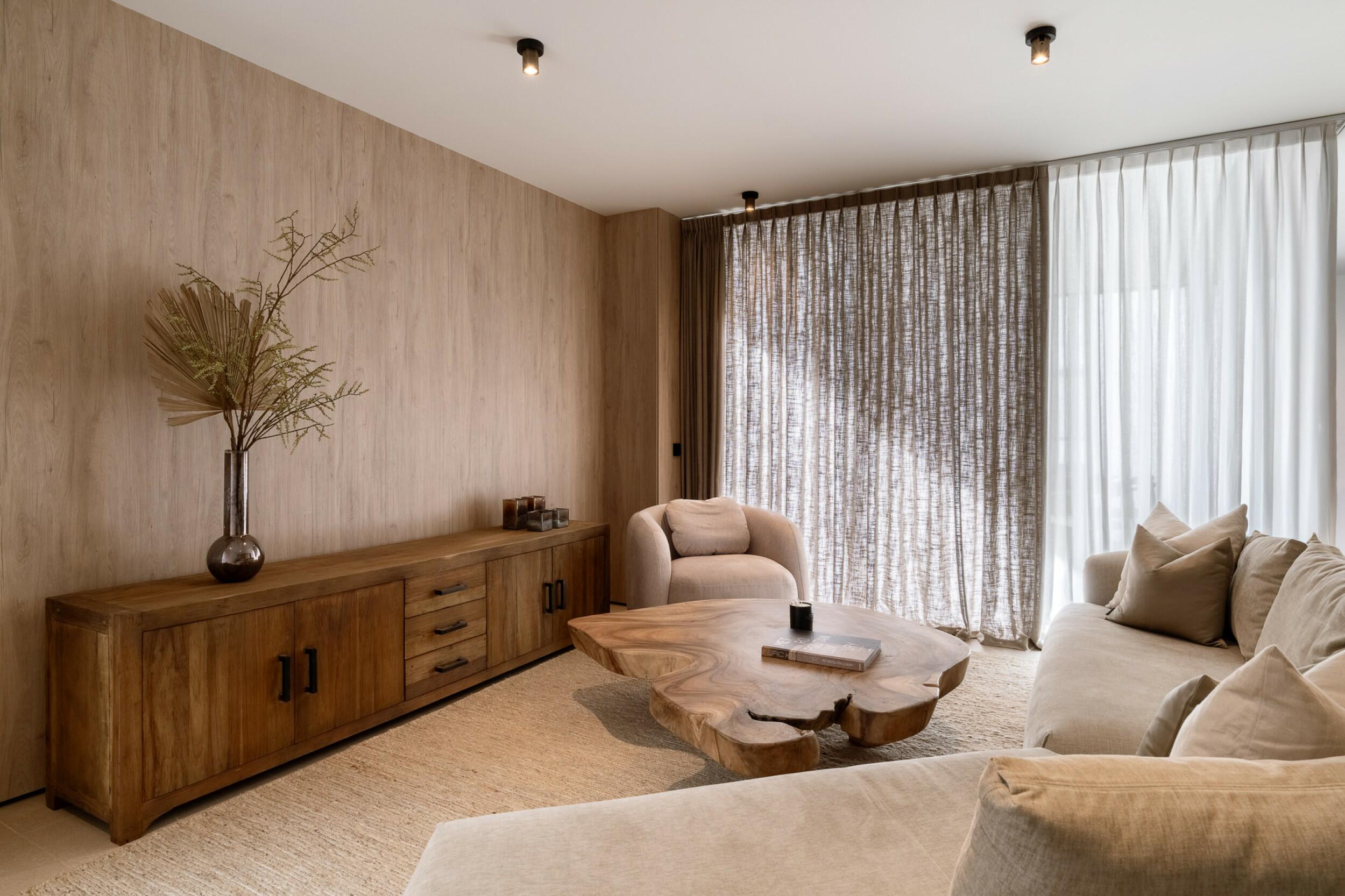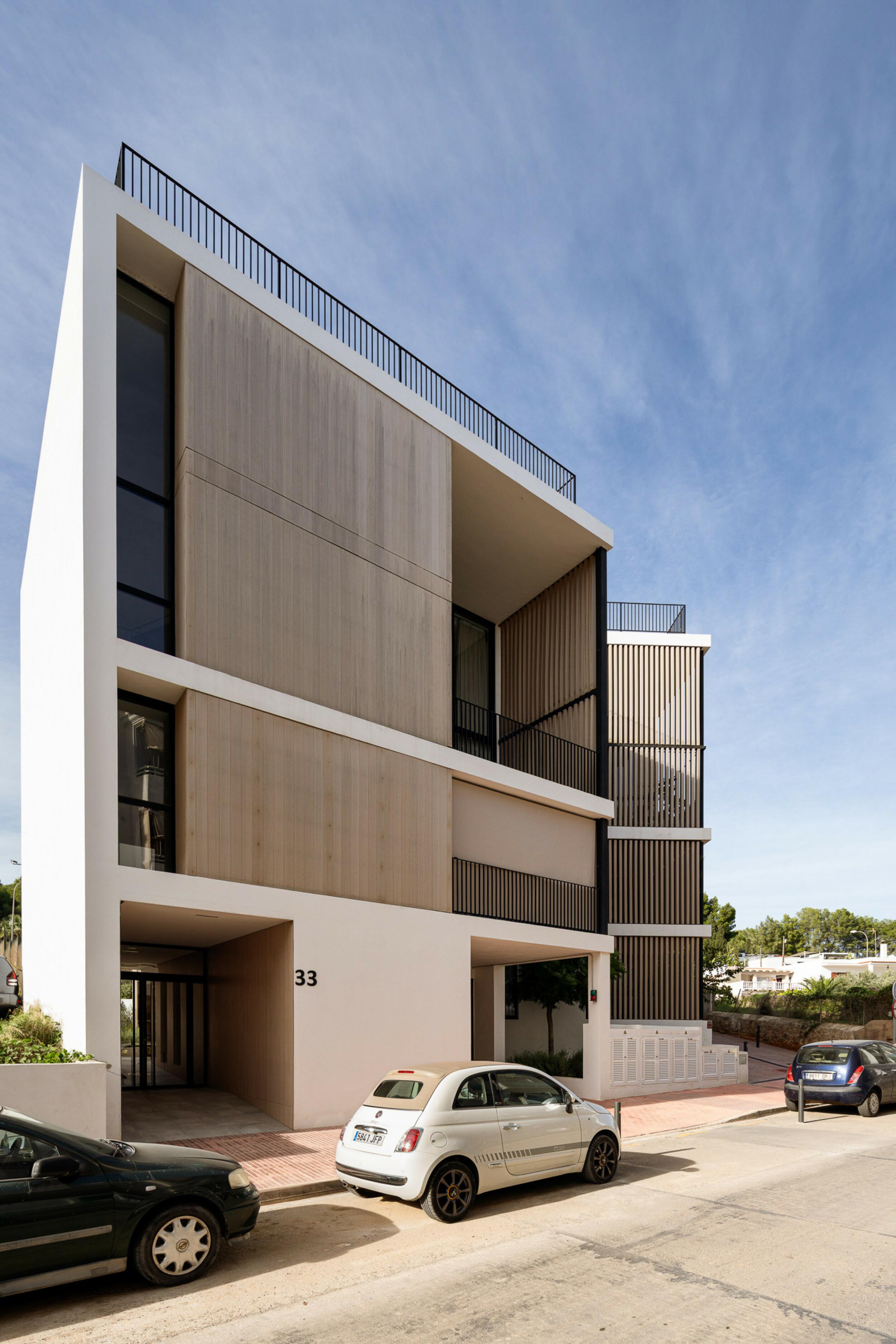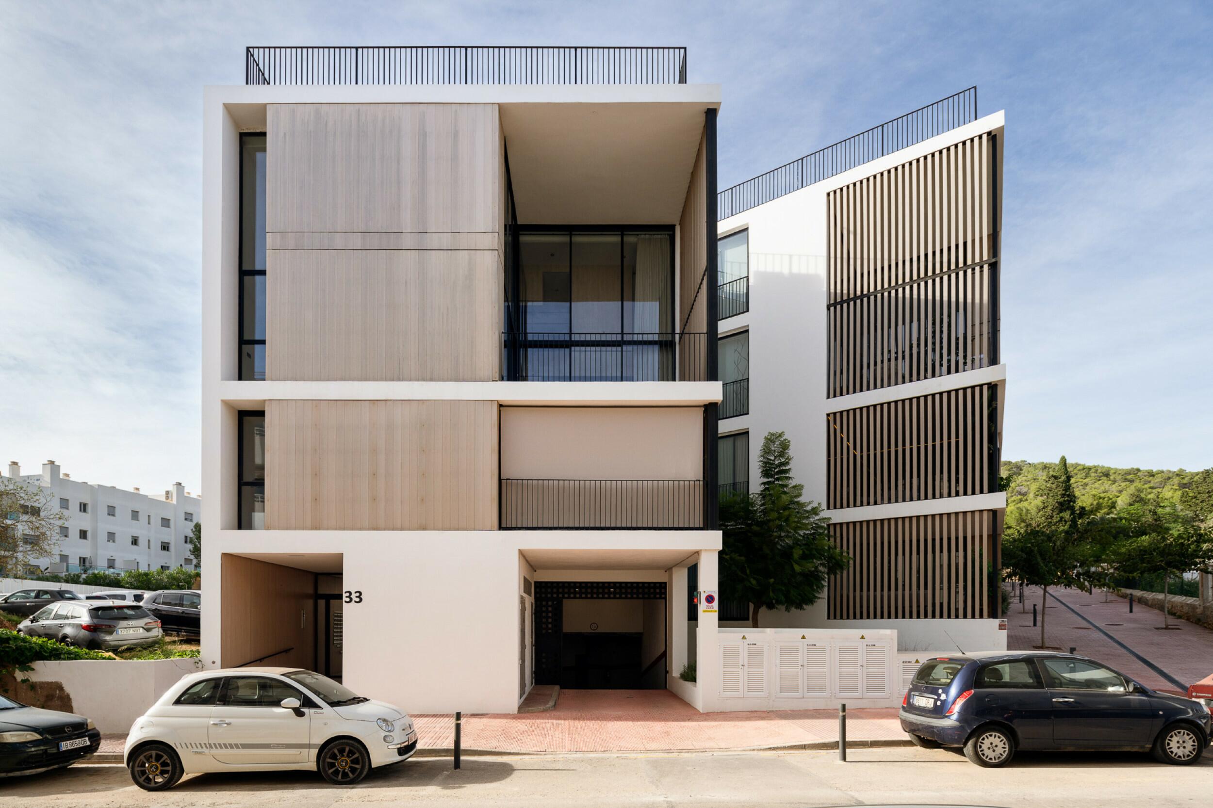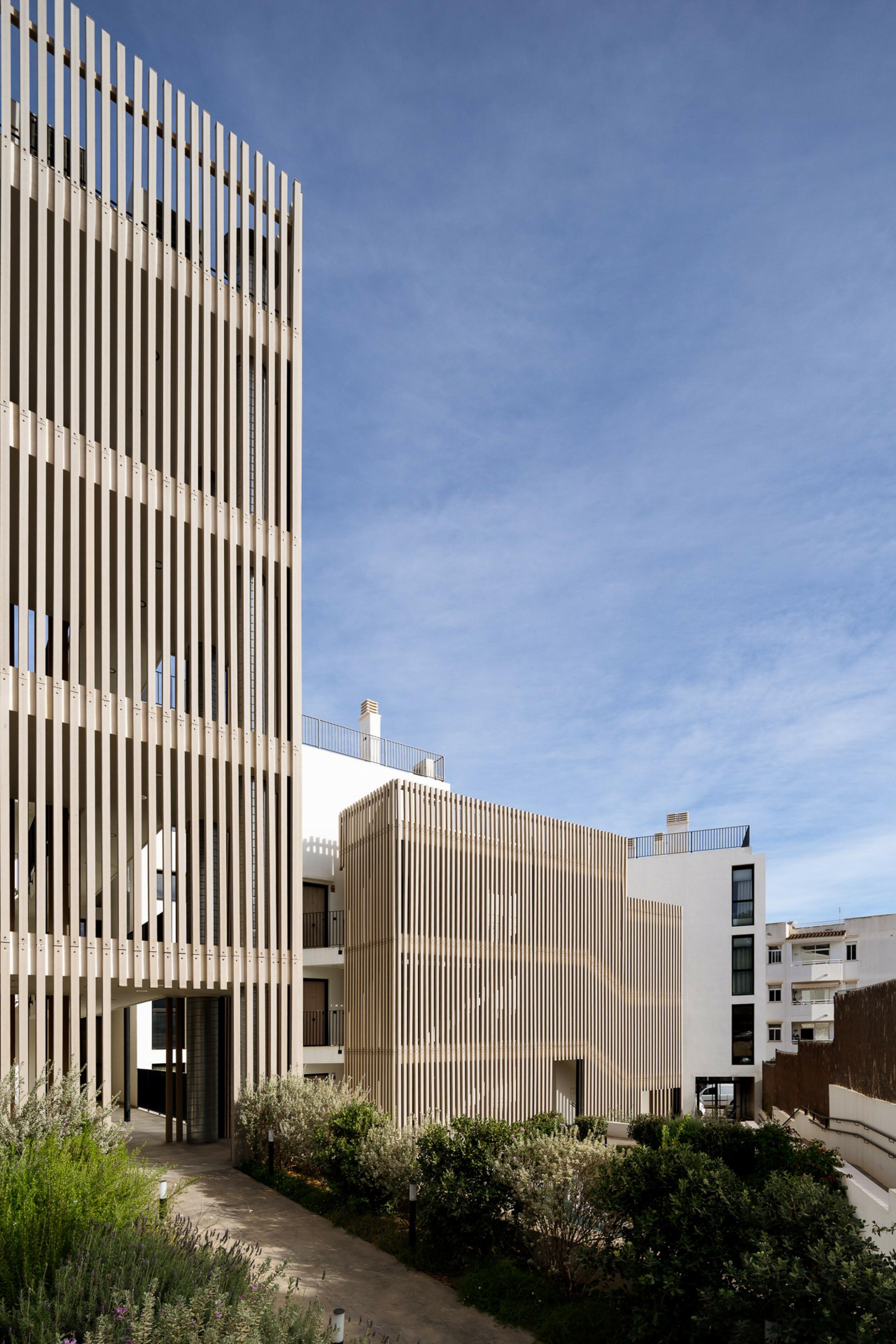 La arquitectura combina de forma armoniosa fachadas en tonos claros con detalles cálidos en madera, integrándose perfectamente con la luz natural de Ibiza. Los grandes ventanales y los espacios abiertos invitan a disfrutar del exterior, mientras que el patio central ajardinado constituye el corazón del complejo, con una gran piscina comunitaria y zonas de descanso que fomentan un estilo de vida sereno pero sociable.
