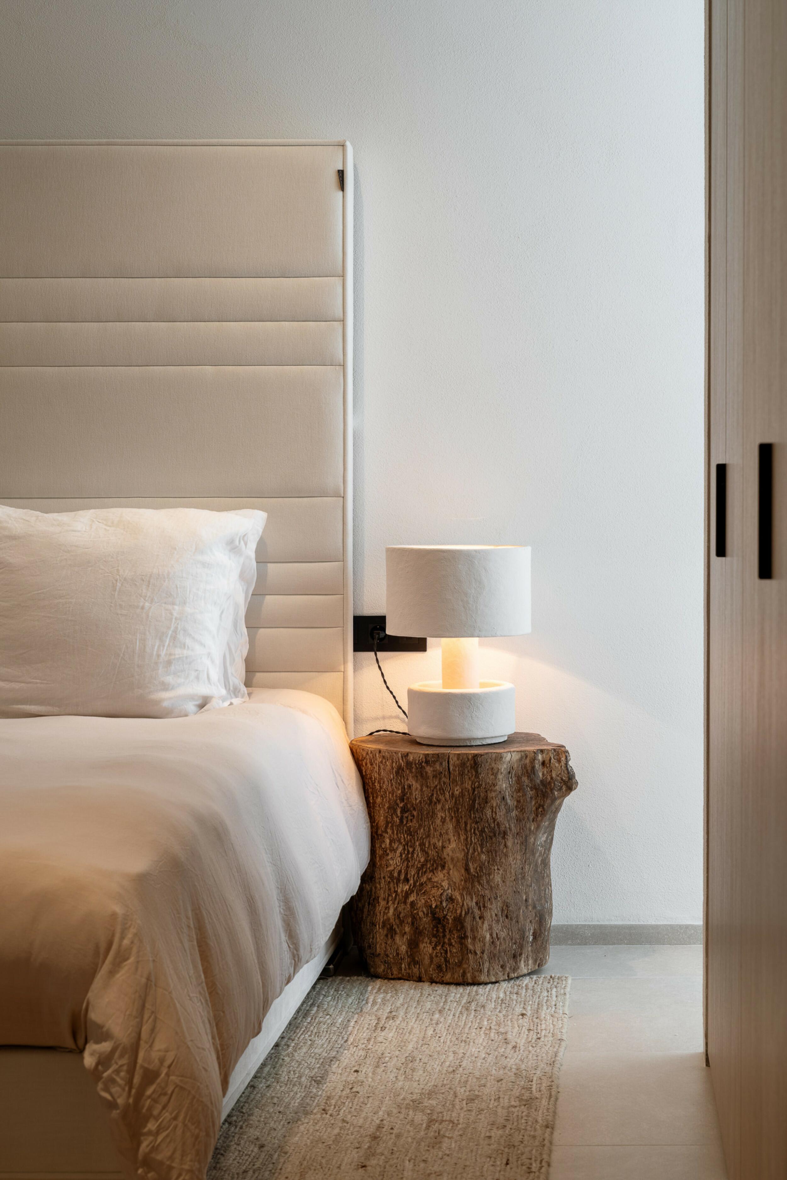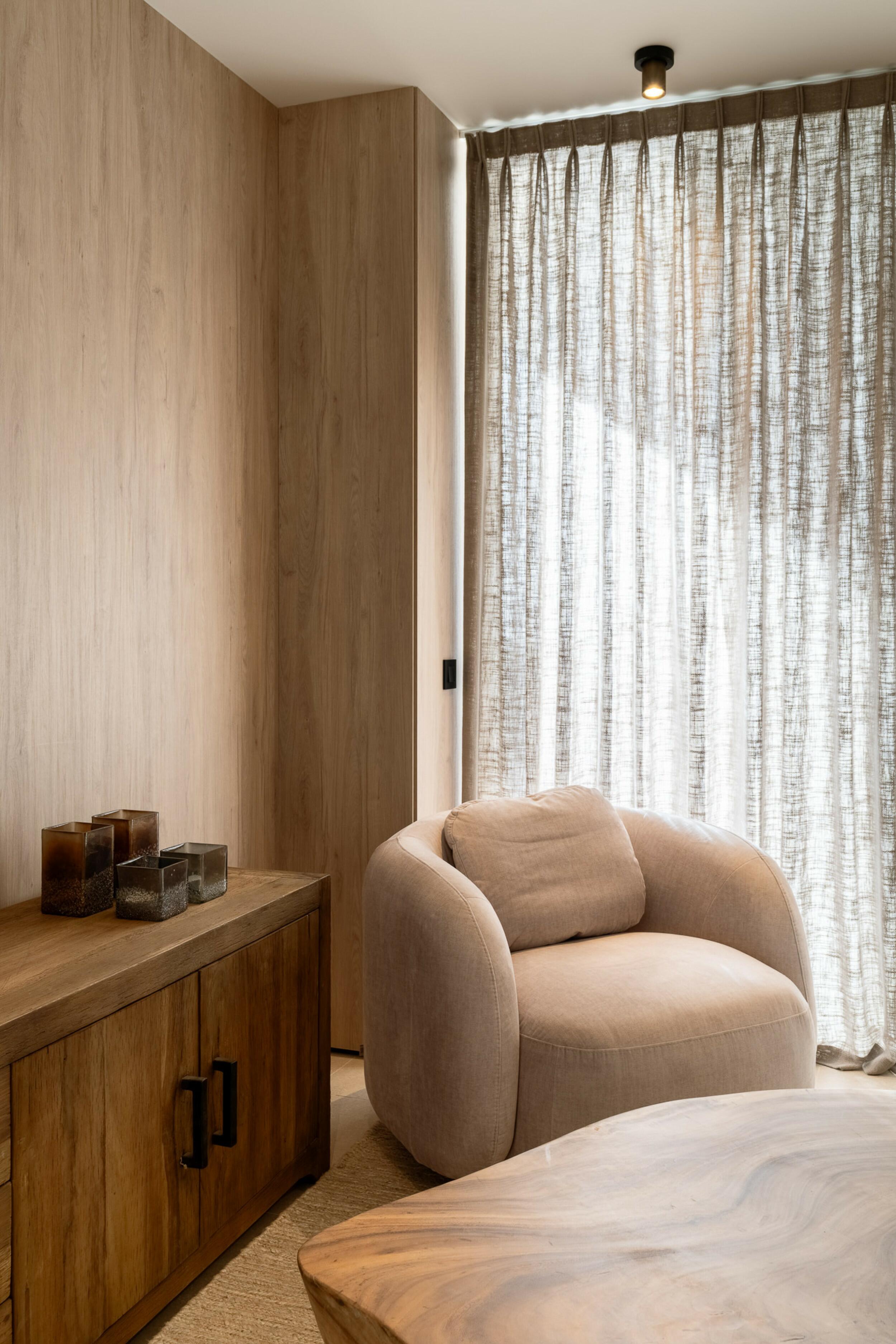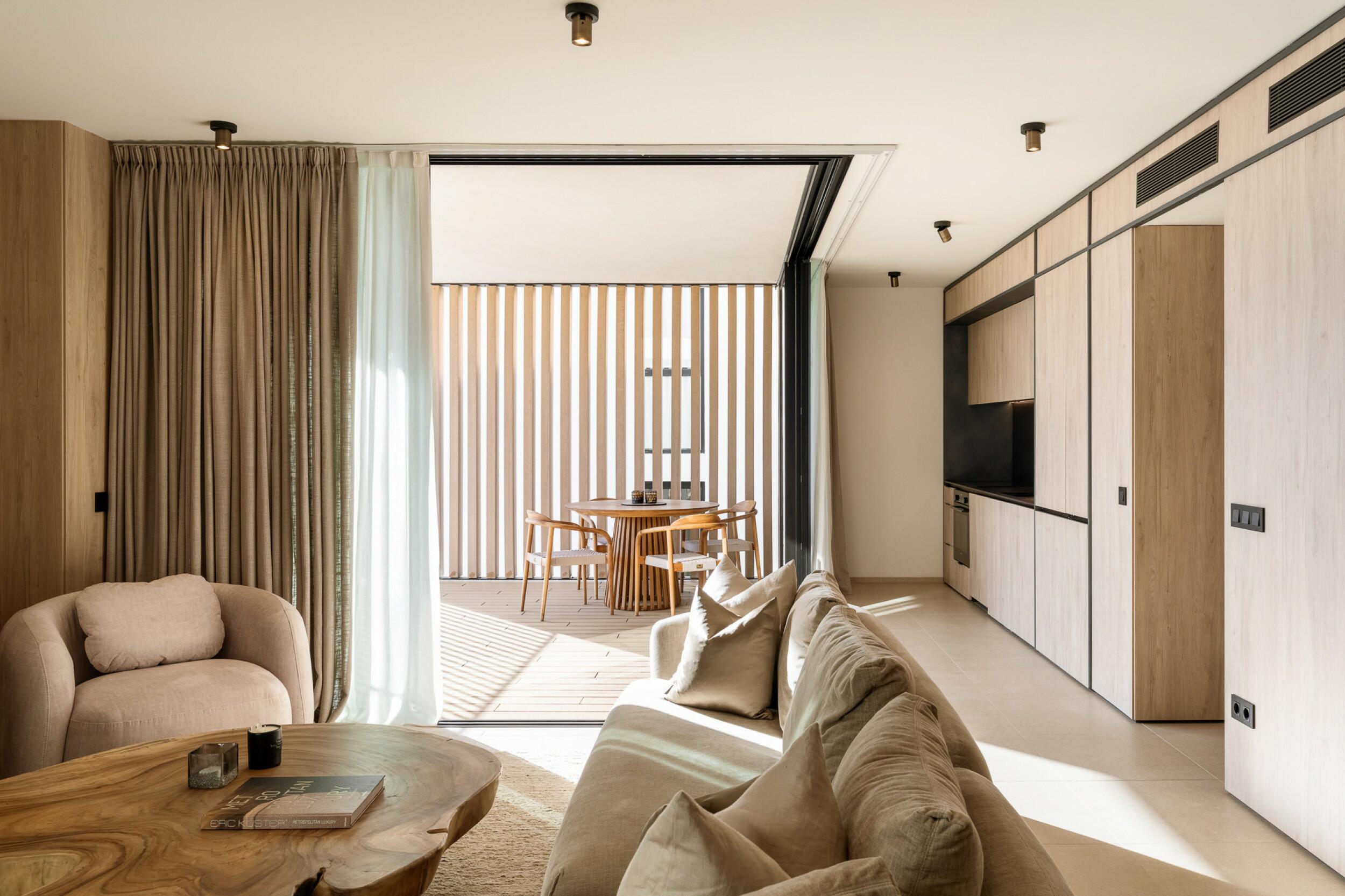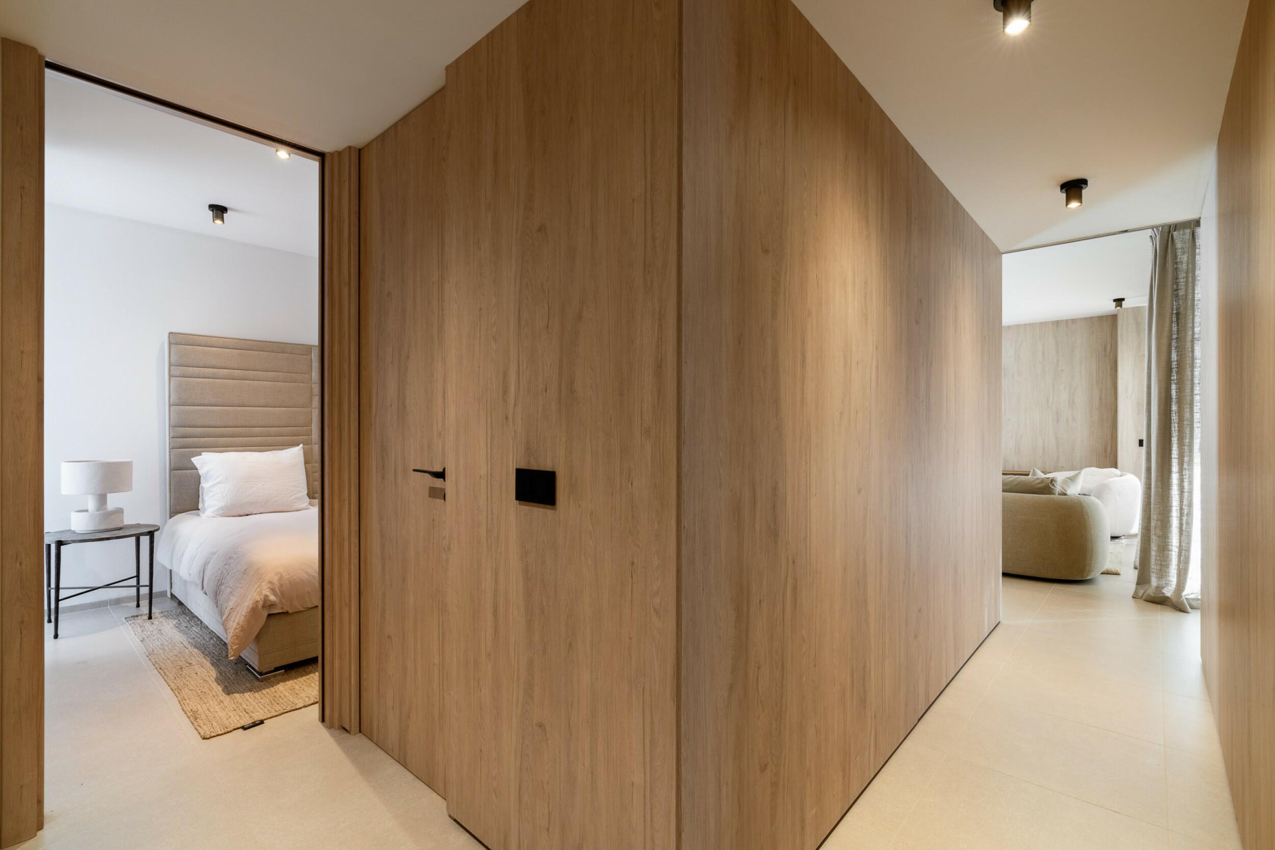 La arquitectura combina de forma armoniosa fachadas en tonos claros con detalles cálidos en madera, integrándose perfectamente con la luz natural de Ibiza. Los grandes ventanales y los espacios abiertos invitan a disfrutar del exterior, mientras que el patio central ajardinado constituye el corazón del complejo, con una gran piscina comunitaria y zonas de descanso que fomentan un estilo de vida sereno pero sociable.
