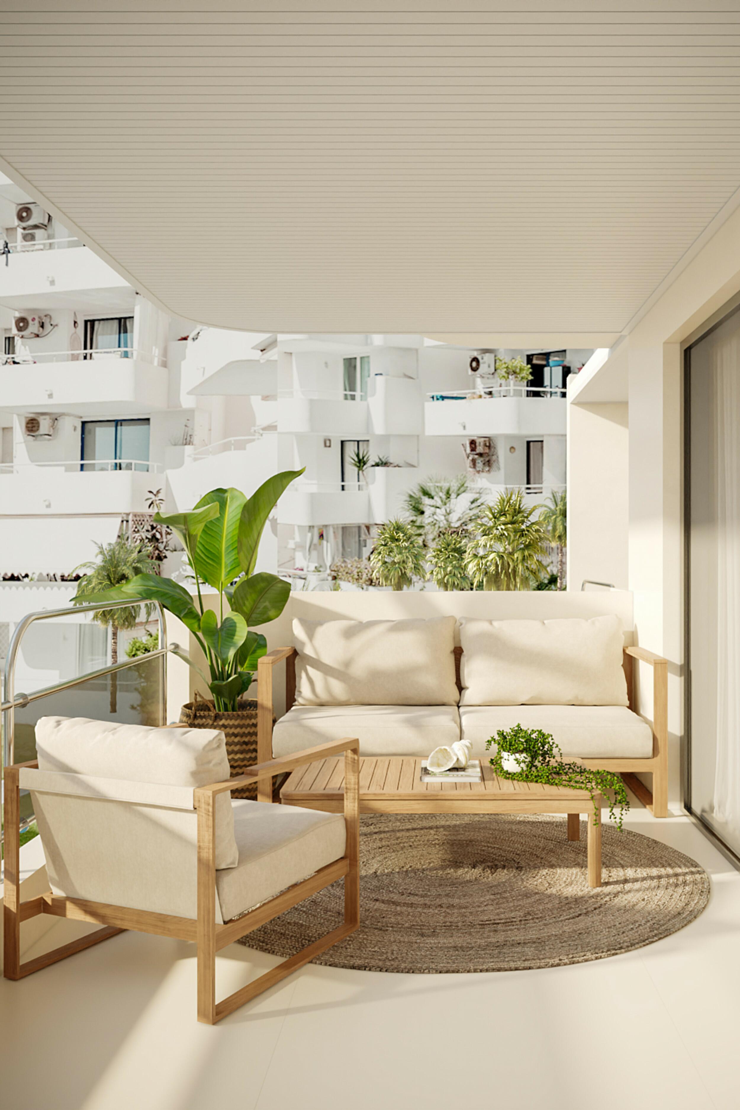Grandes puertas correderas de vidrio se abren directamente desde el espacio principal de estar hacia una terraza privada. Aunque compacta en tamaño, la terraza está inteligentemente diseñada para sentirse expansiva, con asientos integrados y vegetación suave que difumina las líneas entre el interior y el exterior. Los residentes del edificio también disfrutan de acceso a una piscina comunitaria compartida y área de solárium.