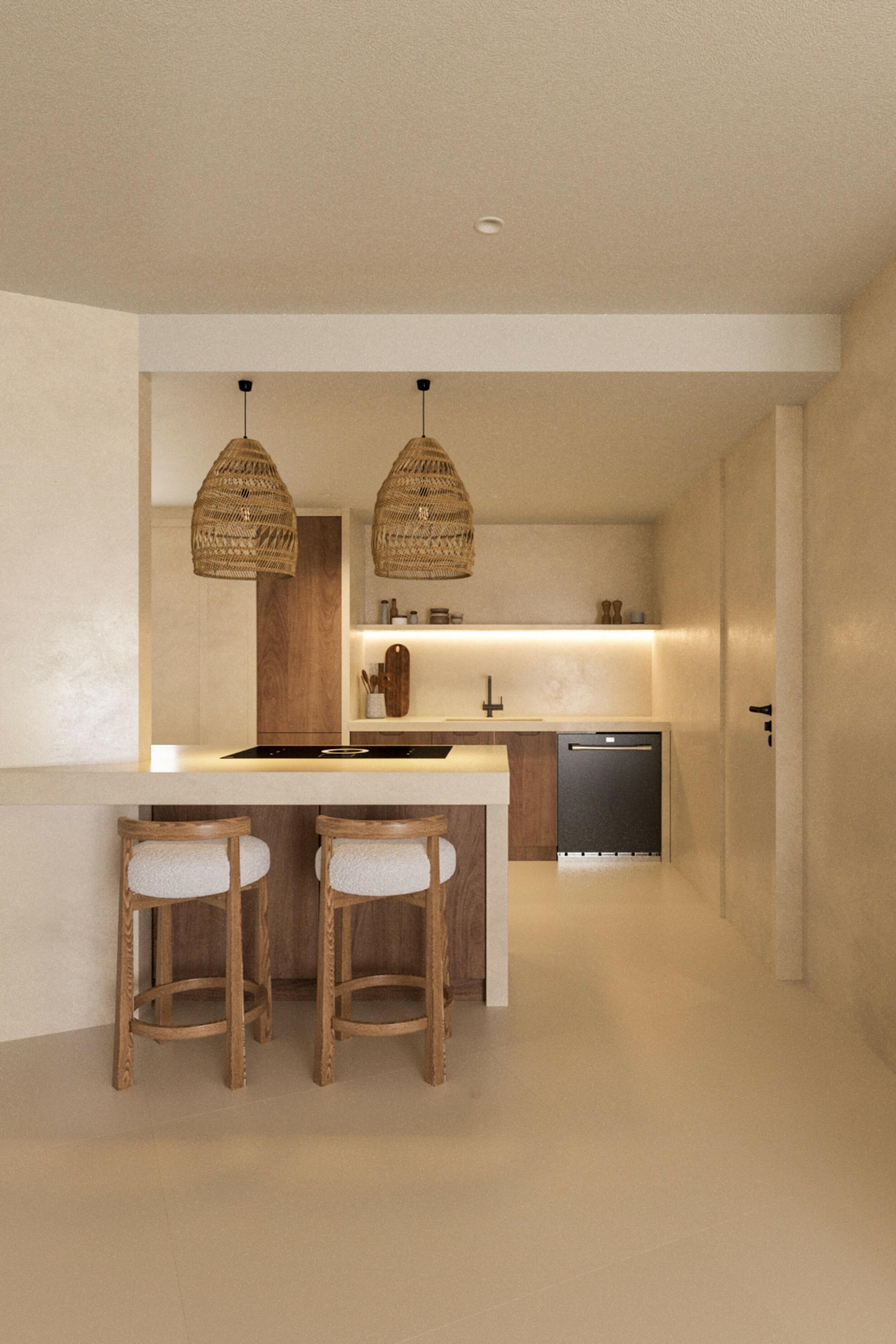 La propiedad abarca una superficie construida total de aproximadamente 103 m², distribuida en un diseño abierto bien planificado. Al entrar, se percibe una sensación de calma gracias al diseño fluido, la paleta de colores neutros suaves y los materiales naturales. Las áreas de estar y comedor fluyen sin esfuerzo hacia la cocina de planta abierta, formando el corazón del hogar. Dos serenas habitaciones se sitúan de manera privada en la parte trasera, complementadas por dos elegantes baños con duchas walk-in y acabados de microcemento.