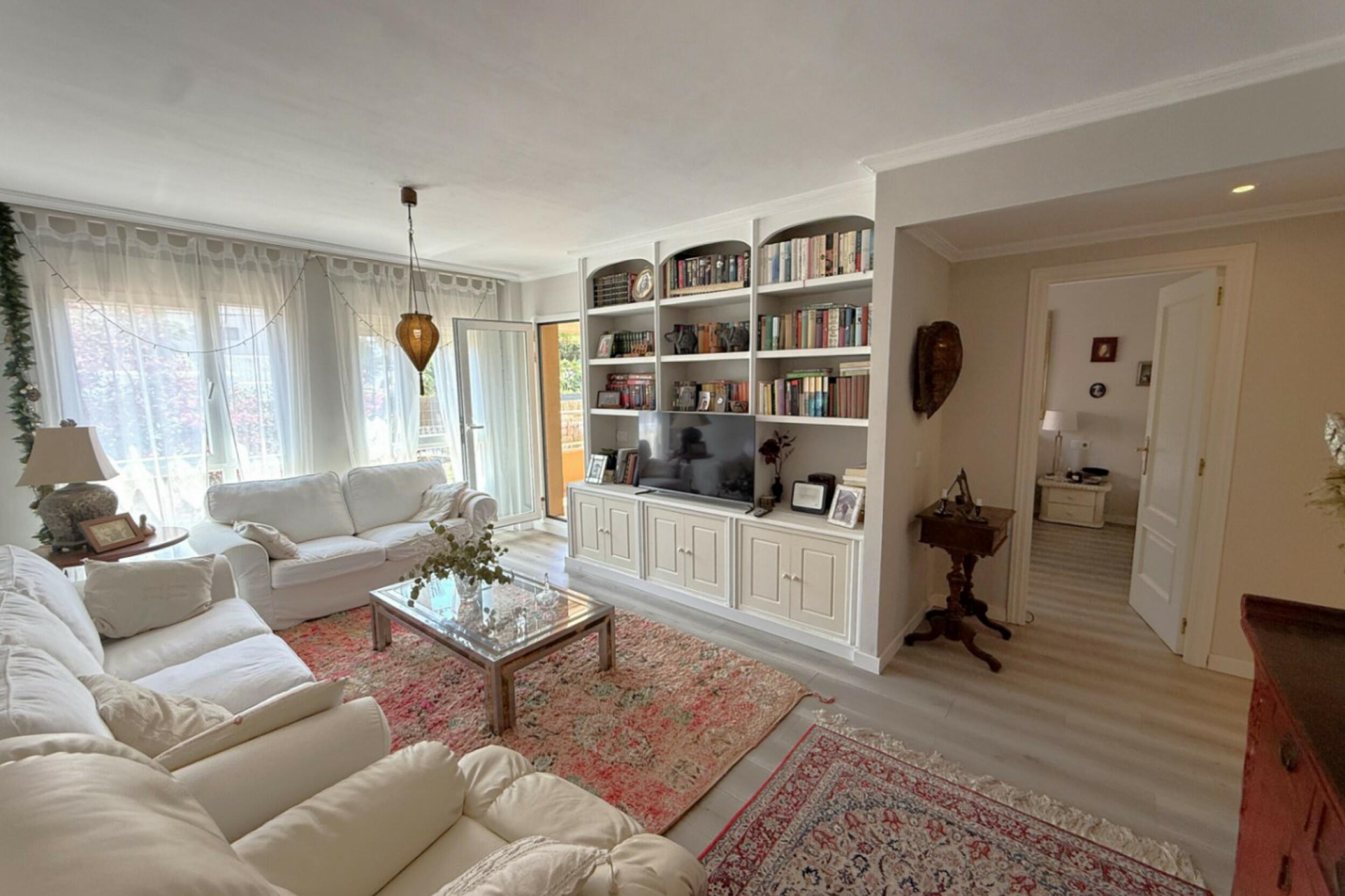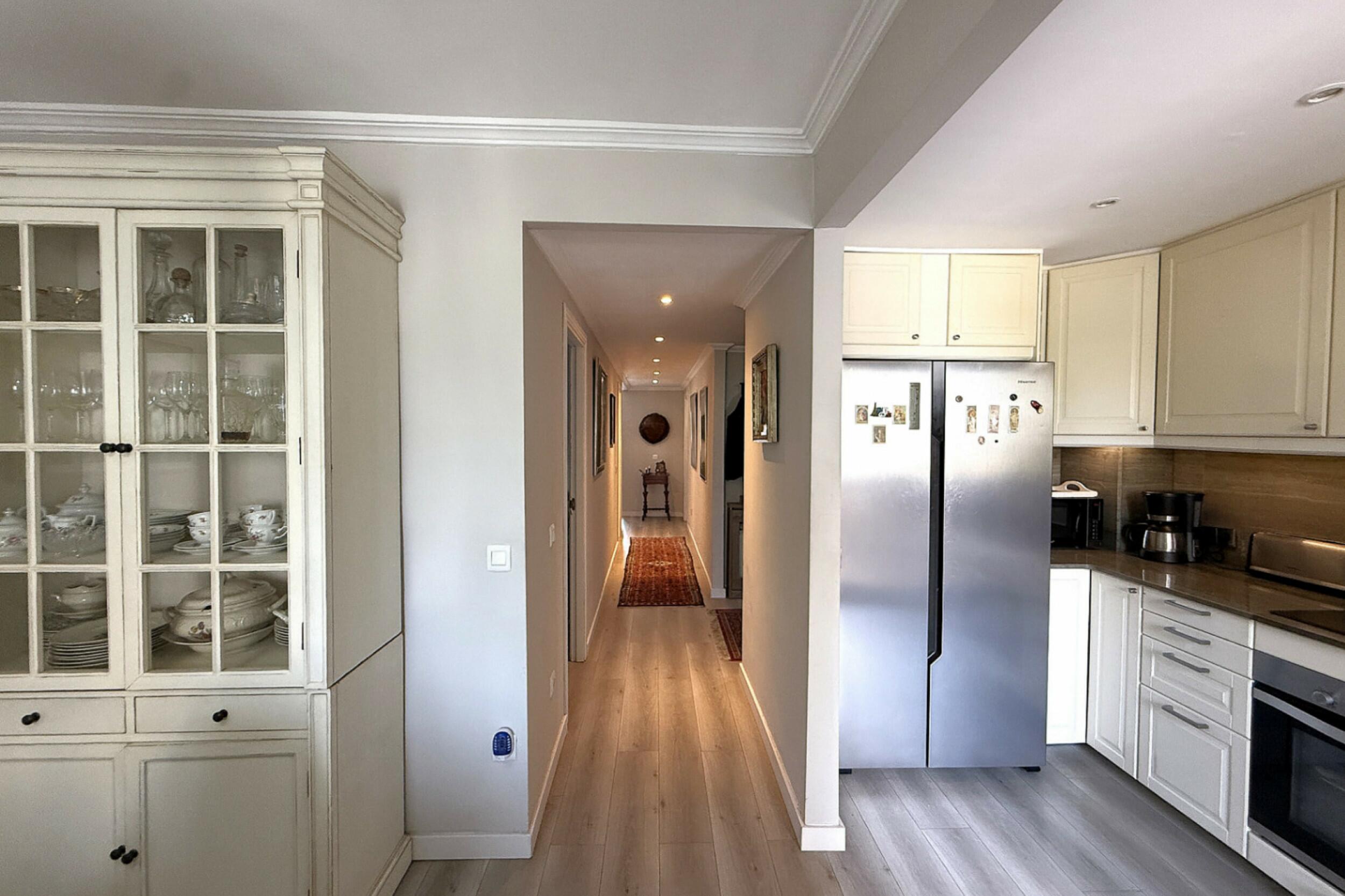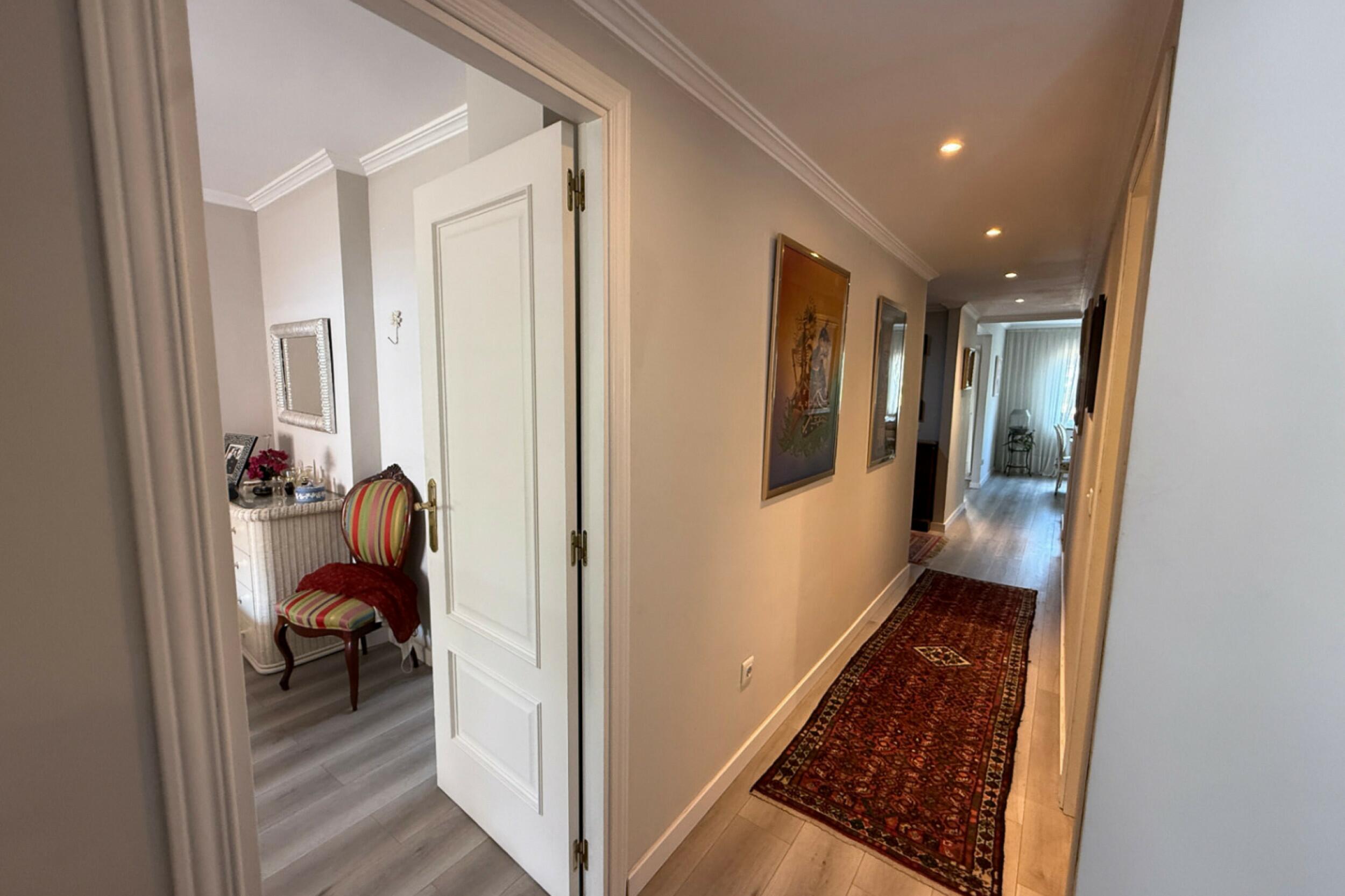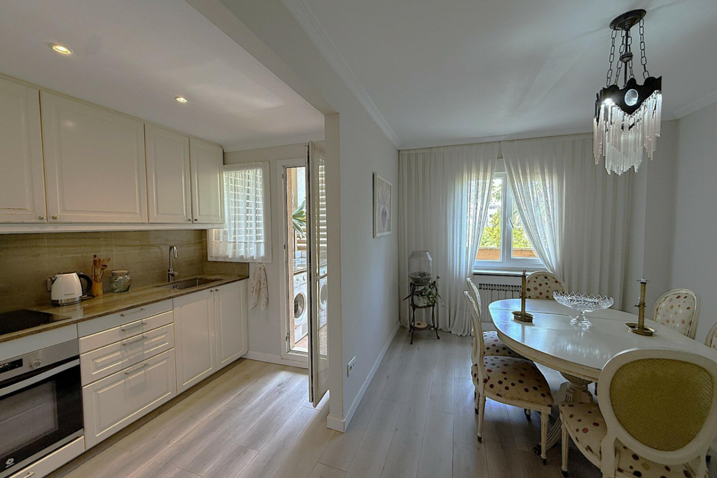 Al entrar, un pasillo luminoso conduce a un primer dormitorio doble con su propio baño, seguido de una espaciosa suite principal completa con bañera y servicios en suite. El área de estar y comedor de planta abierta se conecta sin problemas con la terraza, mientras que la cocina adyacente es parcialmente abierta, permitiendo la entrada de luz natural y un flujo continuo en todo el espacio.