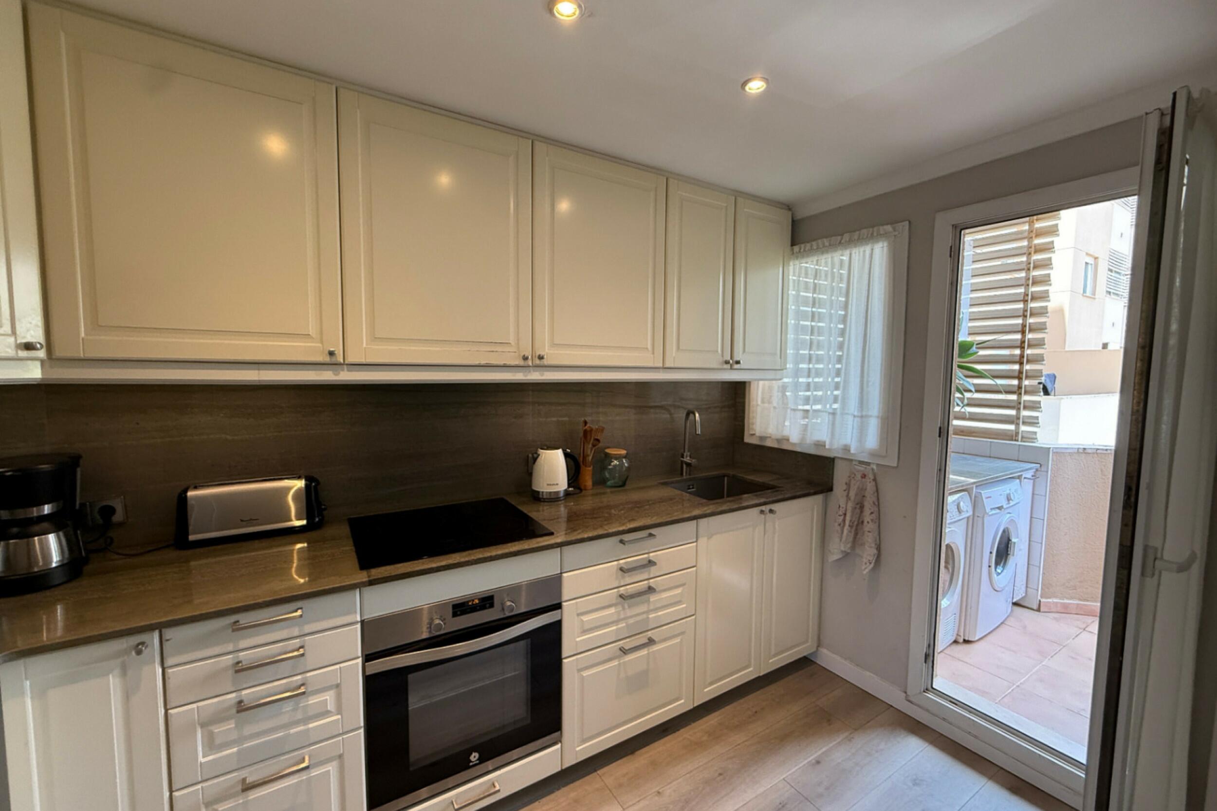 Una terraza privada extiende el área de estar al aire libre, ofreciendo un entorno agradable para relajarse y disfrutar de la fresca brisa marina. Los residentes del complejo Bossa Mar se benefician de una generosa piscina comunitaria situada en un entorno cerrado, junto con acceso directo al paseo marítimo.