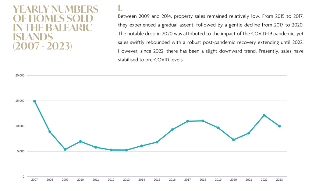 Tal y como anticipamos en nuestro Informe de Mercado 2022 y previsión para 2023, el mercado inmobiliario ibicenco experimentó un modesto descenso en las ventas durante el pasado año. Este descenso puede atribuirse a diversos factores, como la ralentización económica mundial, tensiones geopolíticas como los conflictos de Ucrania y Oriente Próximo, e incertidumbres financieras derivadas de la inflación y la subida de los tipos de interés. A pesar de estos retos, es importante señalar que el mercado ha demostrado resistencia y estabilidad.