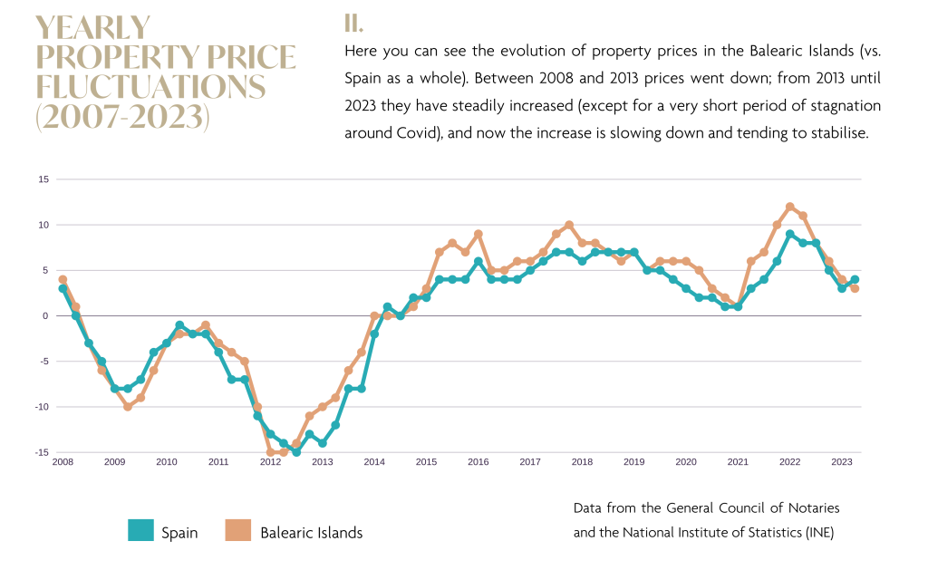 Las Islas Baleares han demostrado una impresionante capacidad de recuperación a lo largo del tiempo, como se muestra en el siguiente gráfico. A pesar de experimentar ligeros descensos en la compraventa y los precios inmobiliarios en 2023, el patrón constante de repunte tras cada crisis ofrece tranquilidad a los inversores a largo plazo. Esta tendencia subraya la reputación de Baleares como destino de inversión seguro y duradero, con un mercado que ha superado sistemáticamente los niveles anteriores a la crisis durante la última década.