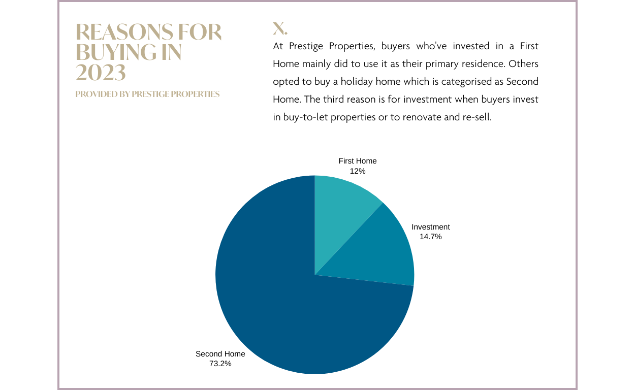 Un notable 14,7% de los inversores han elegido estratégicamente propiedades con fines puramente de inversión, lo que subraya el atractivo de la isla para quienes buscan rentabilidad financiera. Igualmente convincente es el hecho de que aproximadamente el 12% de la clientela de Prestige ha optado por invertir en su primera vivienda, lo que refleja un auténtico compromiso de trasladarse, residir y dedicarse a actividades durante todo el año en el vibrante y cautivador paisaje de Ibiza. Las diversas preferencias de nuestros clientes siguen subrayando el polifacético atractivo de la isla y su perdurable potencial inversor.