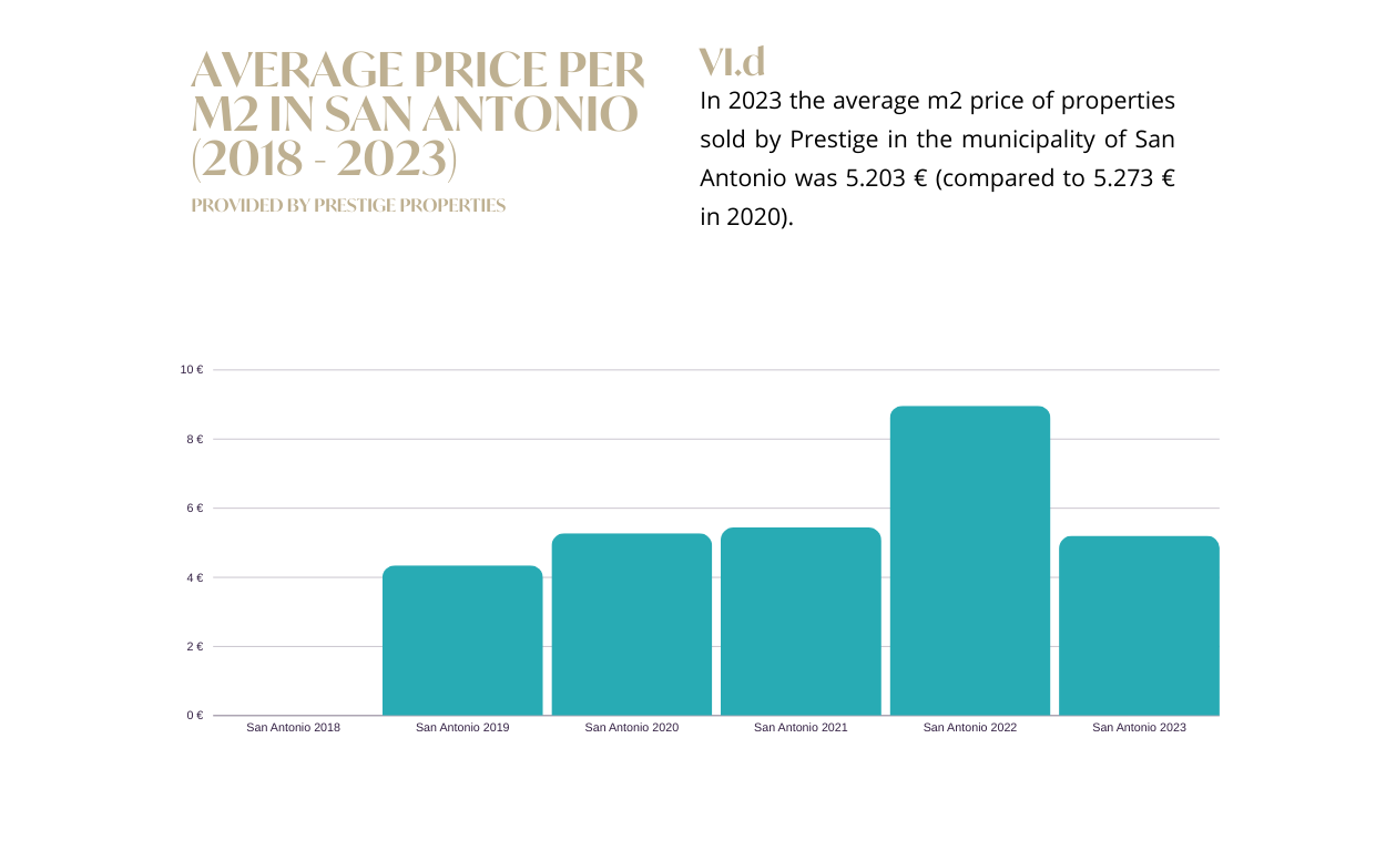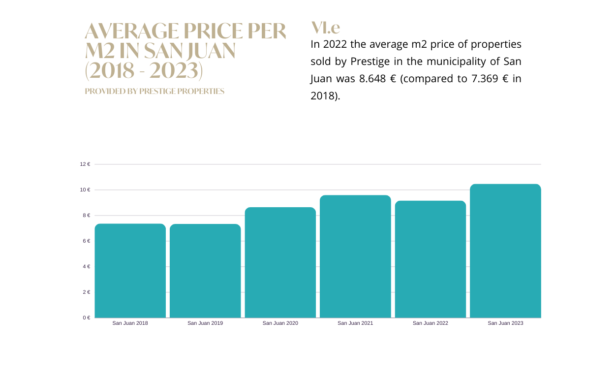 En general, incluso con un descenso interanual, todavía podemos ver un aumento global del 17% en un periodo de 5 años (2018-2023). Hemos notado un aumento espectacular de la demanda en el municipio de San Antonio, donde el precio medio por metro cuadrado ha aumentado en los últimos años, aunque sigue siendo el municipio más asequible de la isla, con muchas oportunidades gratificantes para los compradores.