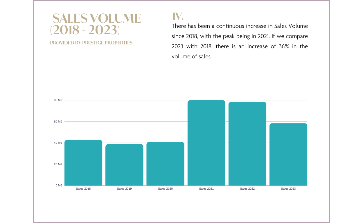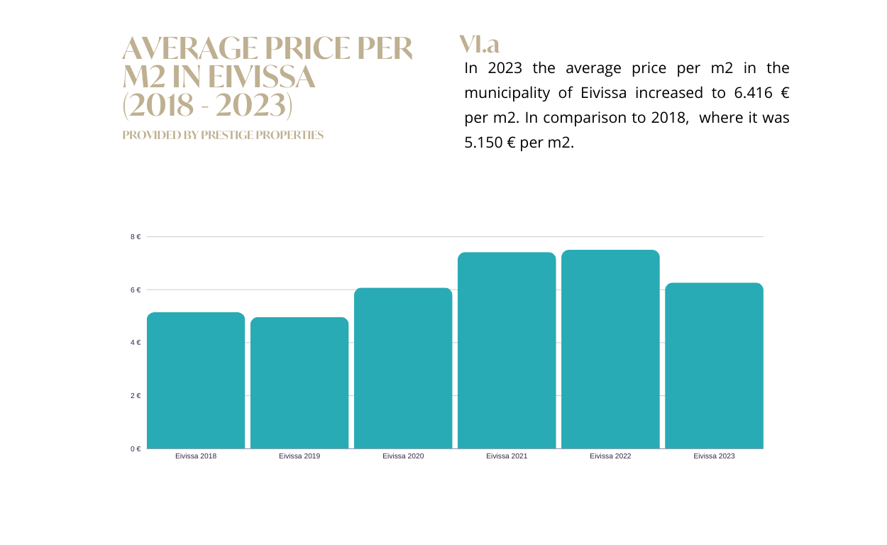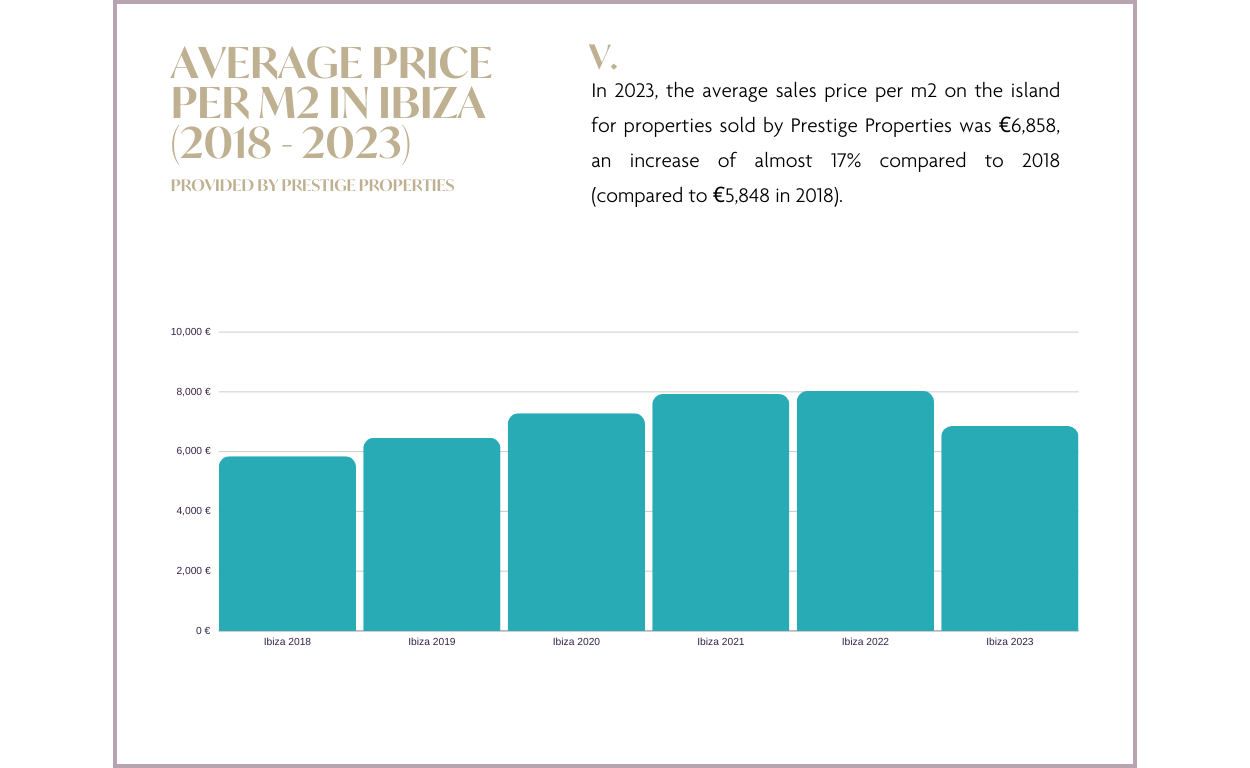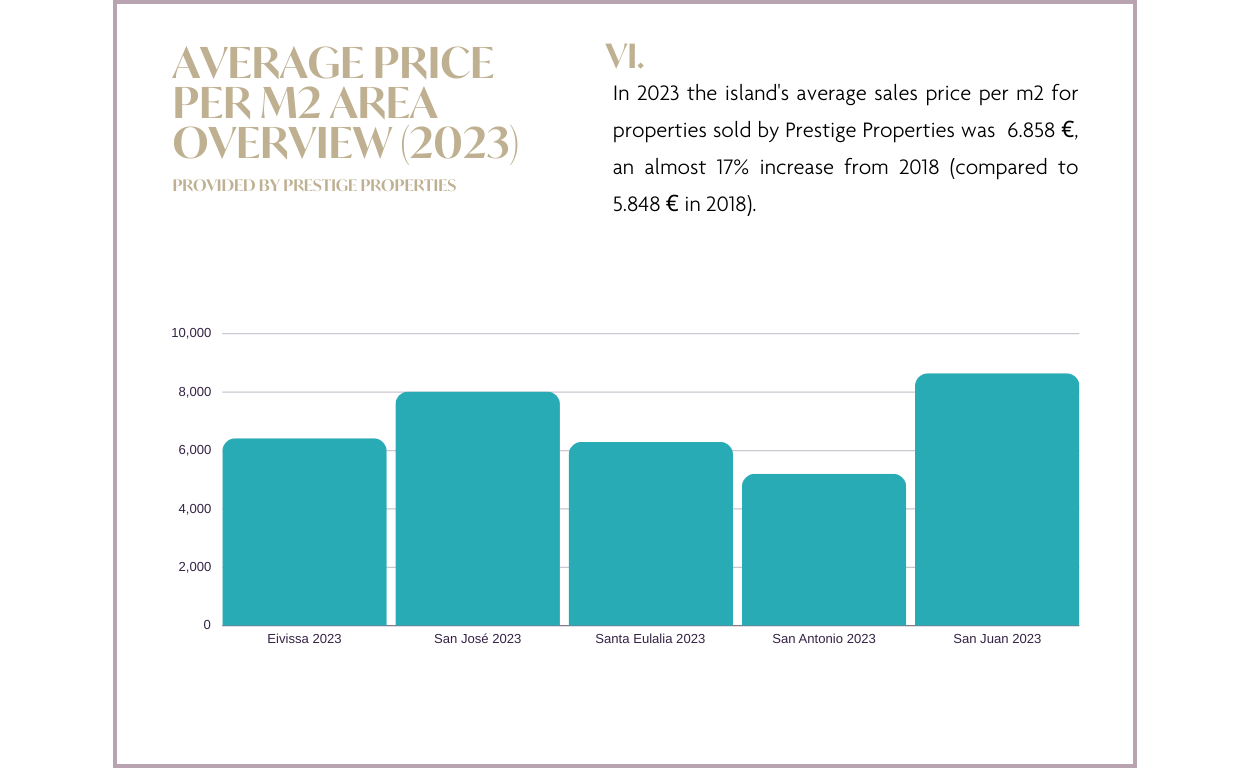 Incluso con un ligero descenso de la demanda, el mercado ha mantenido unas perspectivas equilibradas. Mientras que los precios de venta han mostrado un aumento en todas las Baleares (de acuerdo con los datos proporcionados por Idealista), los precios de venta reales aquí en Prestige Properties Ibiza han demostrado una disminución en comparación con el año anterior, como lo demuestran los precios municipales por metro cuadrado, donde 4 de cada 5 municipios han experimentado una disminución. Esto sugiere un posible ajuste de los precios de venta en el próximo año para alinearse con las tendencias del mercado observadas en 2023. Sin embargo, en general, el sector inmobiliario ibicenco sigue siendo sólido y adaptable. De cara al futuro, echemos un vistazo más de cerca a nuestro informe del mercado inmobiliario de Ibiza para 2023 y a las predicciones para 2024. Tenga en cuenta que este informe utiliza datos internos y externos para presentar información sobre el mercado inmobiliario en Ibiza y las Islas Baleares para 2023, junto con su previsión proyectada para 2024.