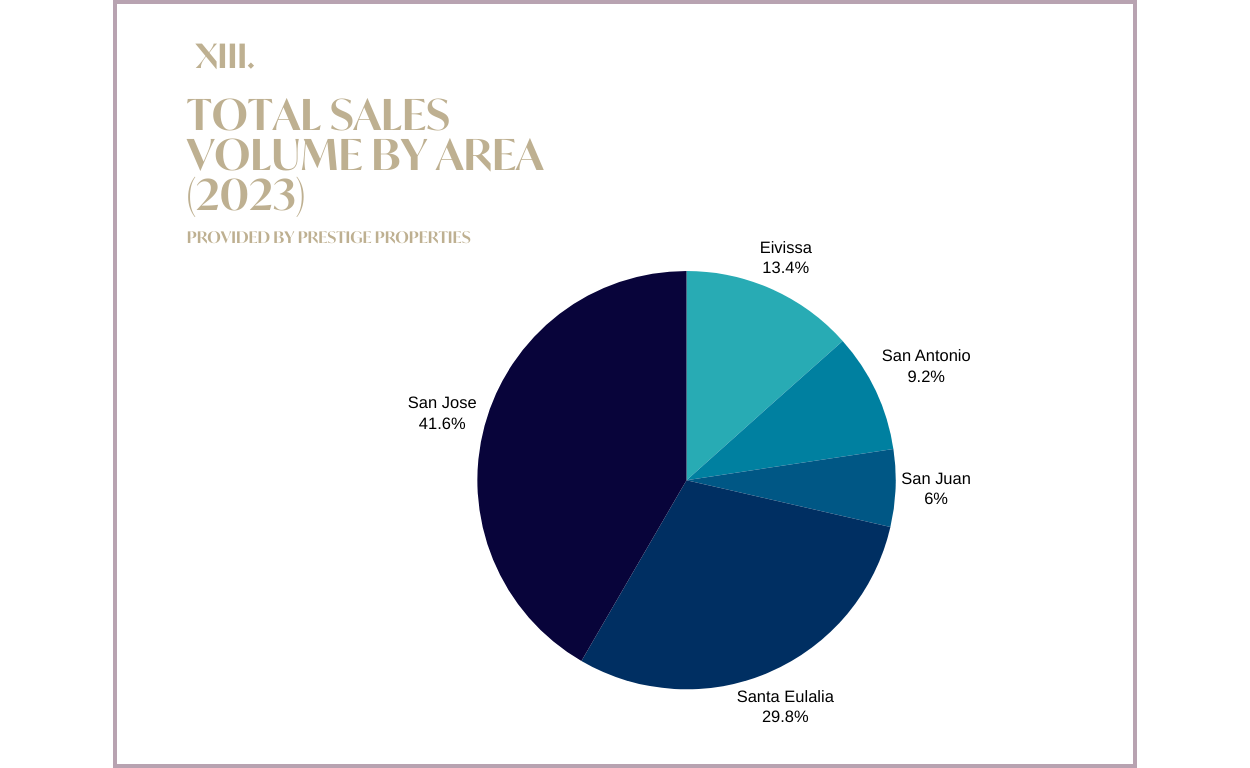 En base al Volumen de Transacciones de Venta, el municipio más vendido en 2023 fue San José, seguido de Santa Eulalia y Eivissa (Ibiza ciudad). Considerando el número real de propiedades vendidas en cada municipio, el orden cambia a San José (31%), Ibiza ciudad (24%), Santa Eulalia (19%), San Antonio (17%) y San Juan (8%).