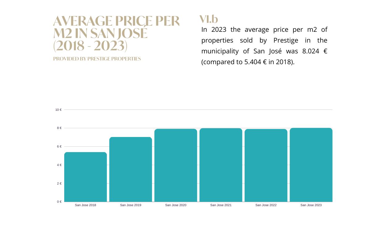 Como en años anteriores, San José es el municipio con mayor interés y volumen de ventas, muy demandado por los compradores de segunda vivienda de lujo. Es uno de los pocos municipios donde el precio medio del metro cuadrado sigue subiendo, incluso ligeramente más que en 2022, con una media de 8023,74 euros por metro cuadrado. Esta zona representa el 41,62% del volumen de ventas de Prestige Properties en 2023. Además, cuenta con la mayor mezcla de propiedades vendidas de la isla. Destacan los apartamentos, las casas y las villas modernas.