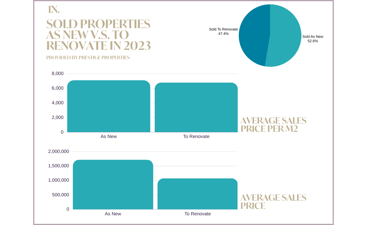 En 2023, Prestige Properties vendió más inmuebles nuevos que los destinados a renovación. Naturalmente, las propiedades renovadas suelen tener un precio medio de venta más bajo; sin embargo, la diferencia por metro cuadrado entre propiedades nuevas y renovadas es modesta.