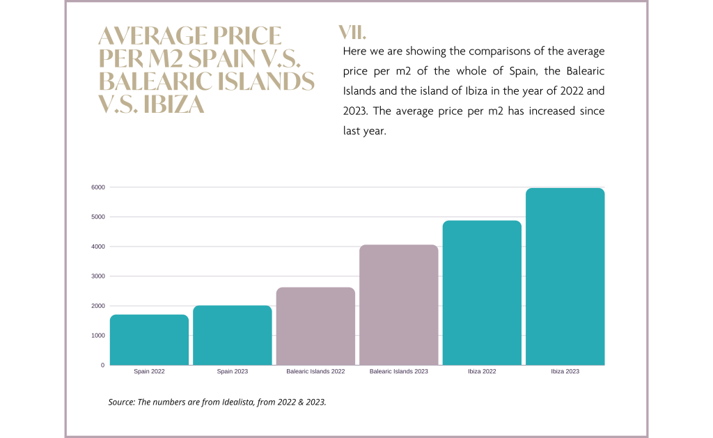 También podemos ver que la tendencia continúa, y el precio medio por metro cuadrado de Ibiza sigue siendo más alto que el precio global por metro cuadrado de las Islas Baleares o de la península española…. Además, la oferta inmobiliaria está aumentando gradualmente de nuevo, dejando la impresión de que el mercado podría pasar de un mercado de compradores a un mercado de vendedores en el futuro.