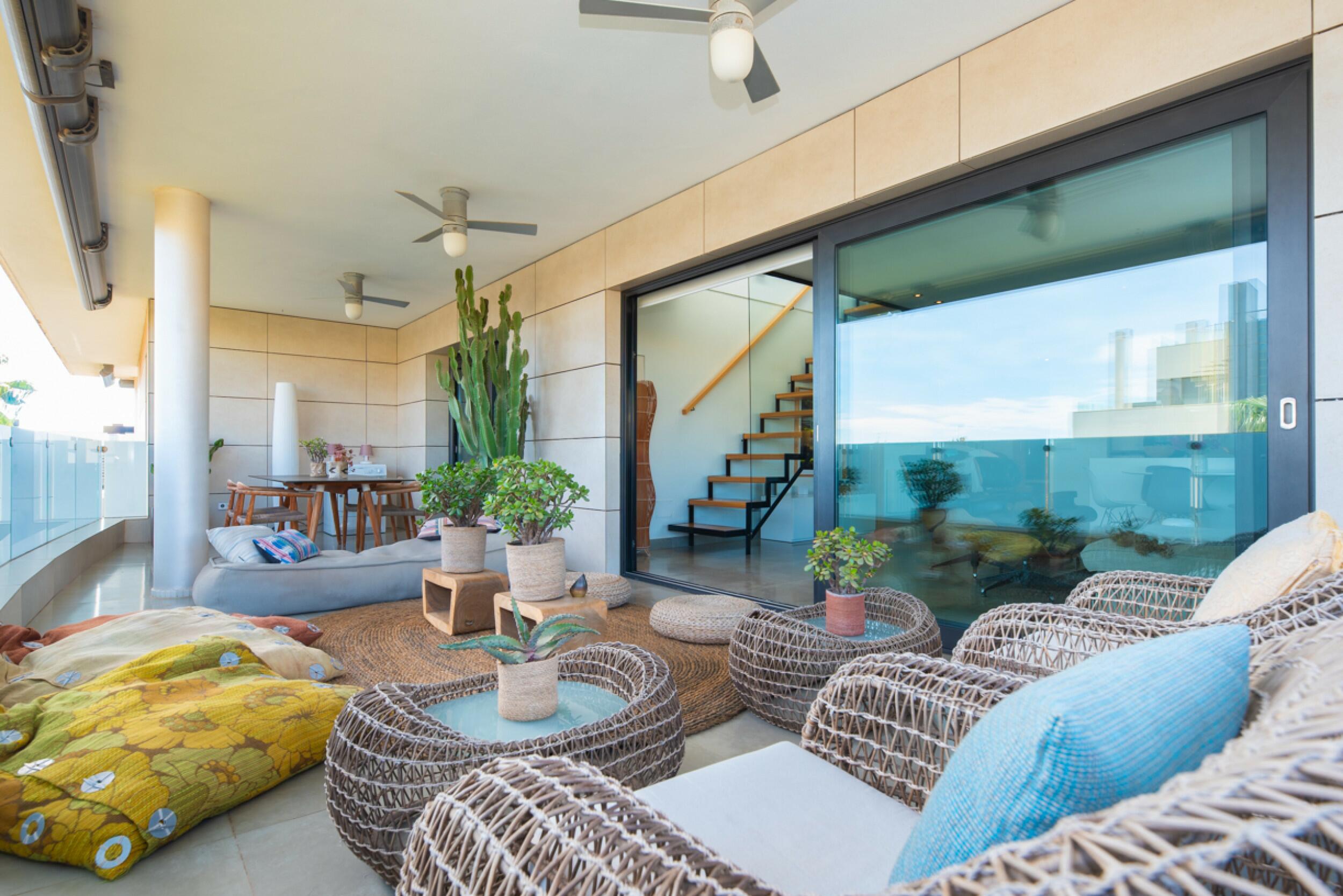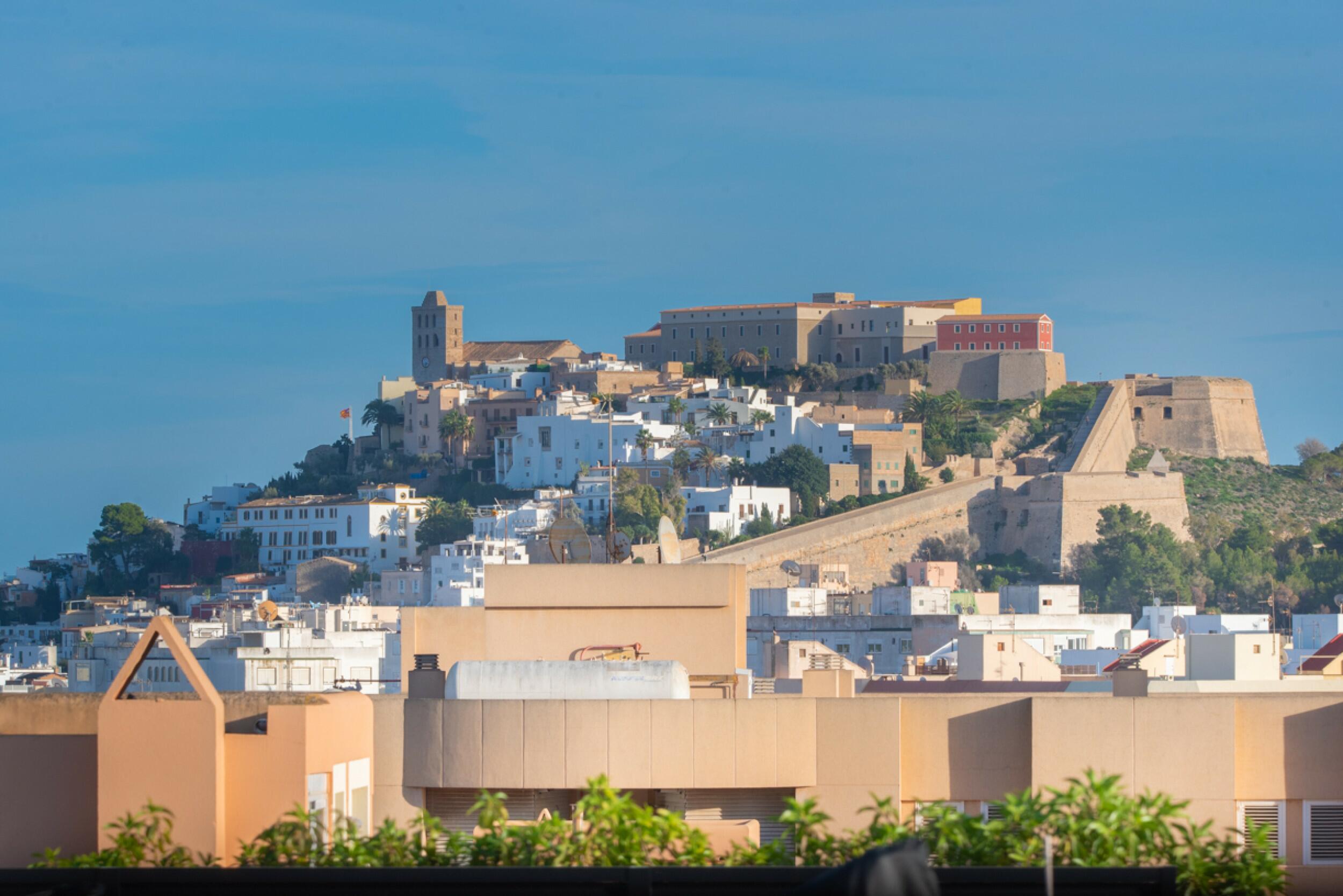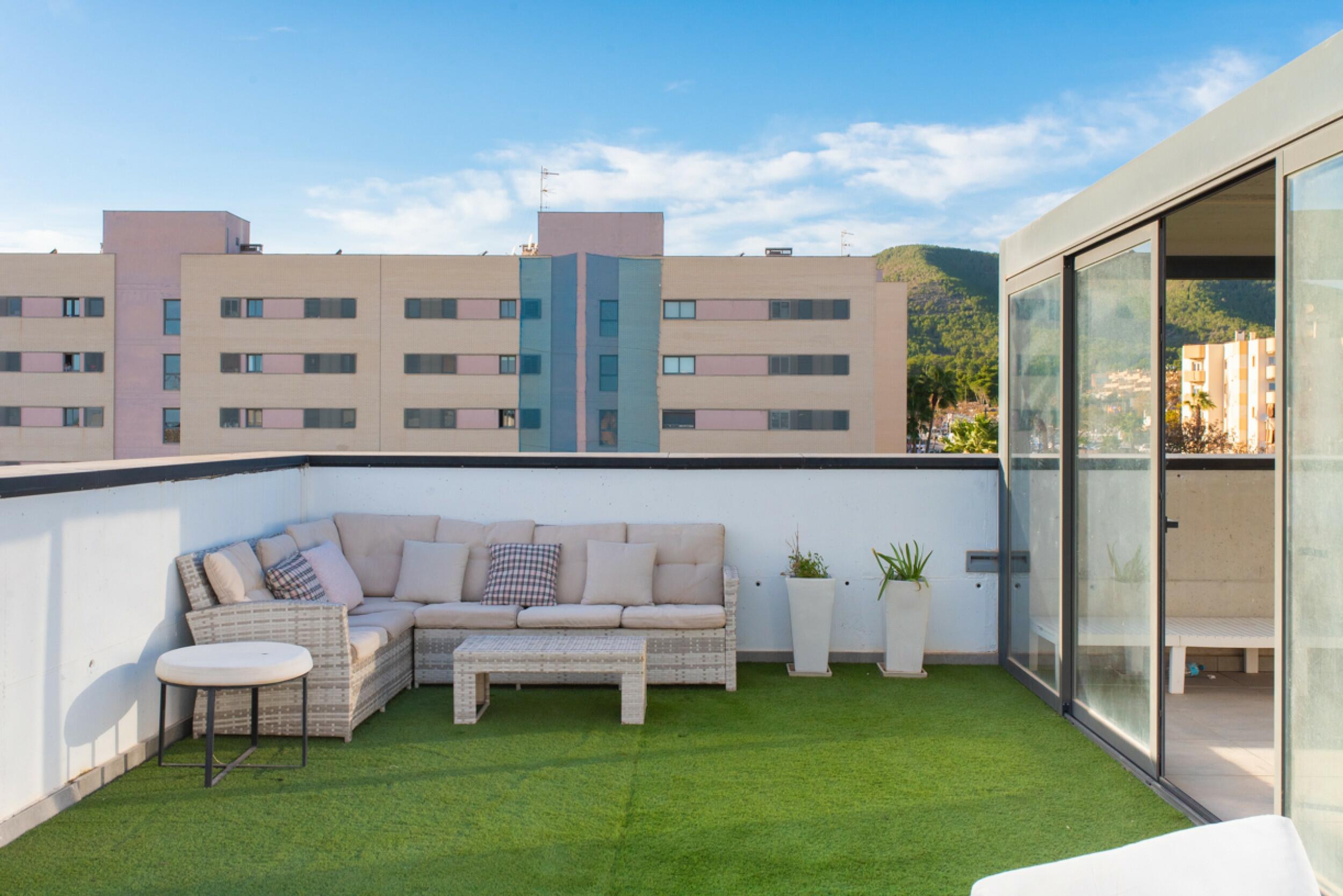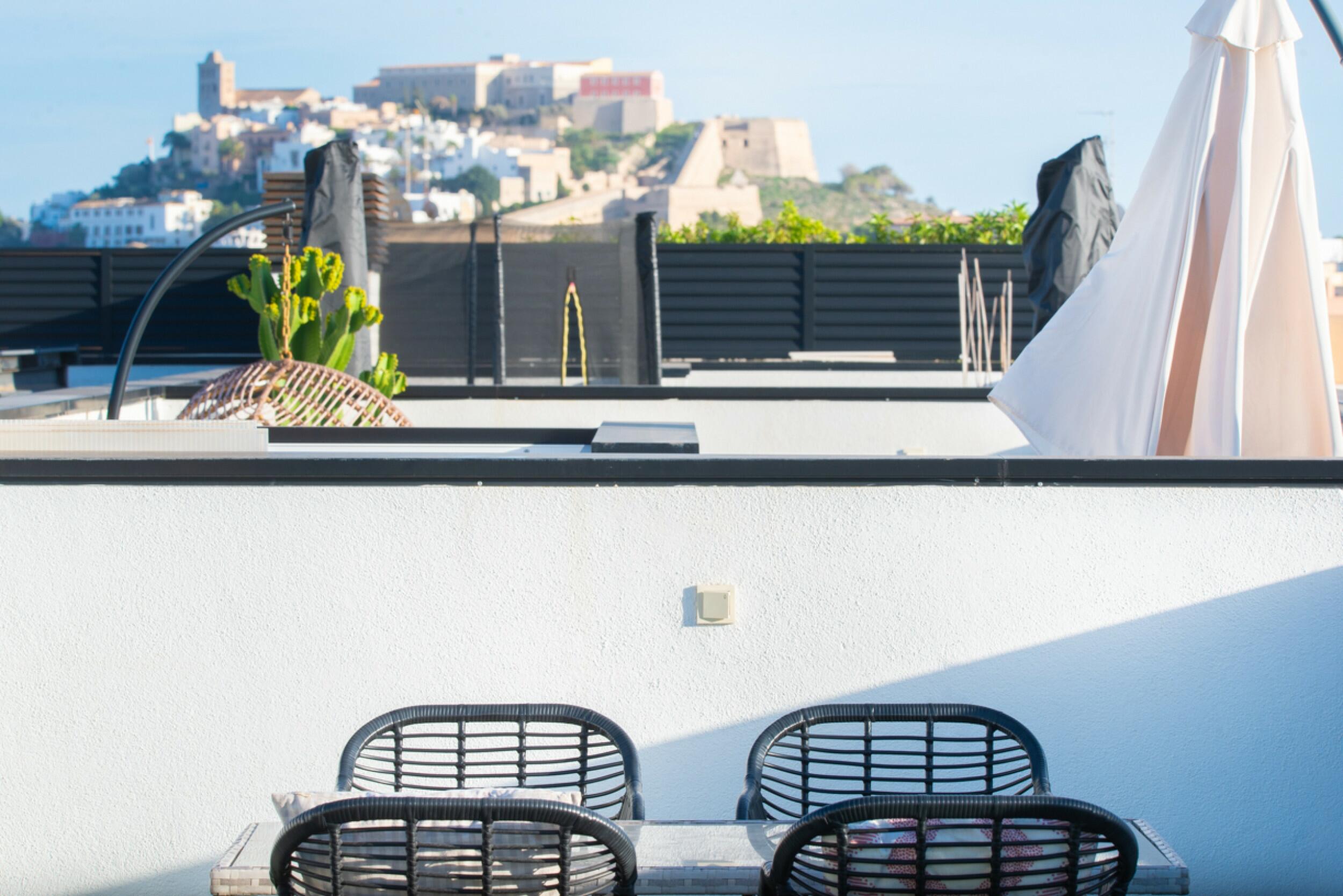 El balcón de la sala de estar conduce a la azotea privada, un espacio exclusivo que ofrece impresionantes vistas de Dalt Vila. Esta azotea cuenta con una zona cubierta, un comedor al aire libre y un relajante espacio chill-out, ideal para disfrutar de la vida al aire libre.